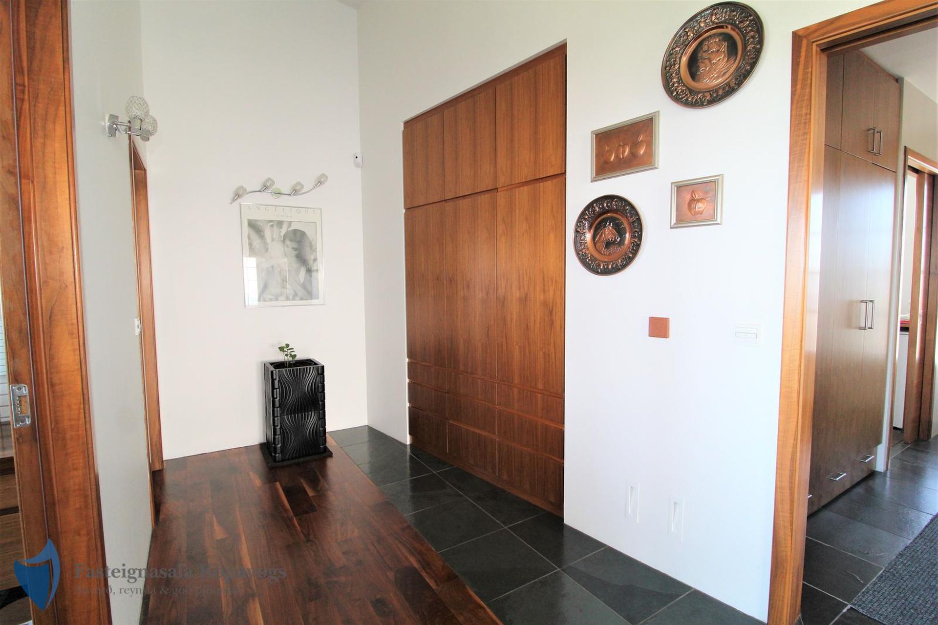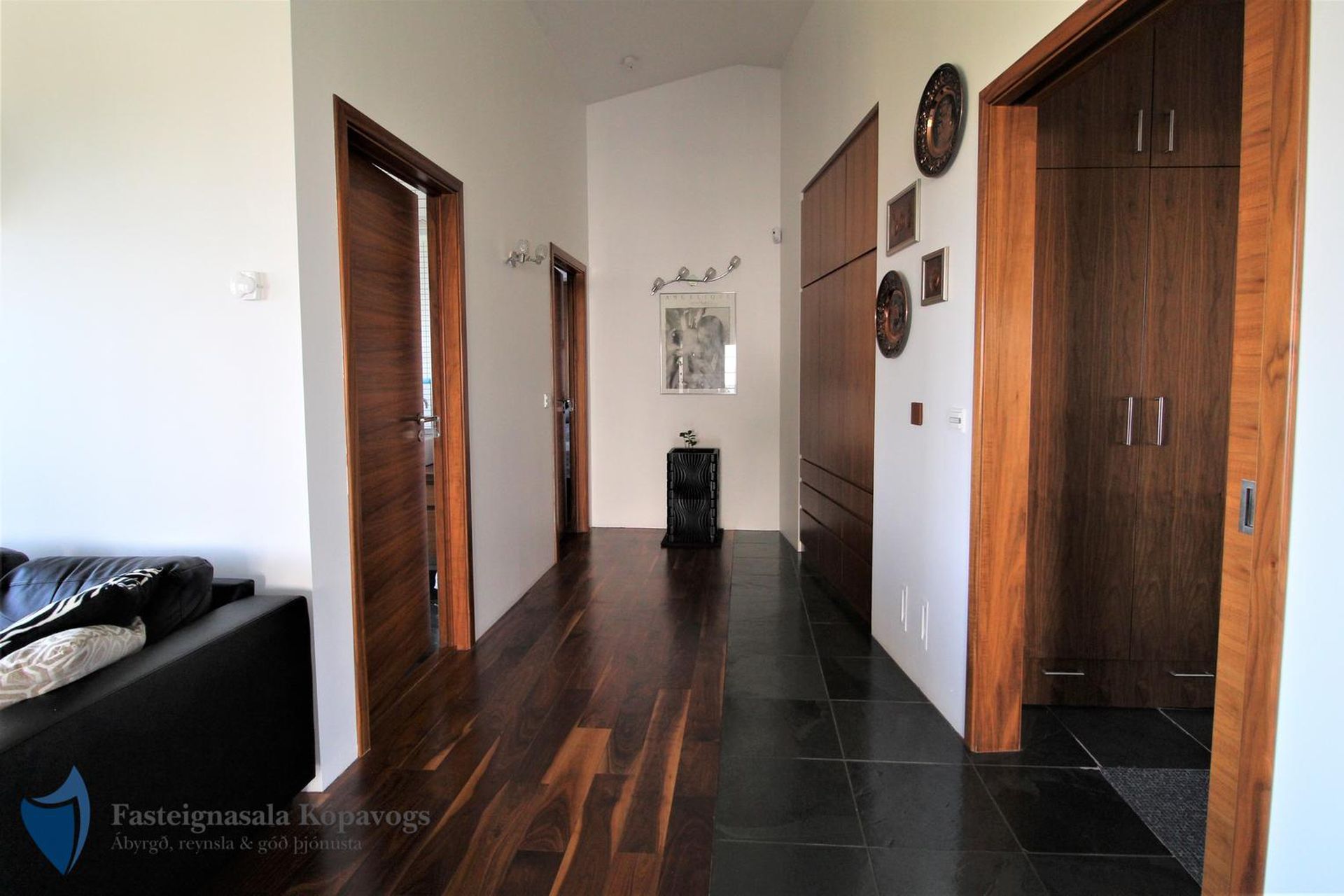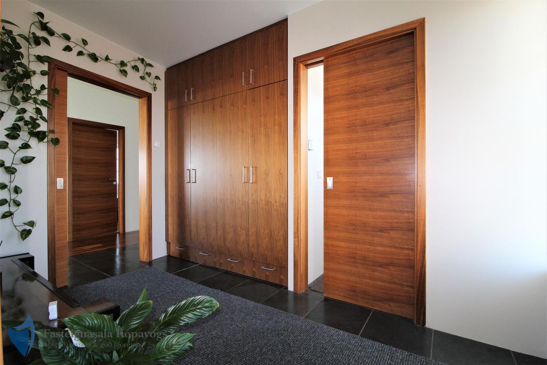 Hnotuparket, flísalög gólf, sérsmíðaðar innréttingar með spónlagðri hnotu.