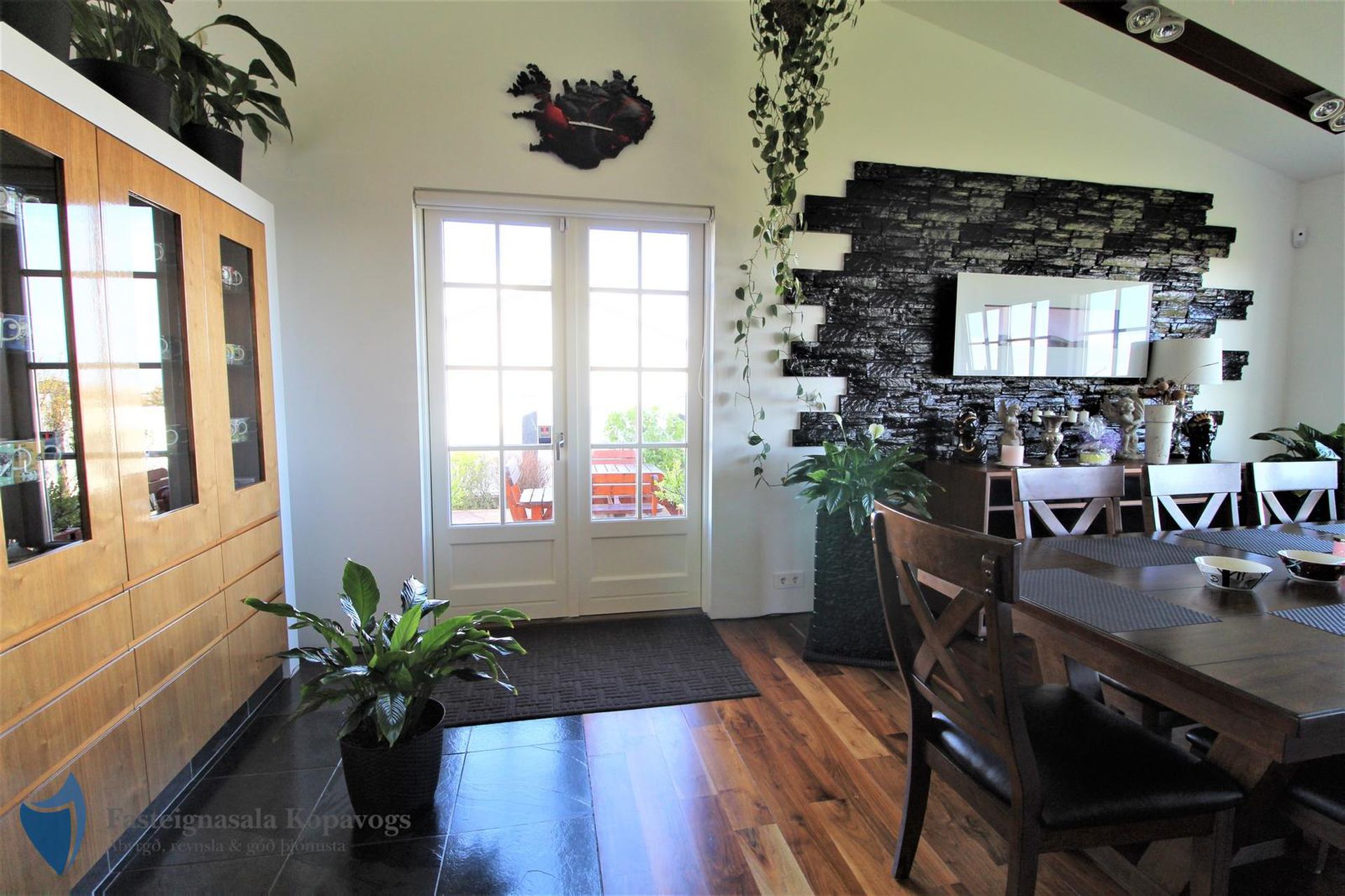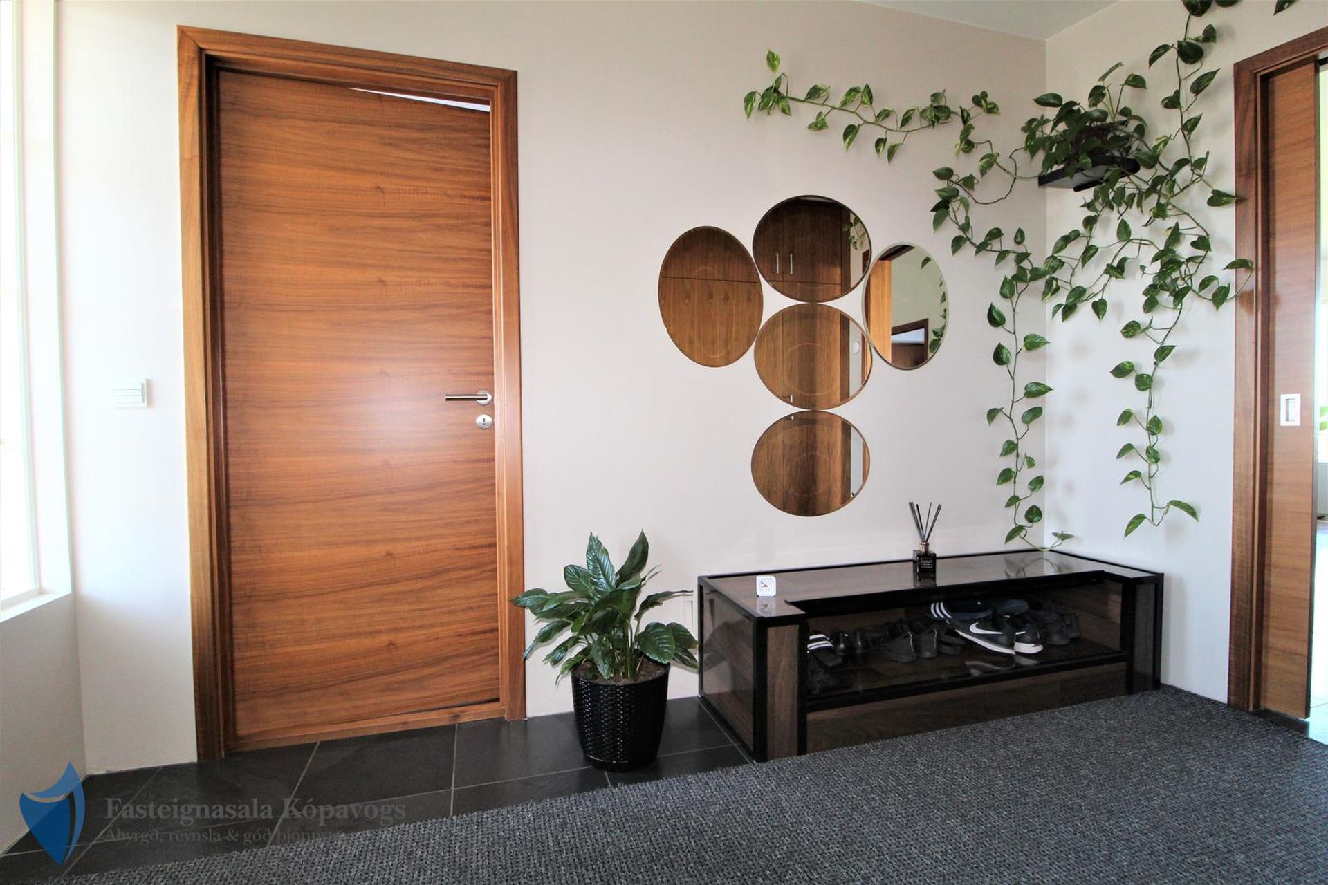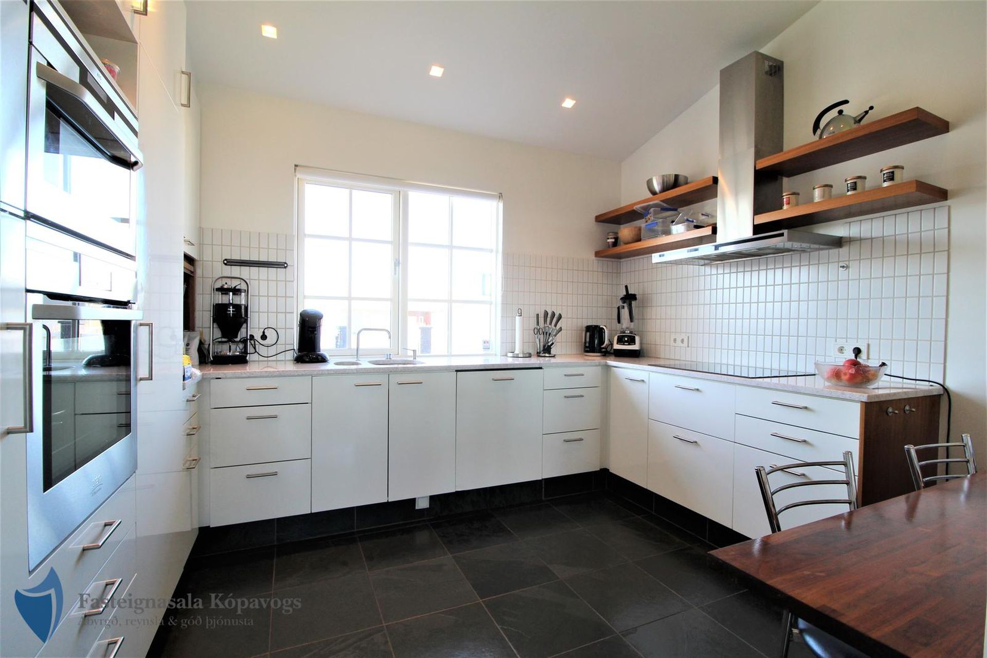 Hnotuparket, flísalög gólf, sérsmíðaðar innréttingar með spónlagðri hnotu.
