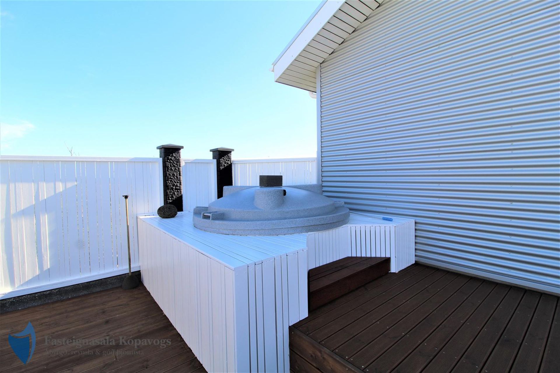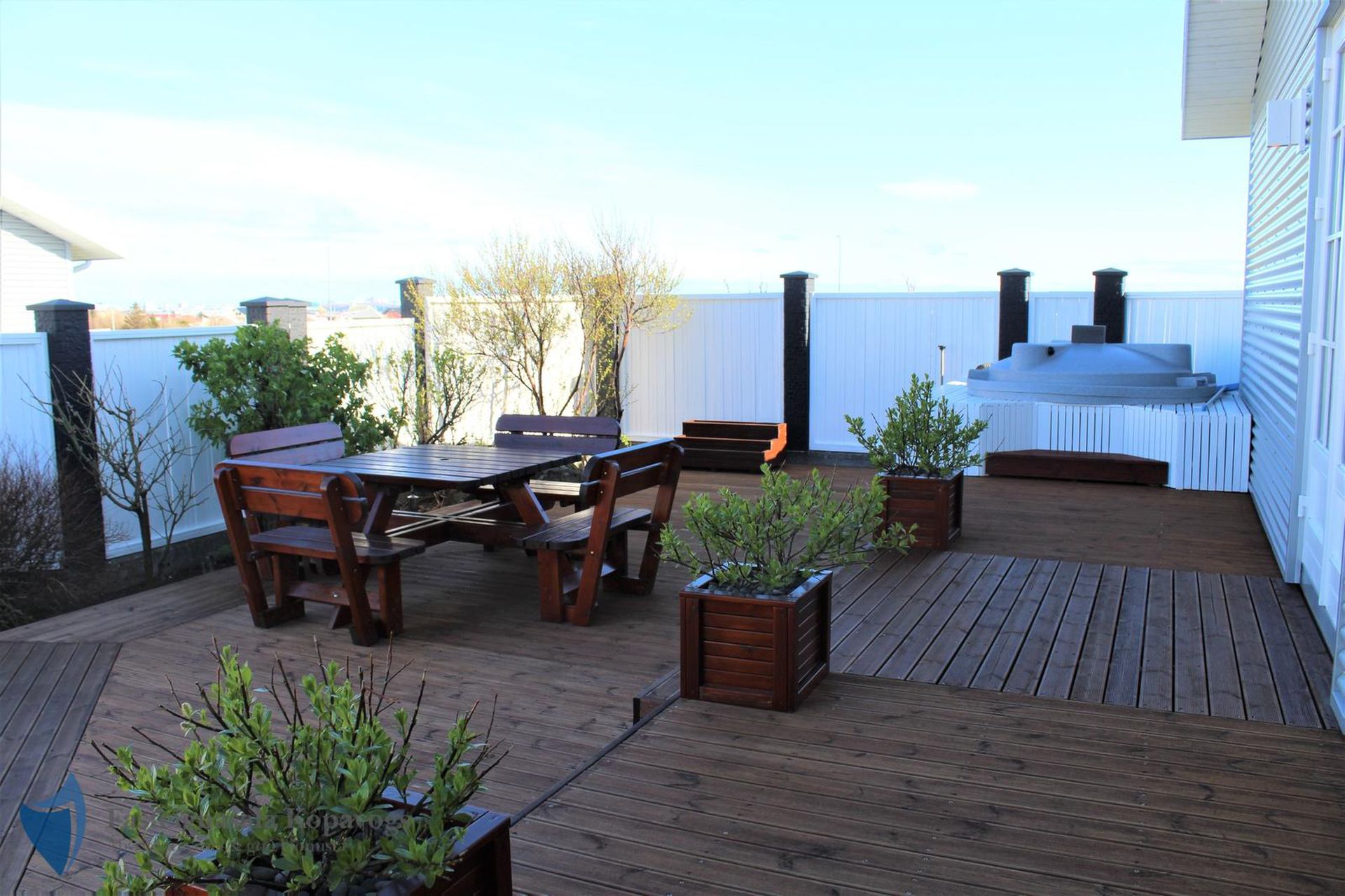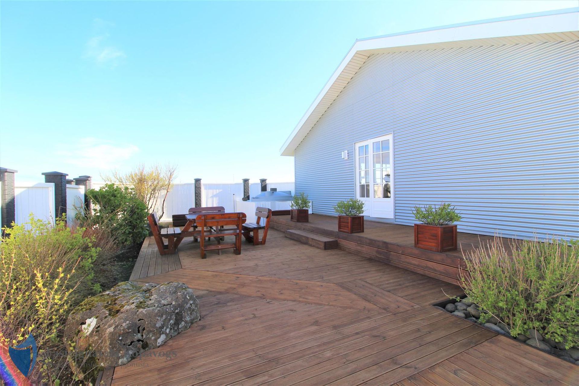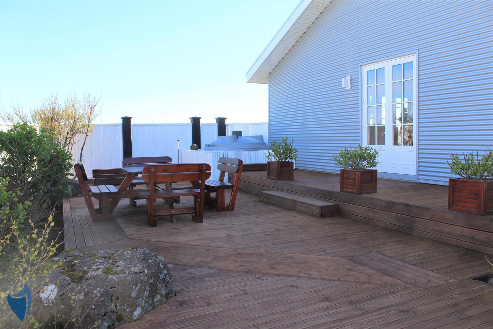 Timburverönd með heitum potti frá Trefjum.