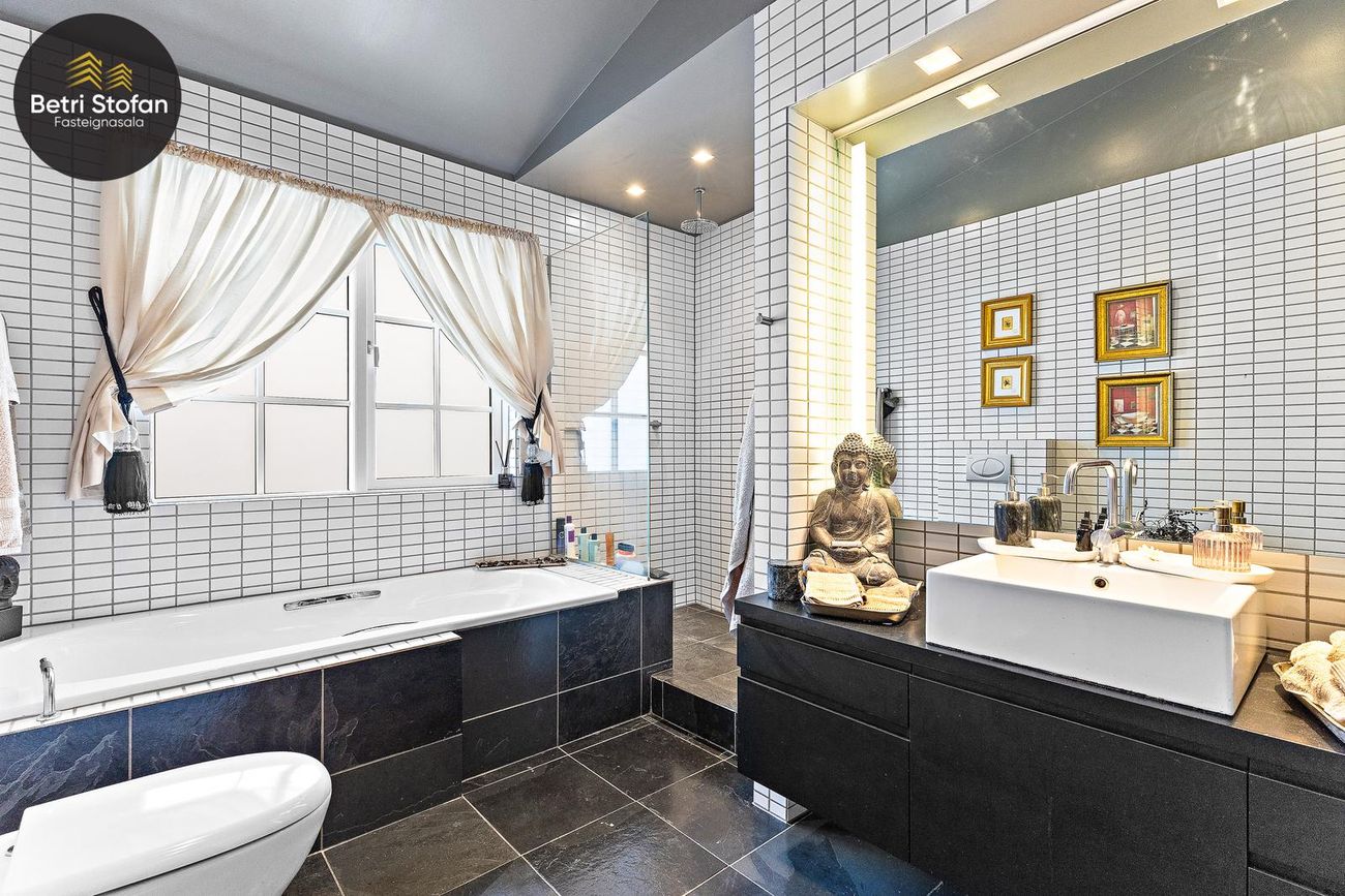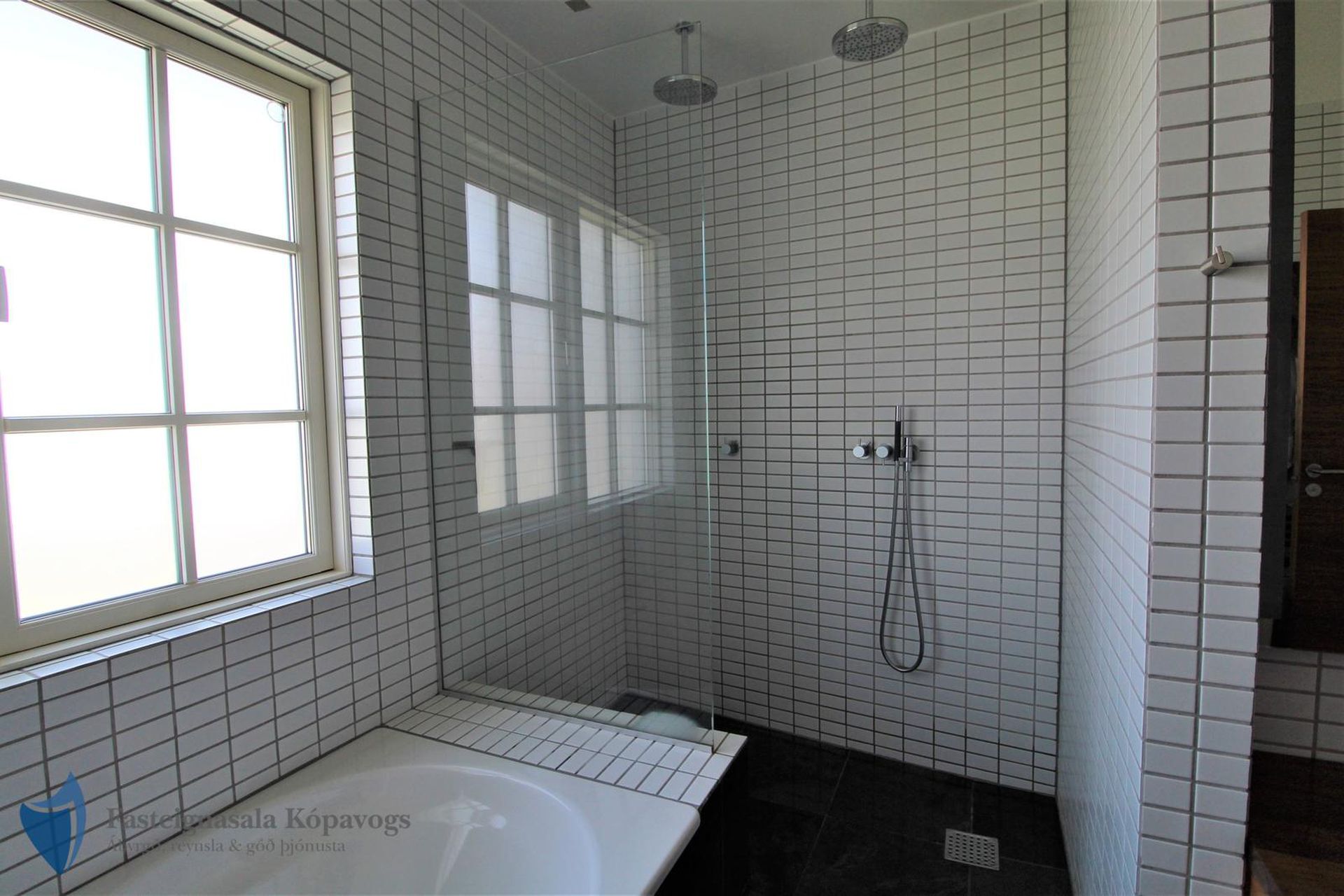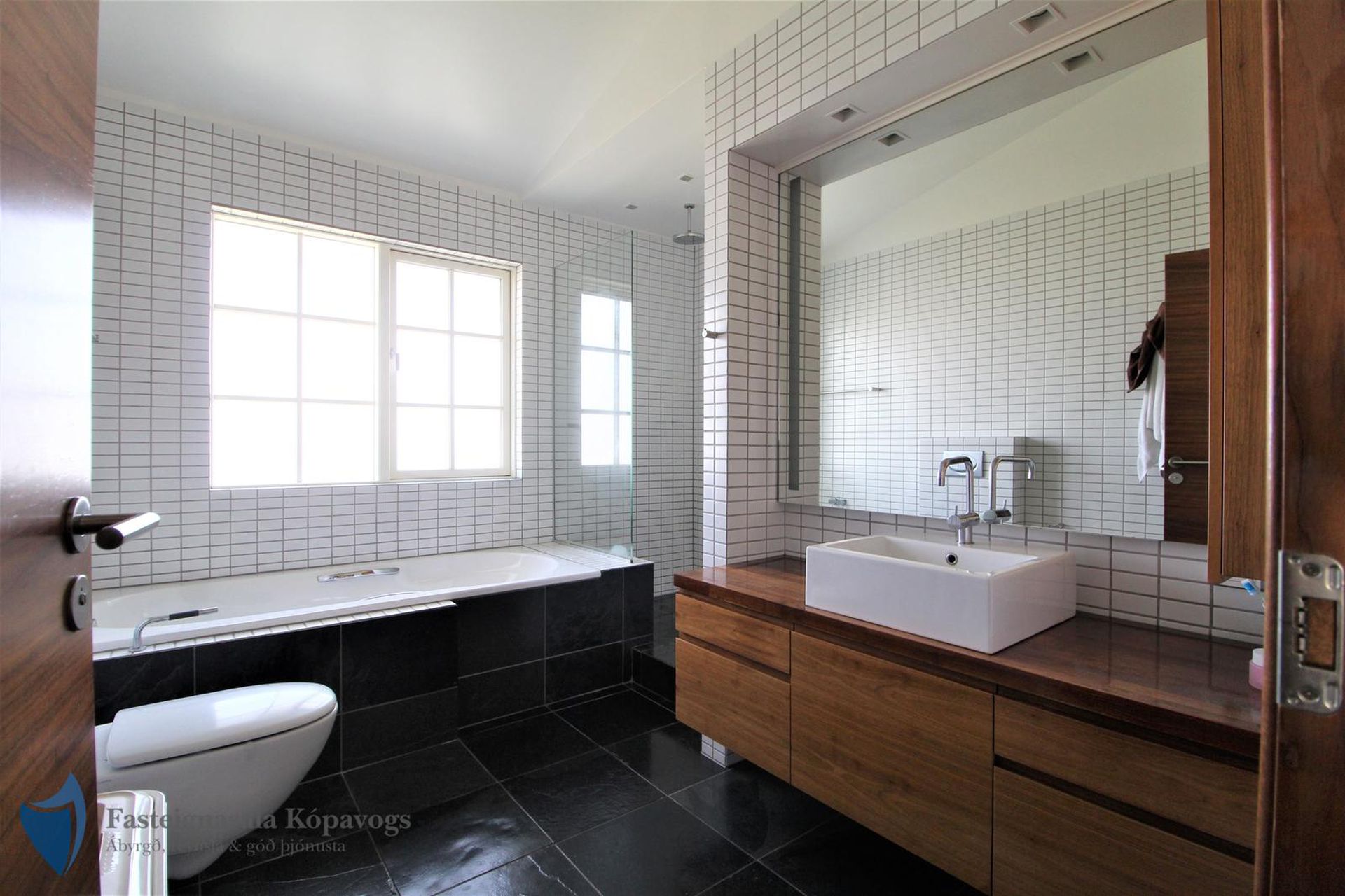 Rúmgott baðherbergi með flísalögum gólfi og veggjum, baðkari og stórum sturtuklefa með tveimur sturtuhausum. Innréttingar hannaðar af Arne Jakobssen.