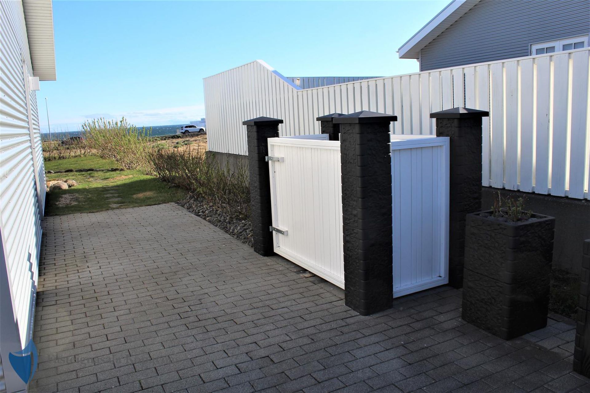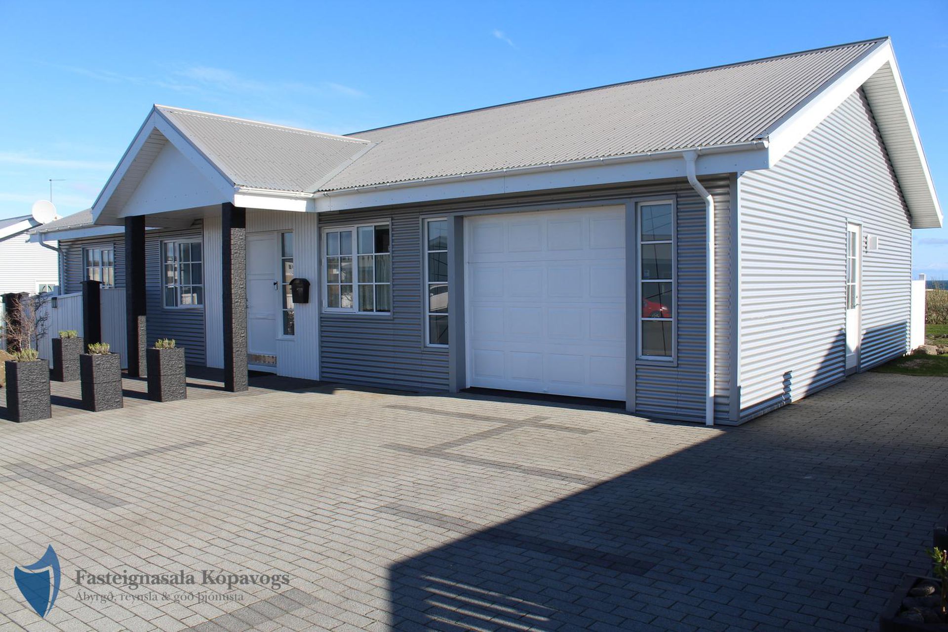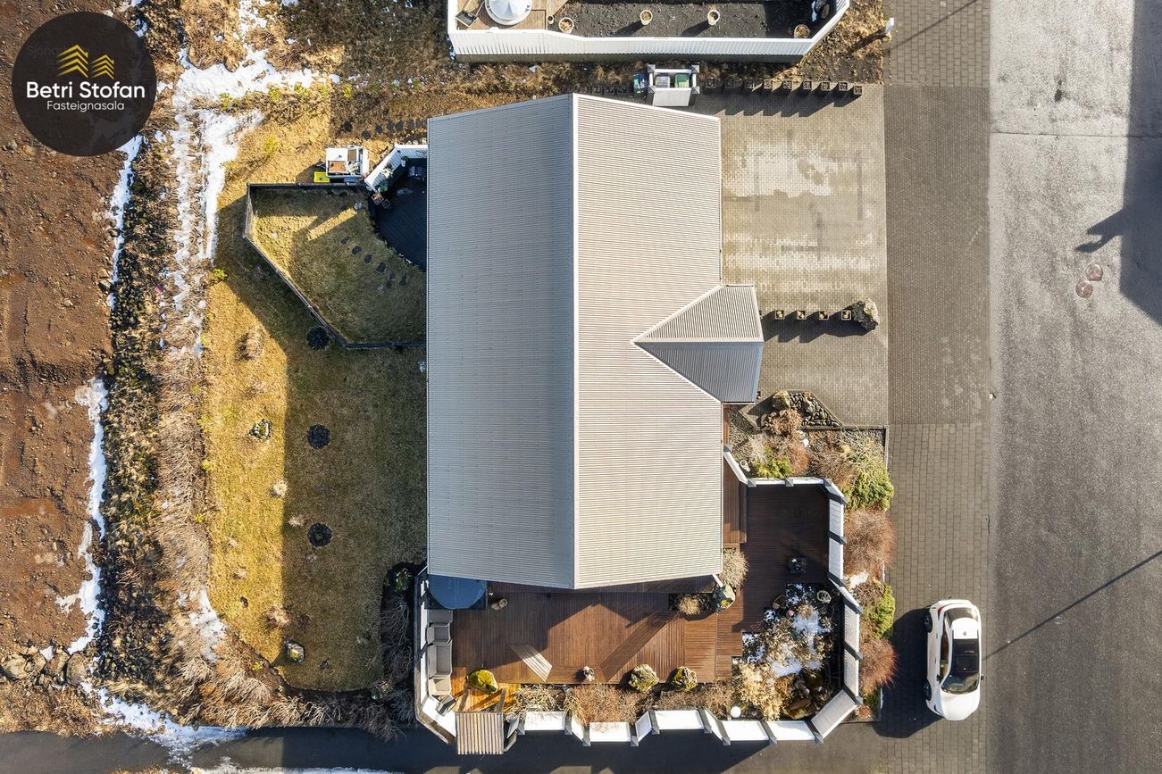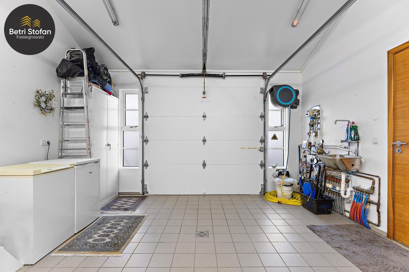 26m² bílskúr með sjálfvirkum hurðaopnara, gluggum með opnanlegu fagi, flísalögum gólfi og rafhleðslu. Gönguhurð í bakgarð.