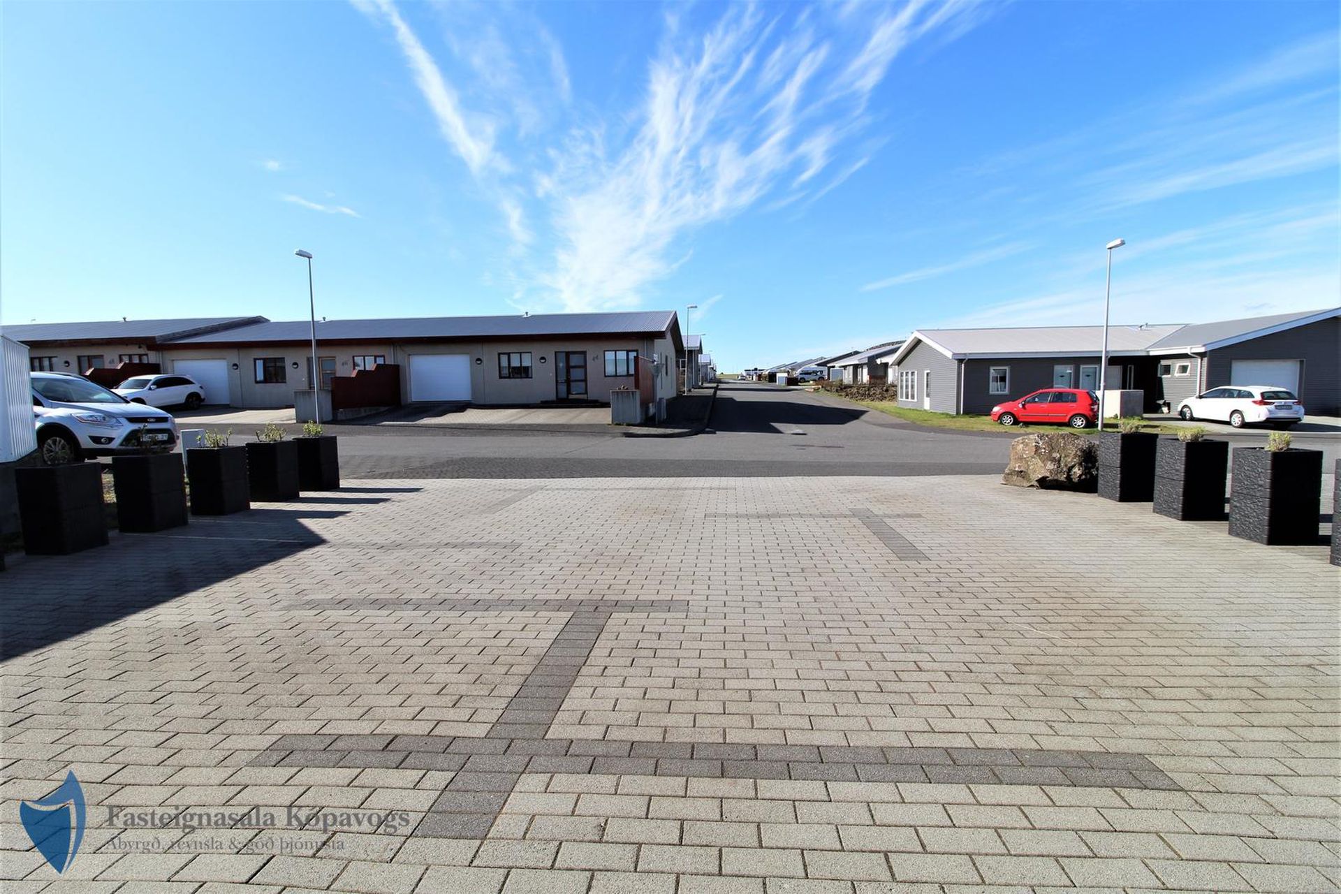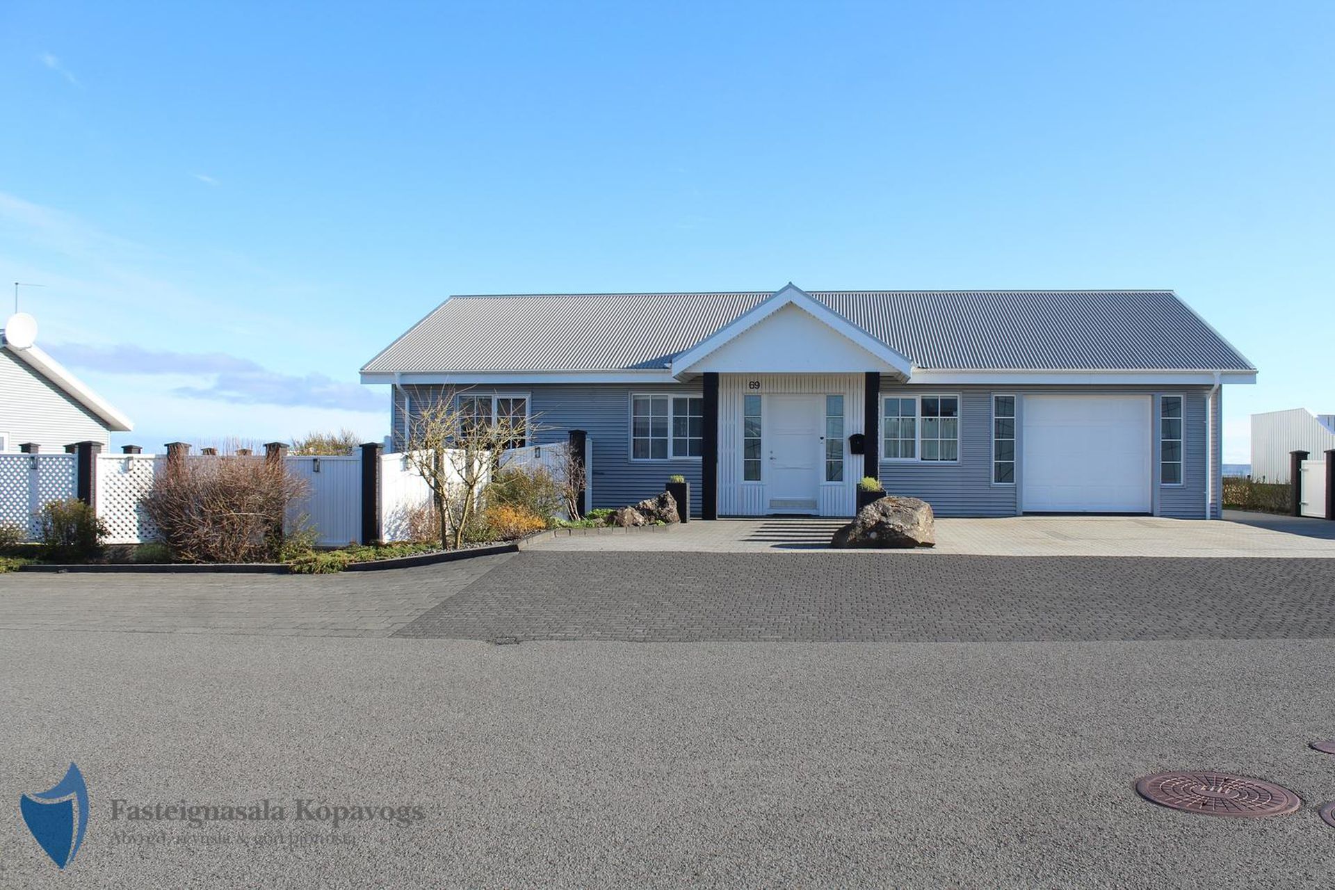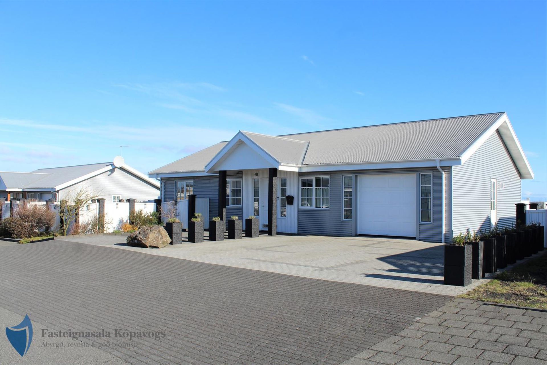 26m² bílskúr með sjálfvirkum hurðaopnara, gluggum með opnanlegu fagi, flísalögum gólfi og rafhleðslu. Gönguhurð í bakgarð.