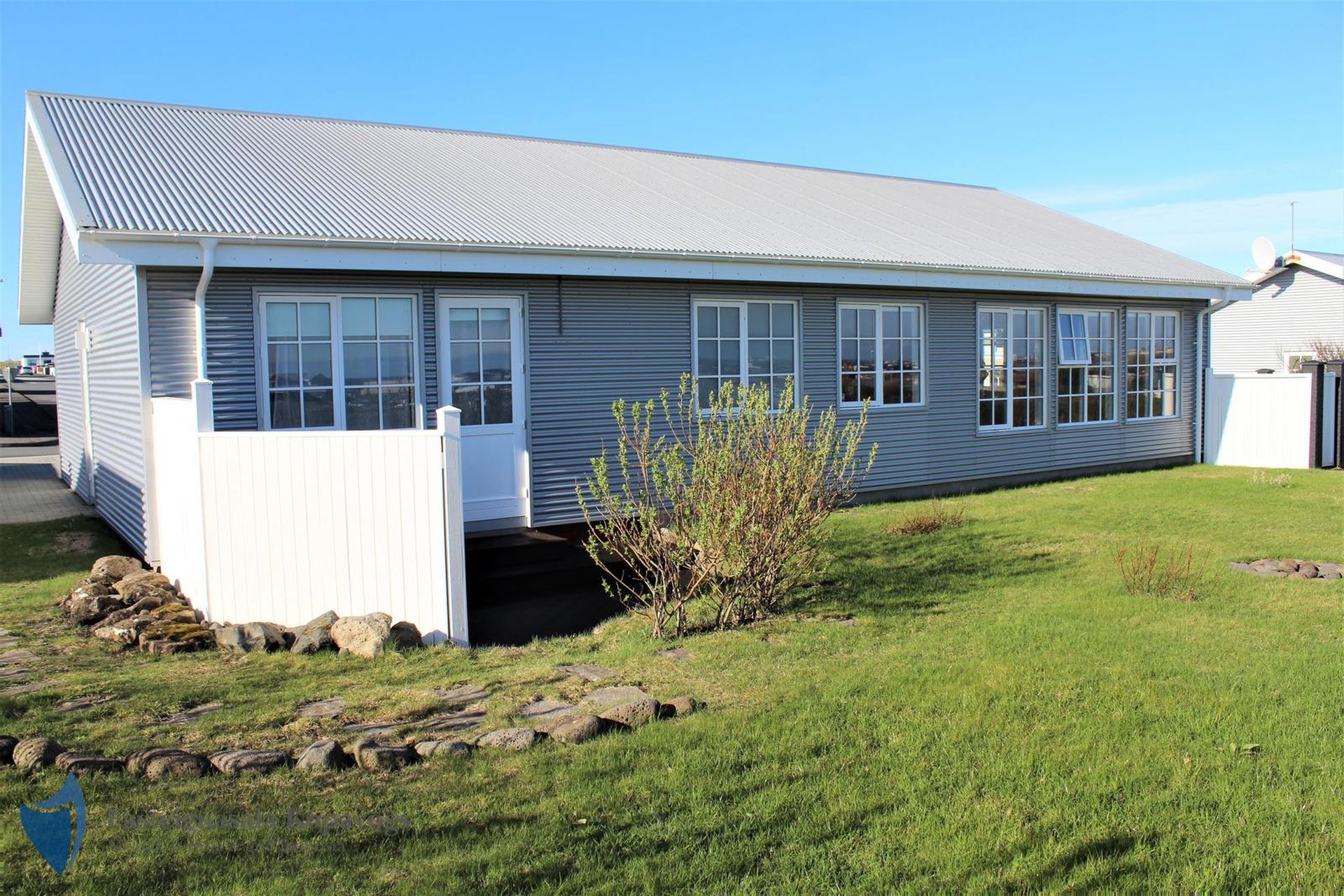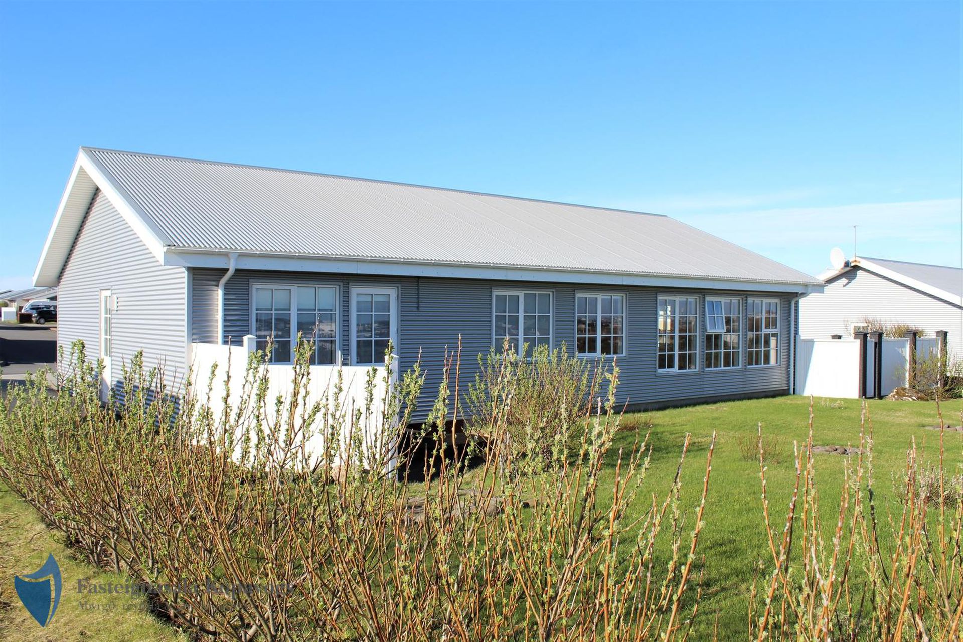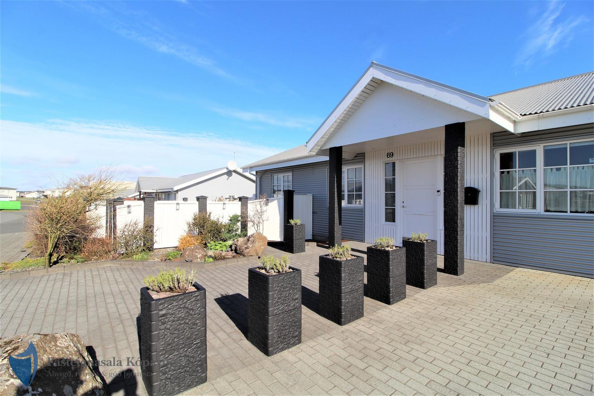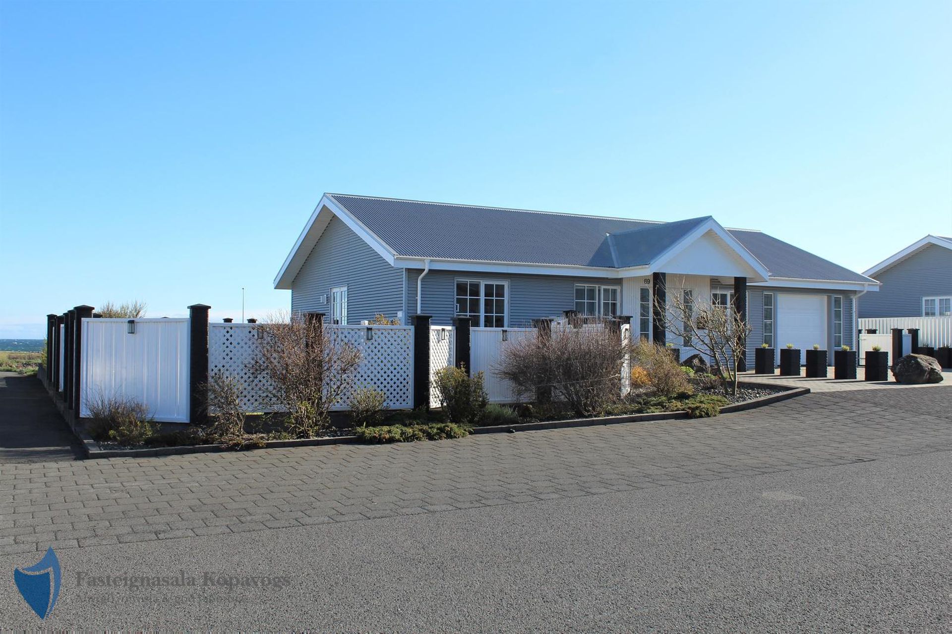 26m² bílskúr með sjálfvirkum hurðaopnara, gluggum með opnanlegu fagi, flísalögum gólfi og rafhleðslu. Gönguhurð í bakgarð.