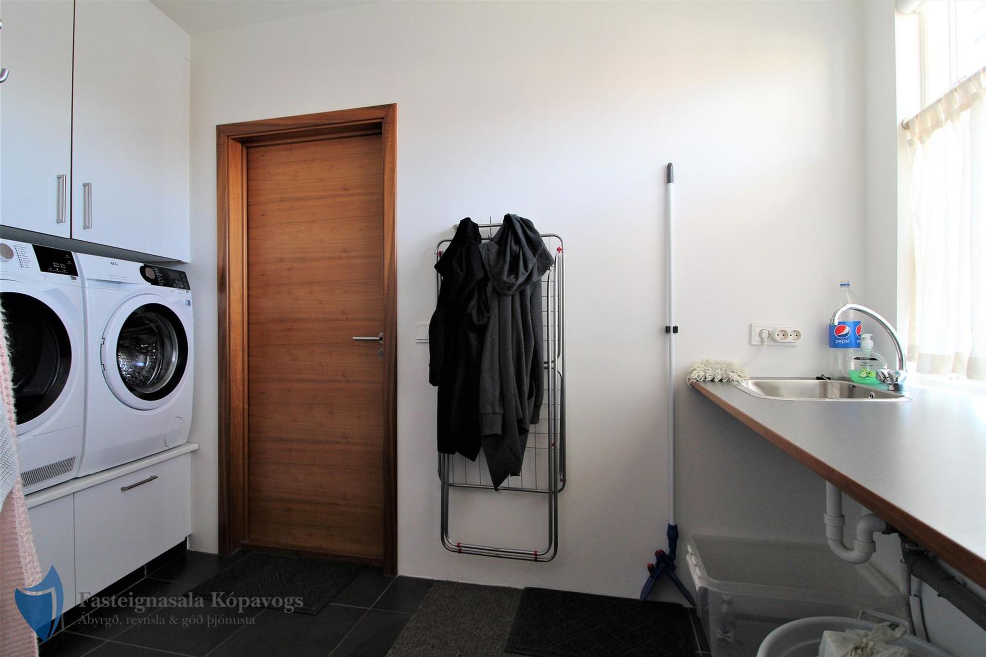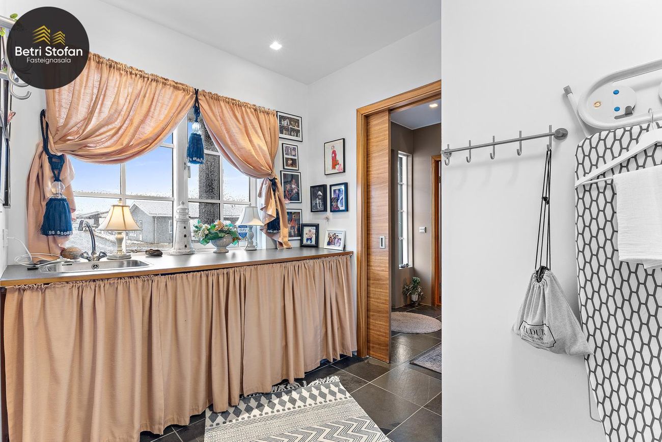 Þvottahús með innréttingu og góðu vinnuplássi. Tengt bílskúr.