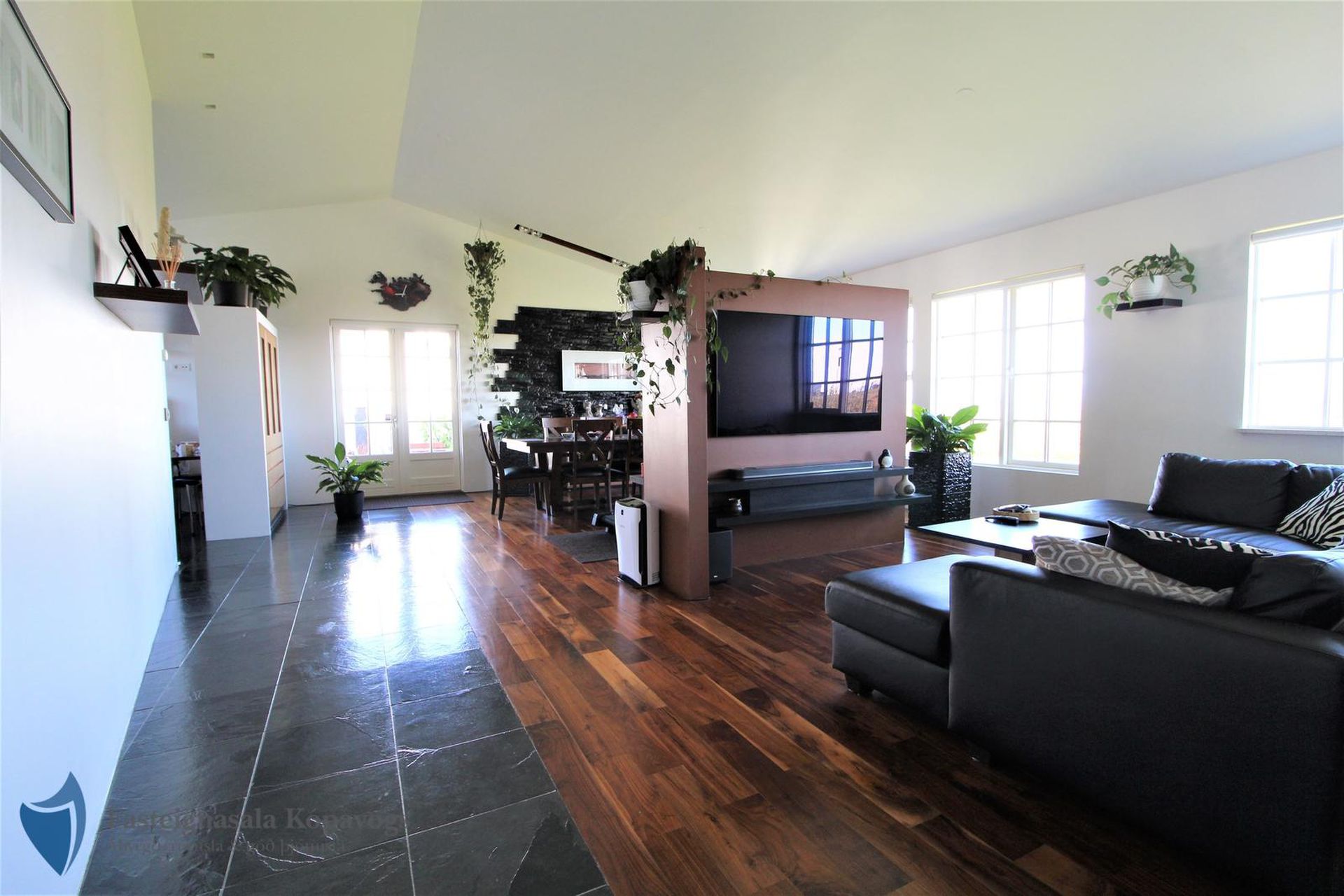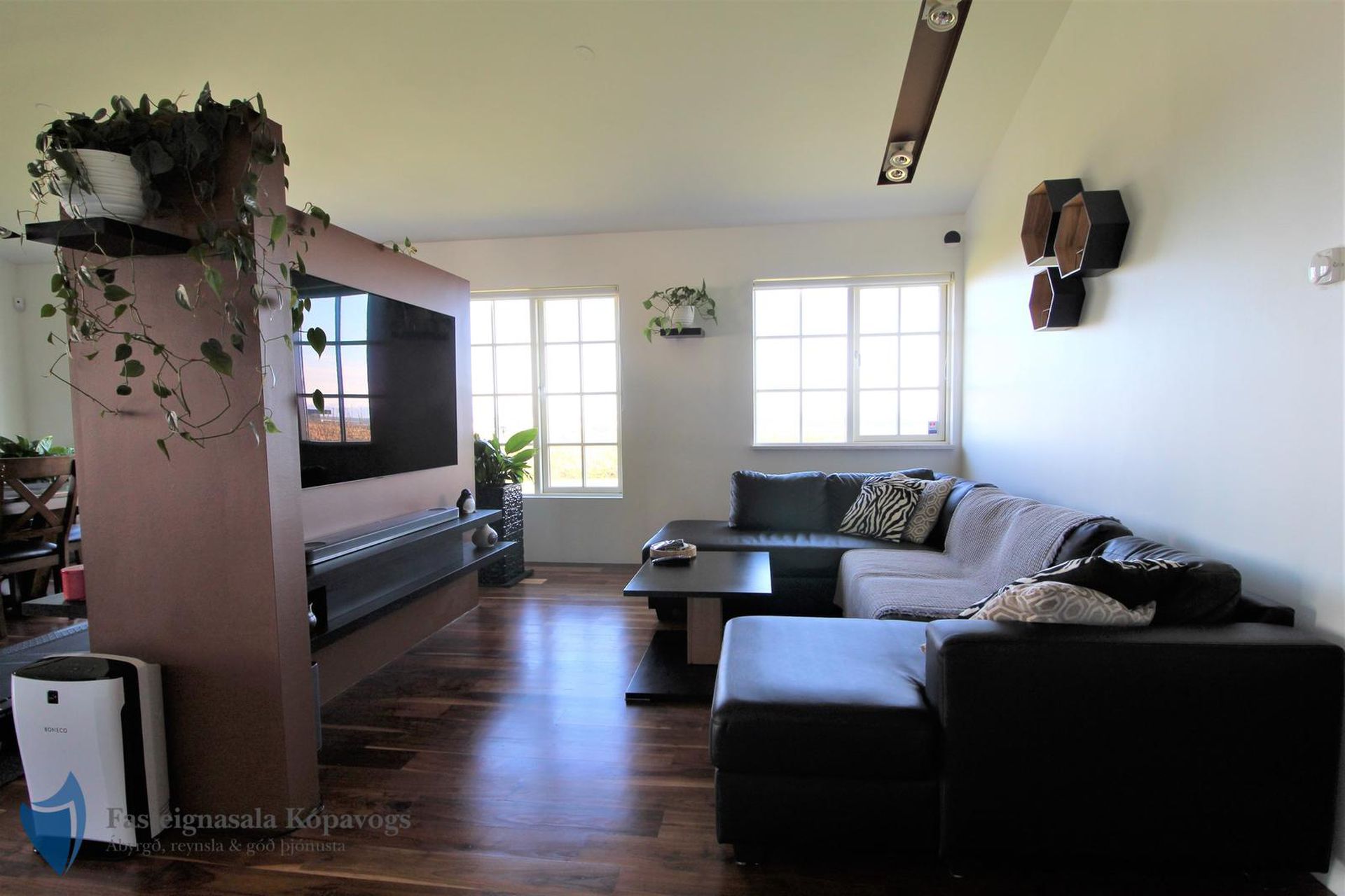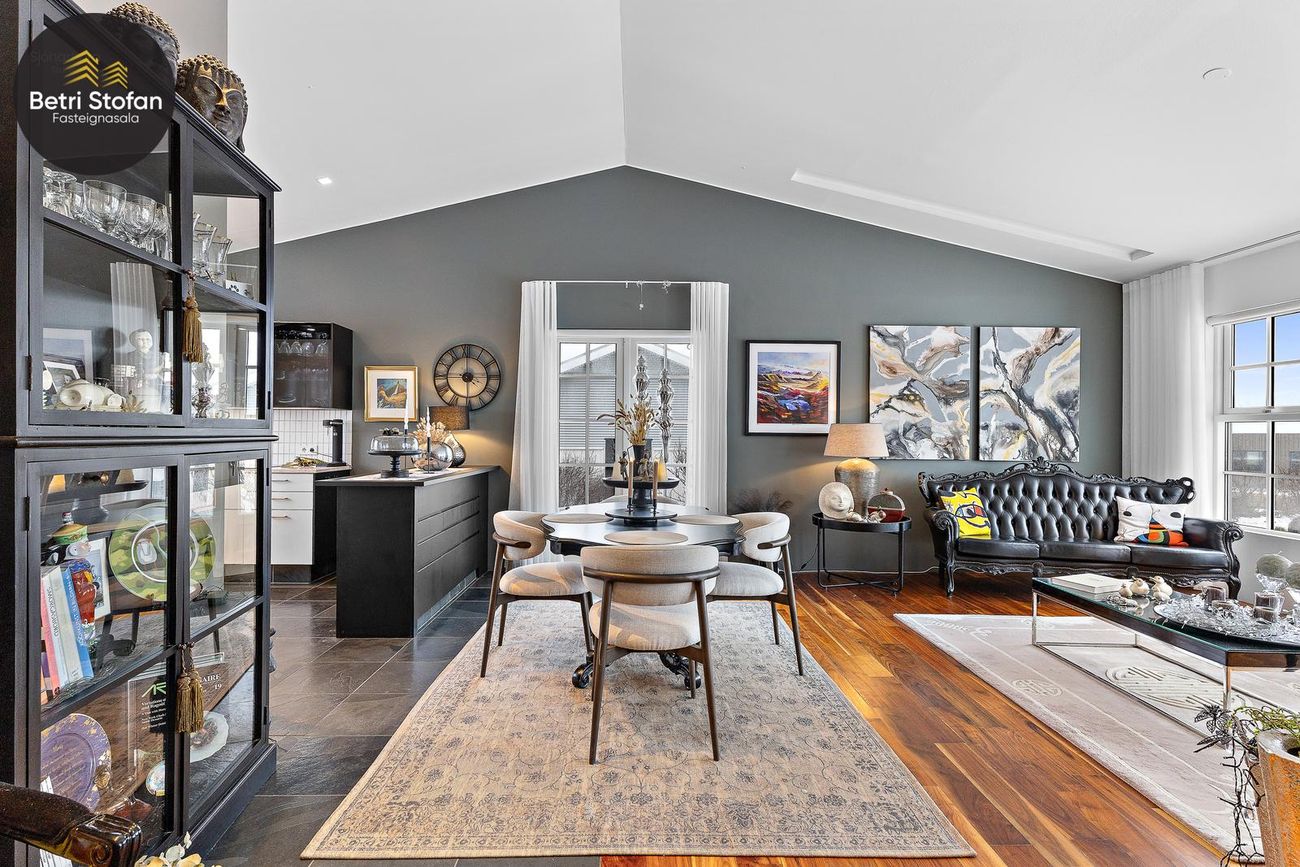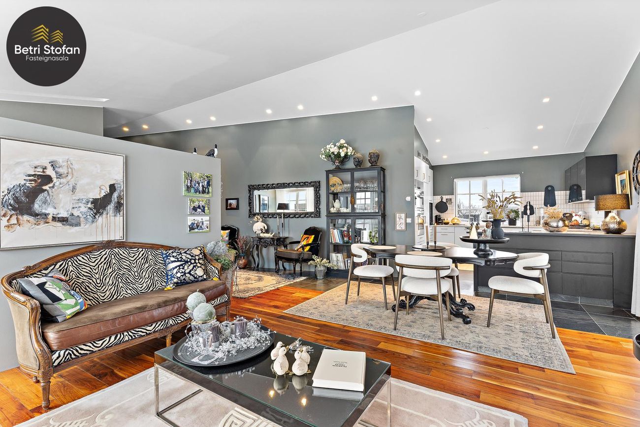 Opið bjart rými með stofu, borðstofu og sjónvarpsherbergi. Fallegt hnotuparket á gólfi og halogen lýsing.