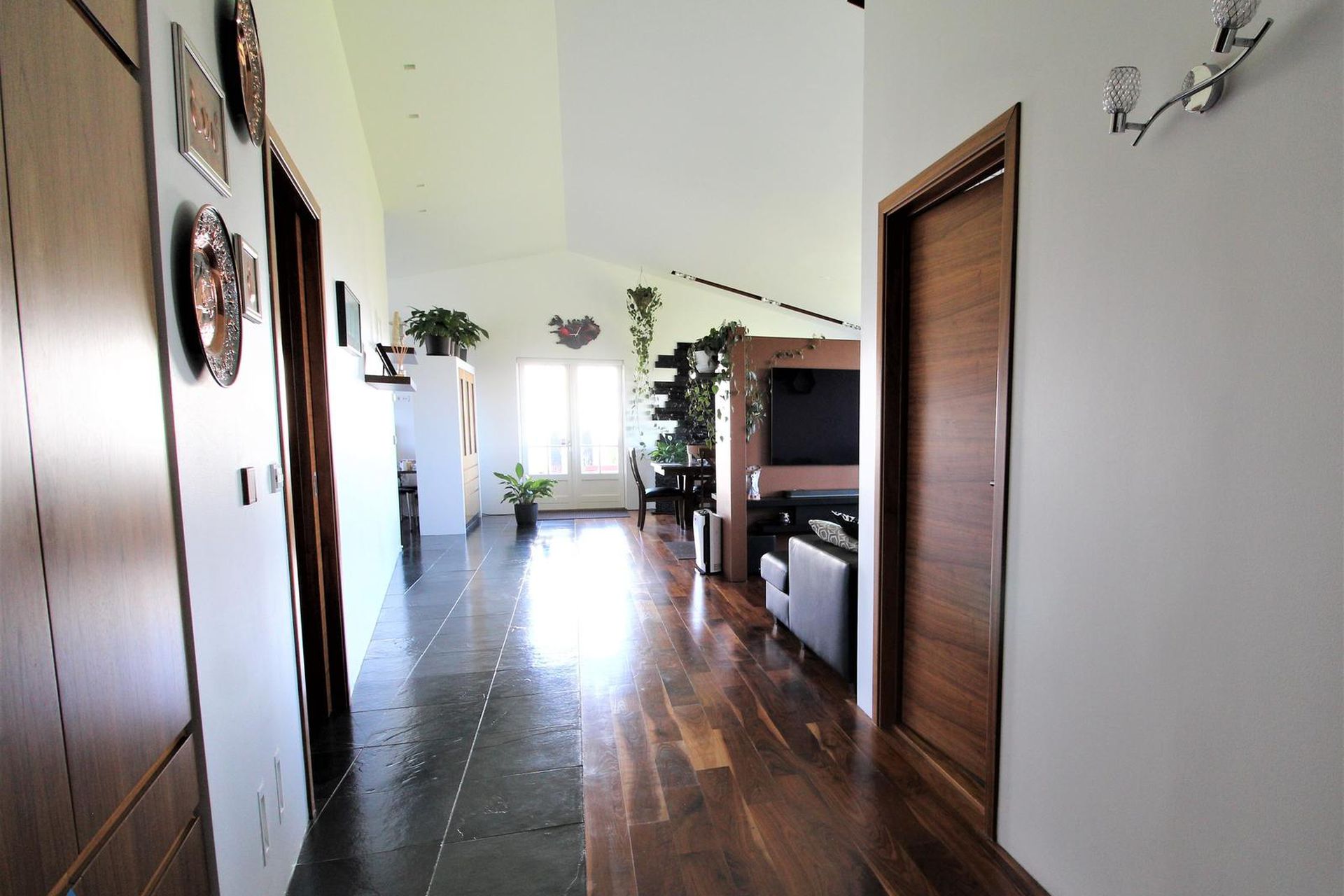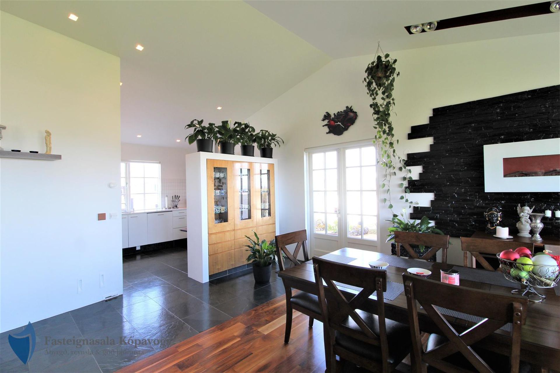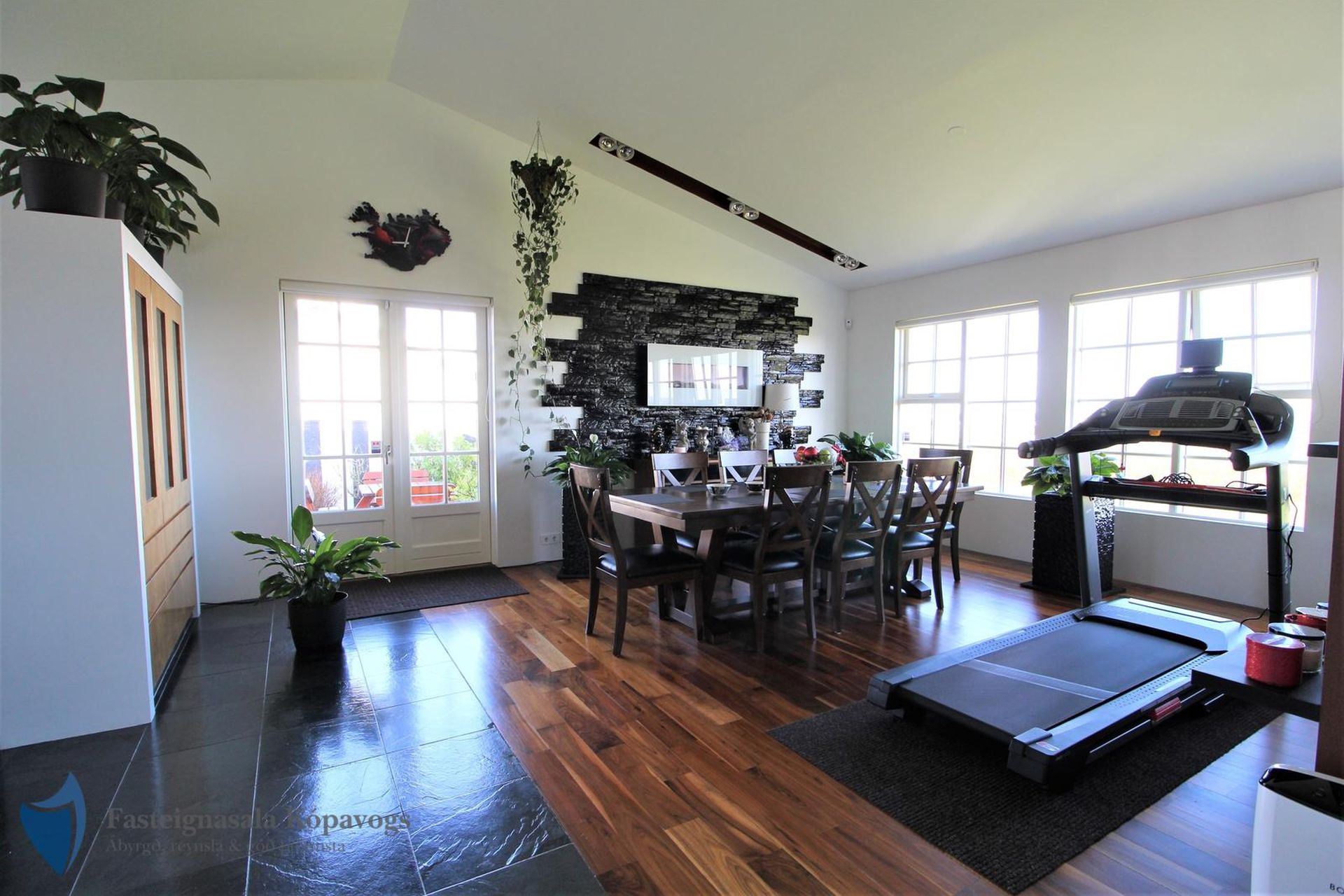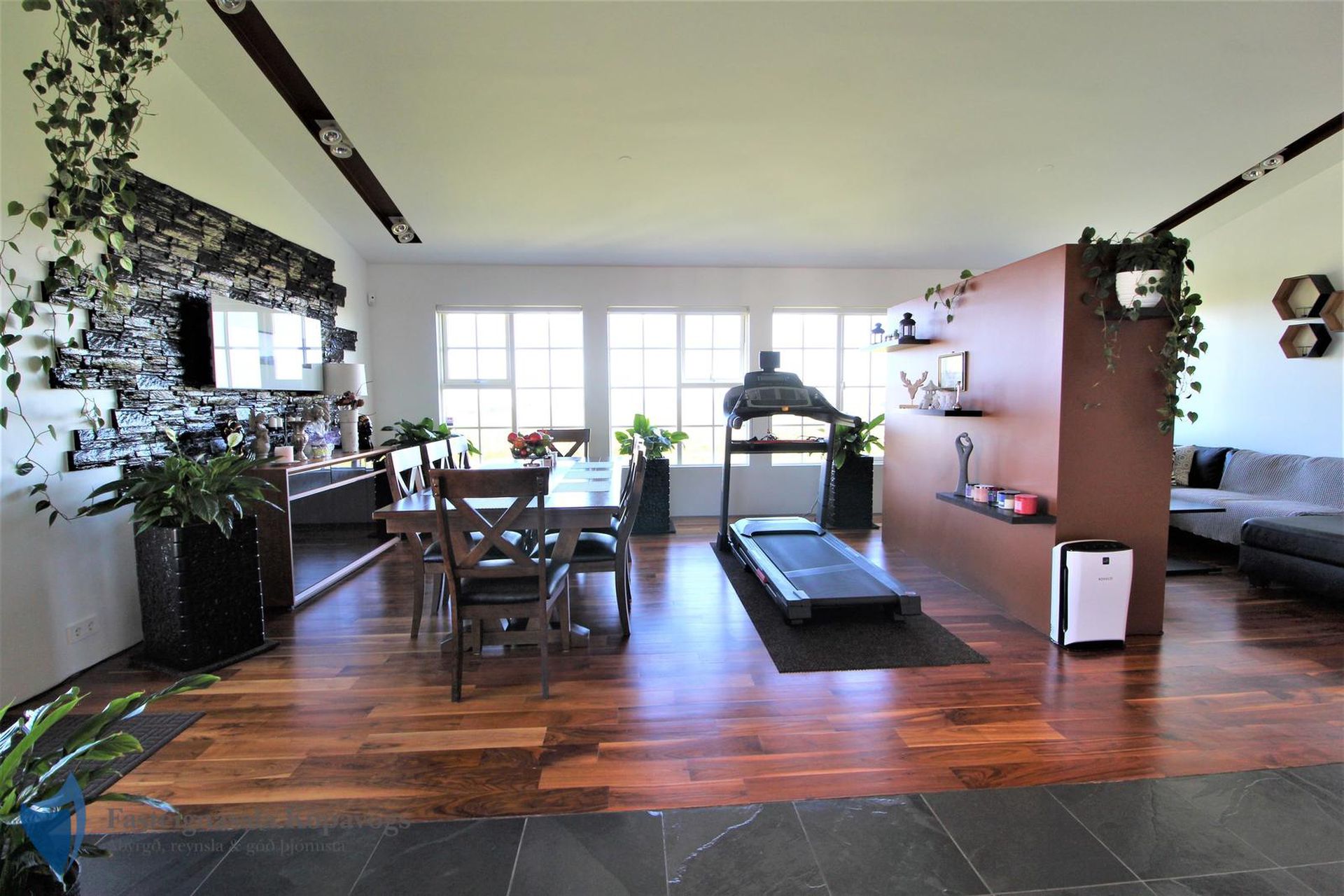 Opið bjart rými með stofu, borðstofu og sjónvarpsherbergi. Fallegt hnotuparket á gólfi og halogen lýsing.