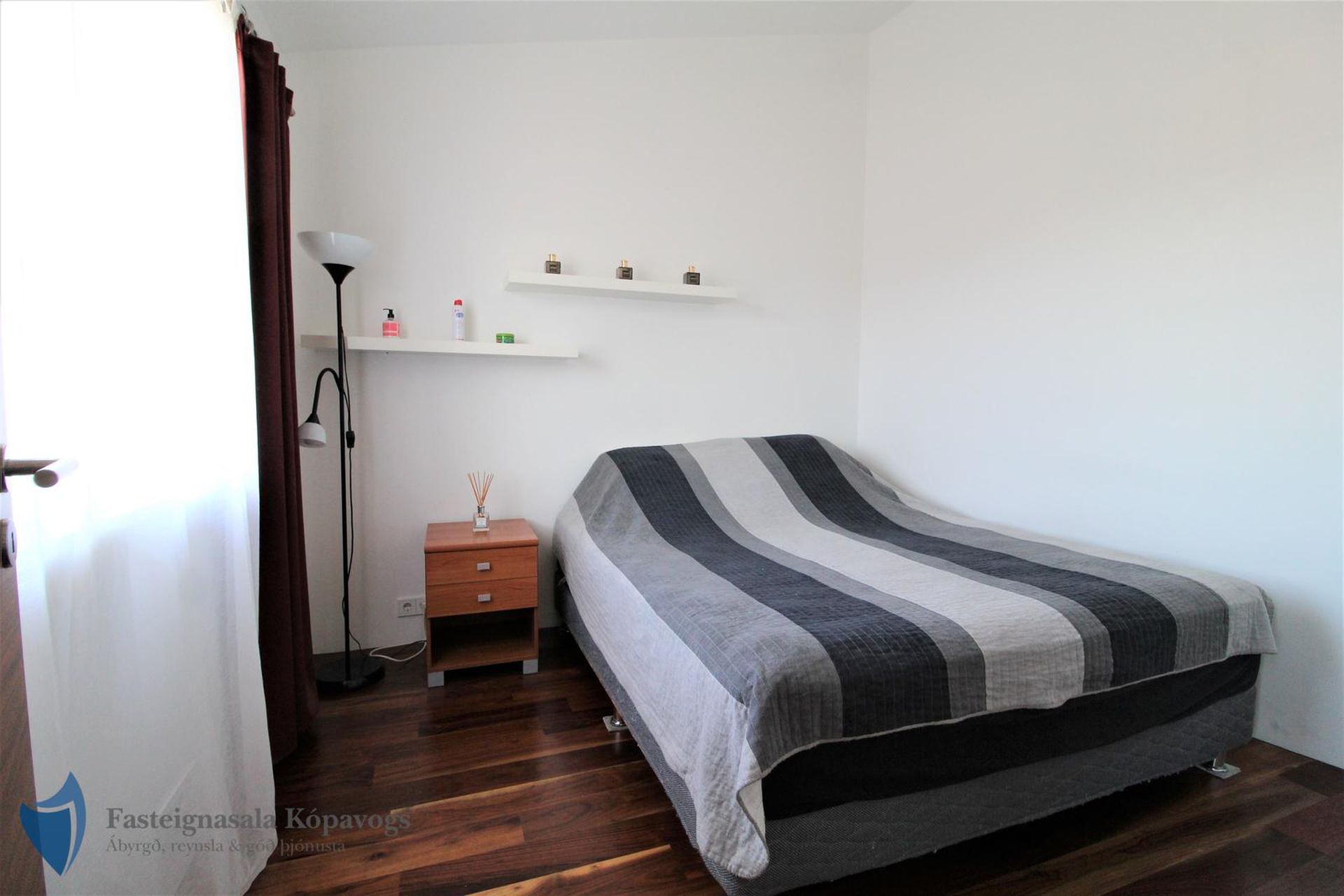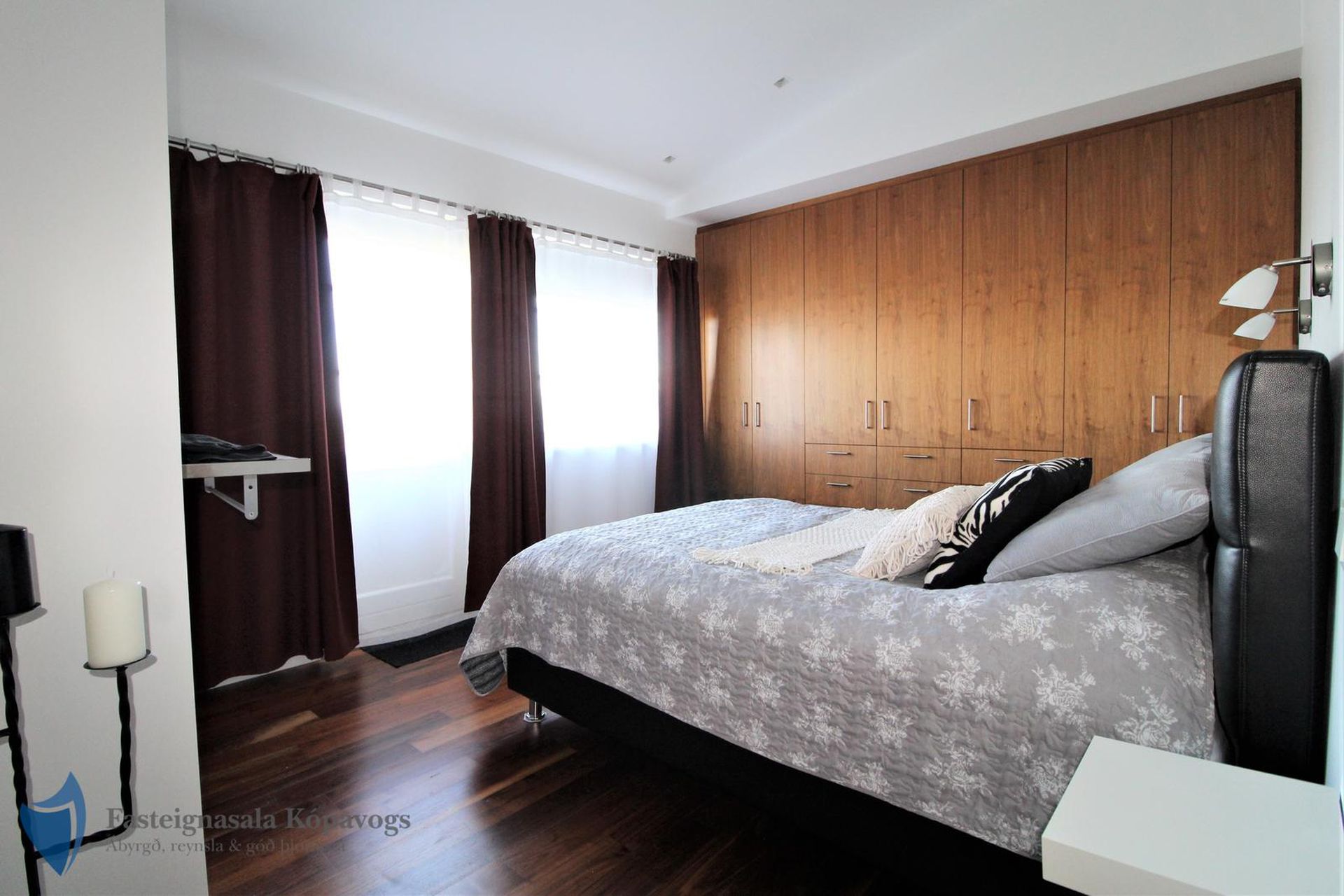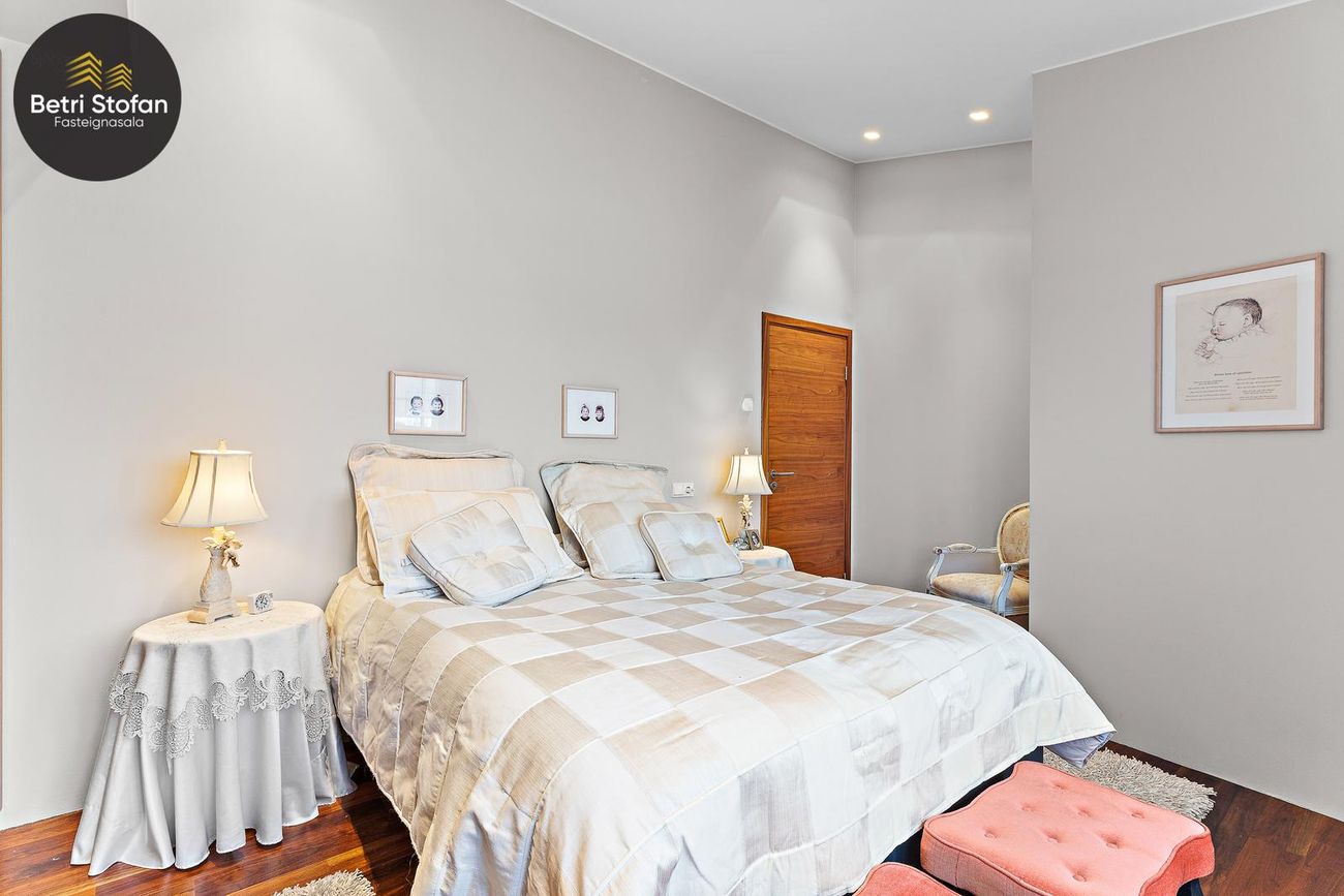 Hjónaherbergi með miklu skápaplássi, hnotuparketi og halogen lýsingu. Útgangur á verönd.