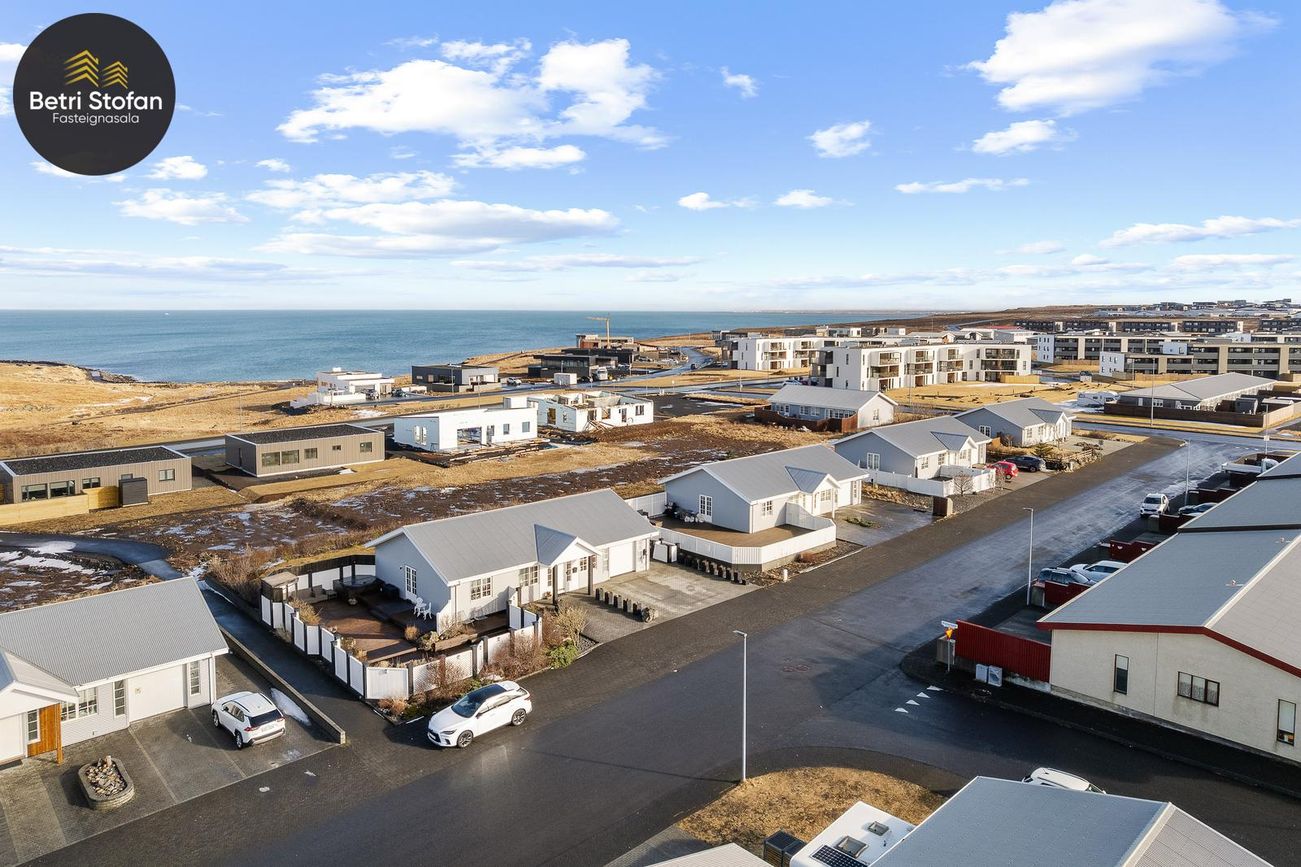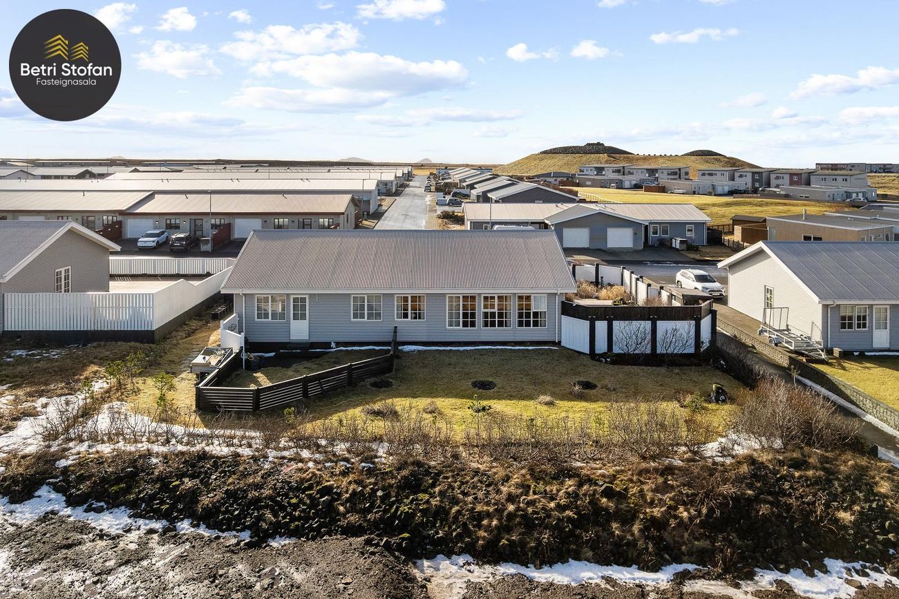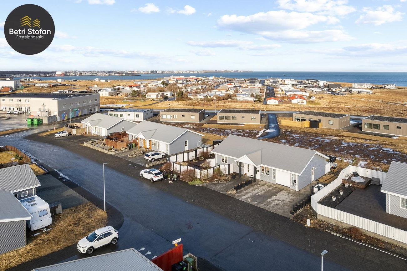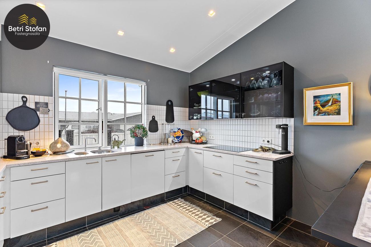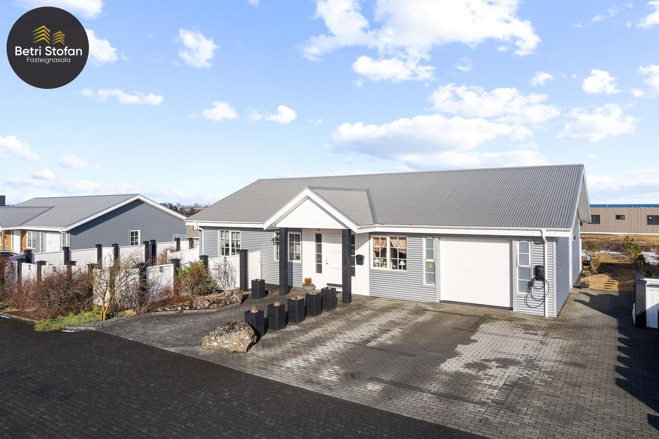 151,7m² einbýlishús með 26m² bílskúr, opið rými, granitborðplötur, sérsmíðaðar innréttingar, heitur pottur og rafhleðsla.