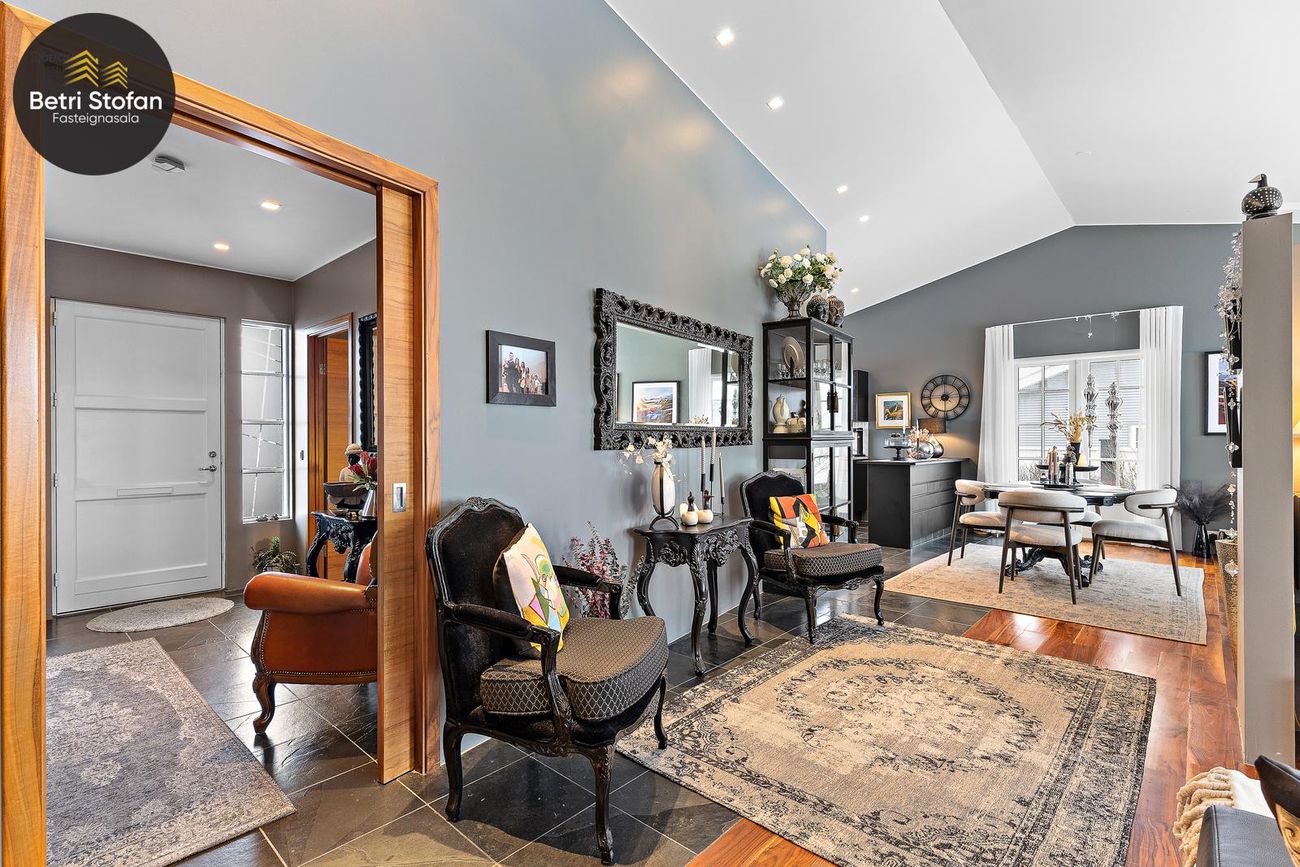 26m² bílskúr með sjálfvirkum hurðaopnara, gluggum með opnanlegu fagi, flísalögum gólfi og rafhleðslu. Gönguhurð í bakgarð.