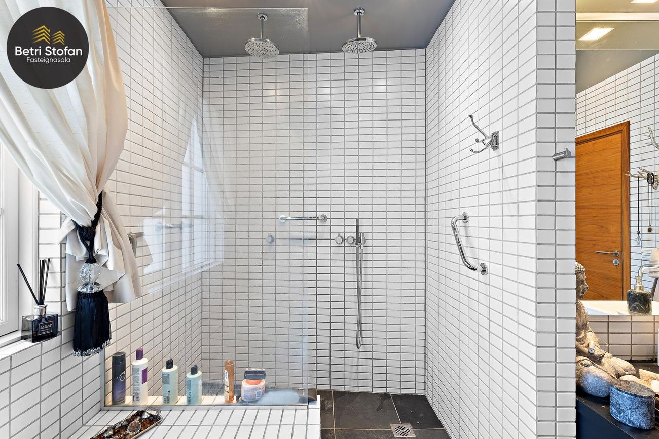 Rúmgott baðherbergi með flísalögum gólfi og veggjum, baðkari og stórum sturtuklefa með tveimur sturtuhausum. Innréttingar hannaðar af Arne Jakobssen.