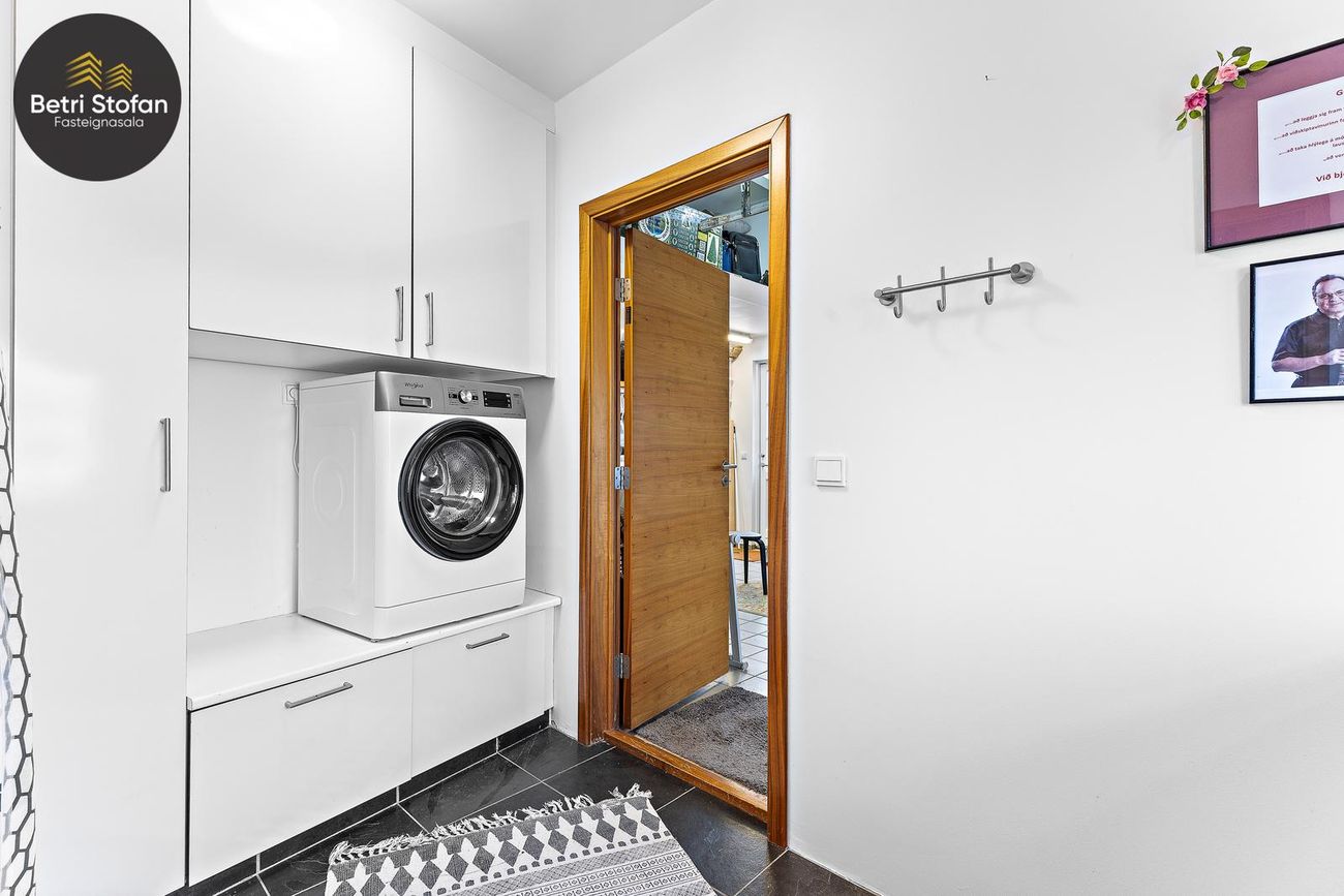 Þvottahús með innréttingu og góðu vinnuplássi. Tengt bílskúr.