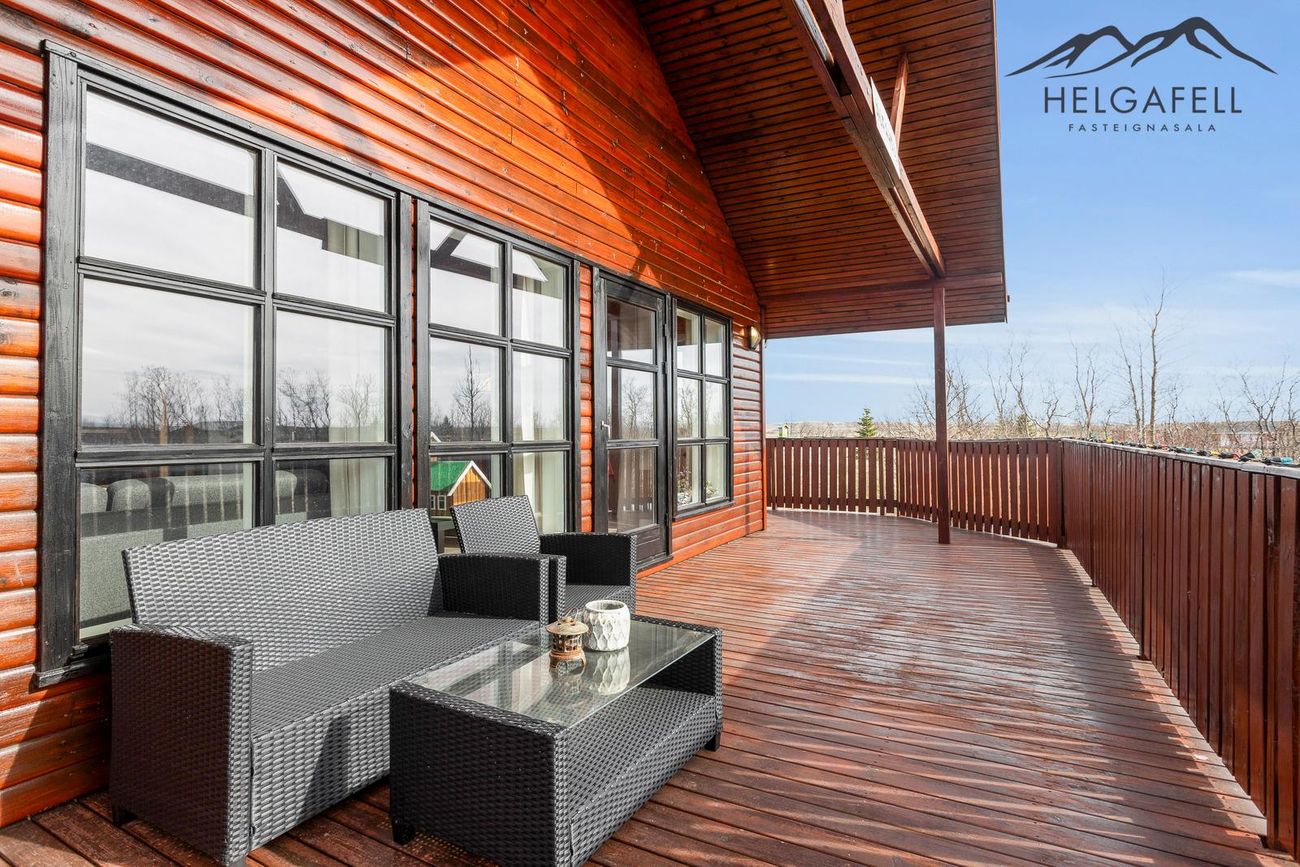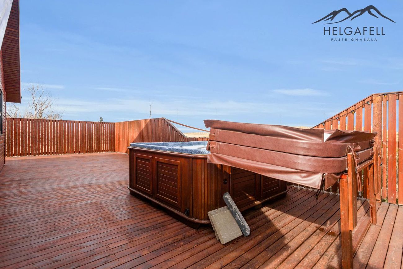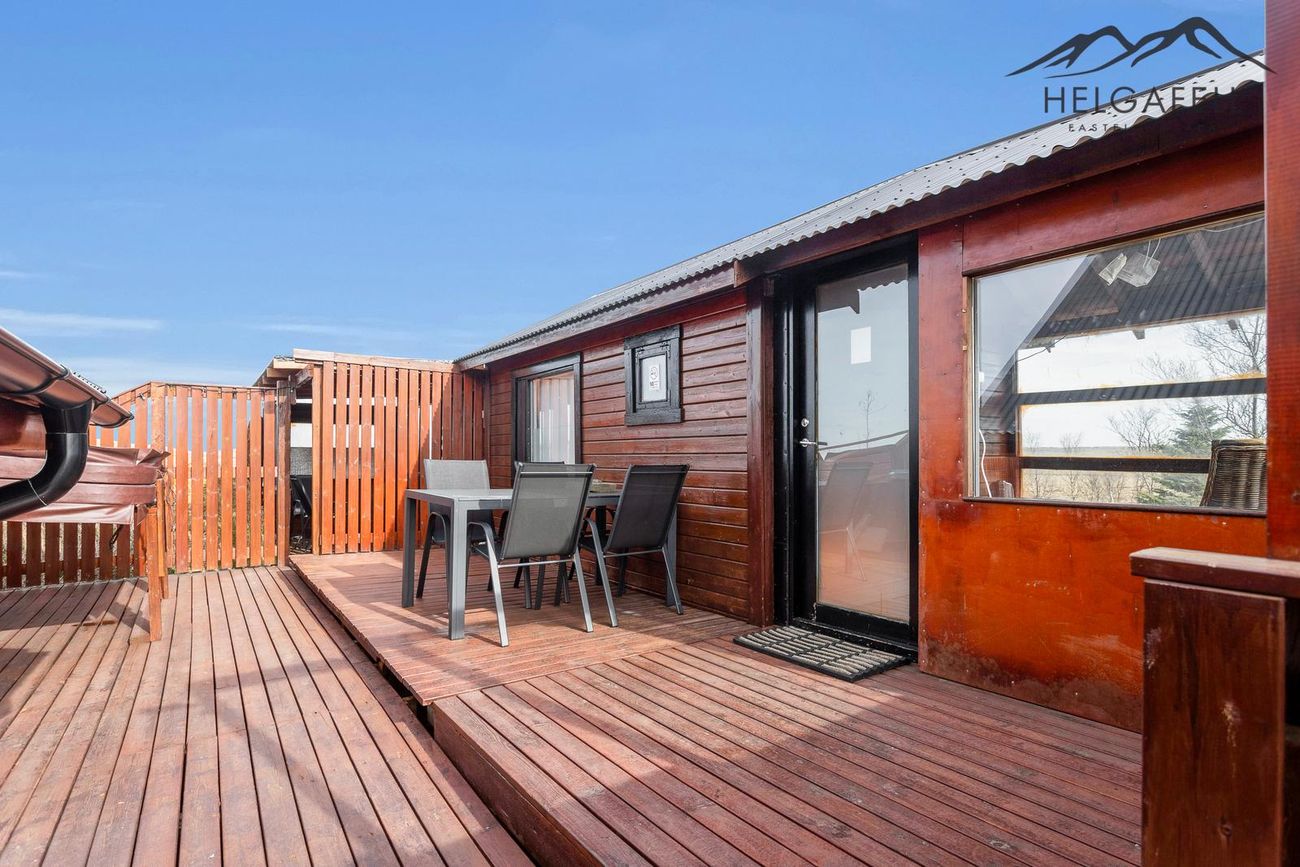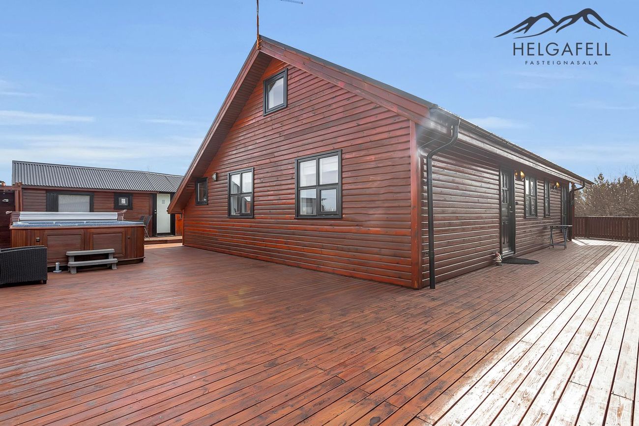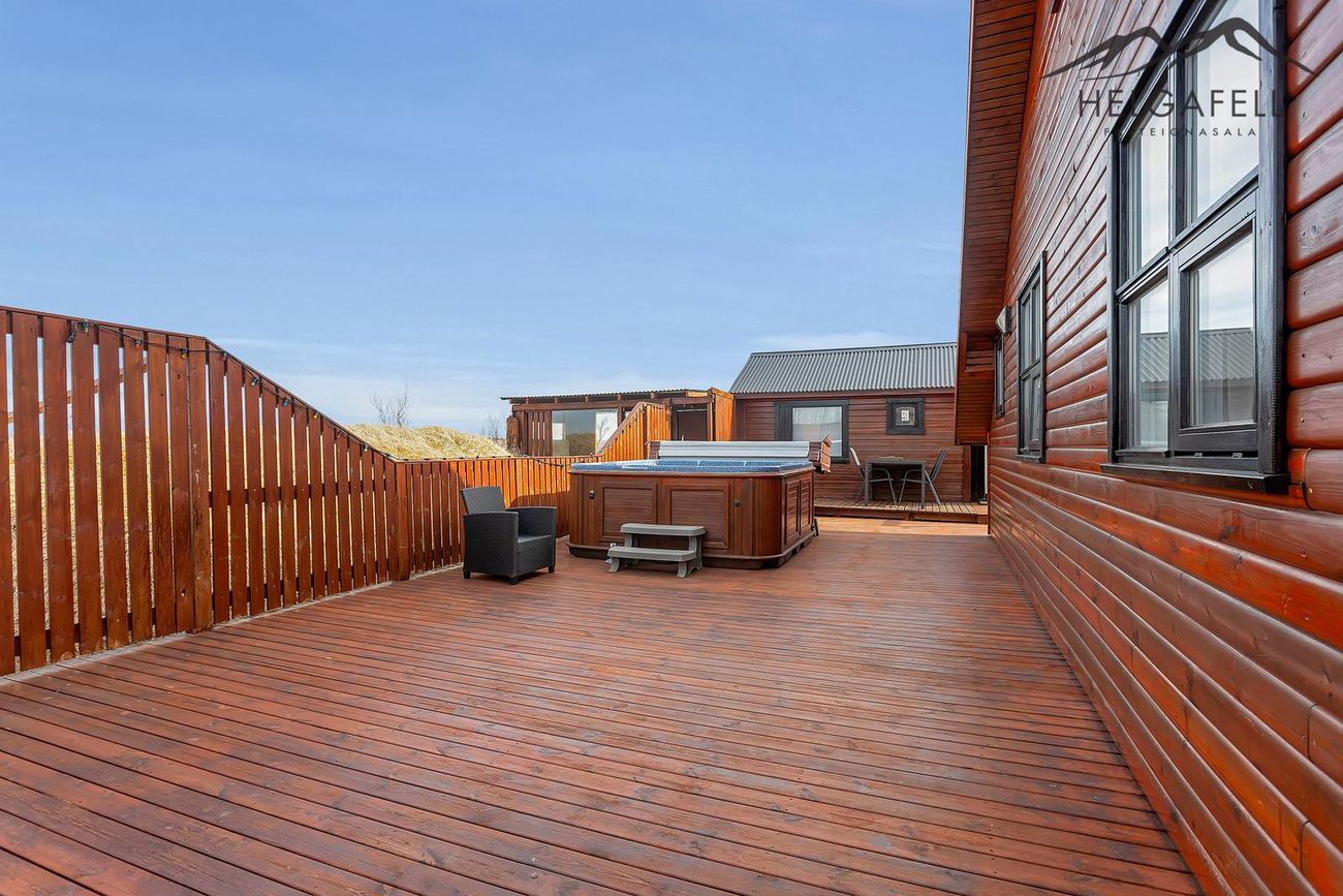 Stór verönd kringum allt húsið með hitaveitupotti og grillskýli.