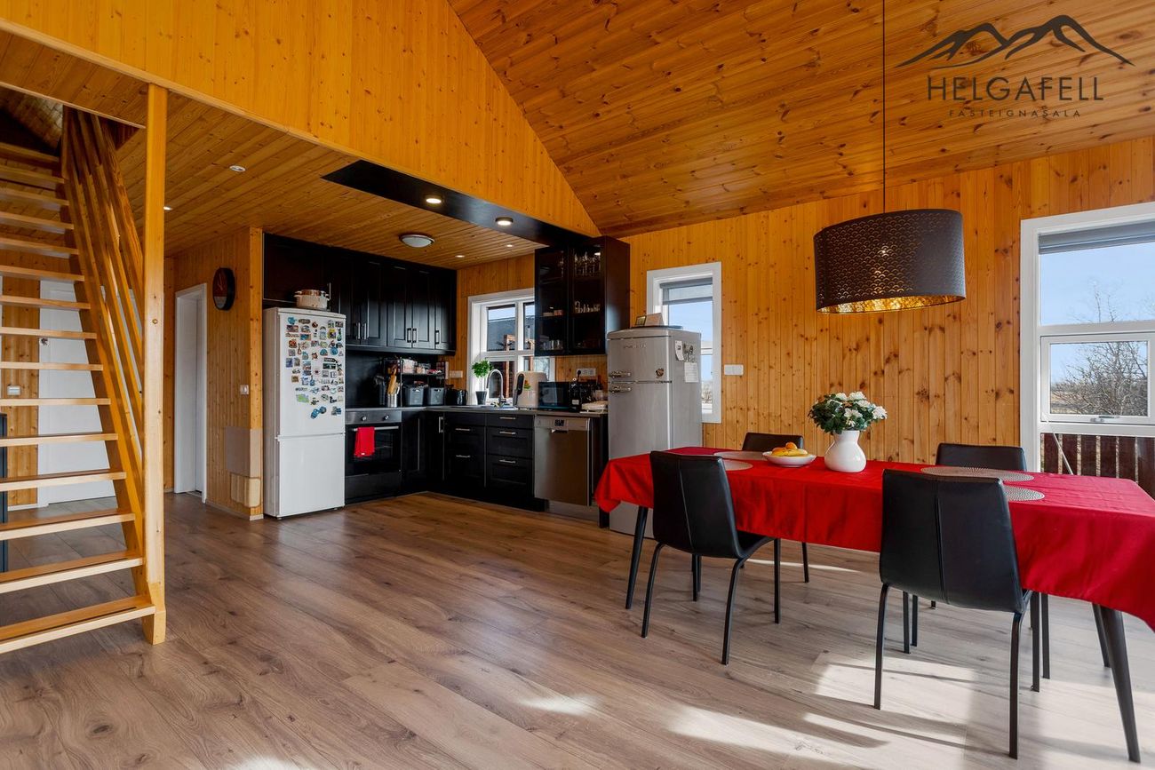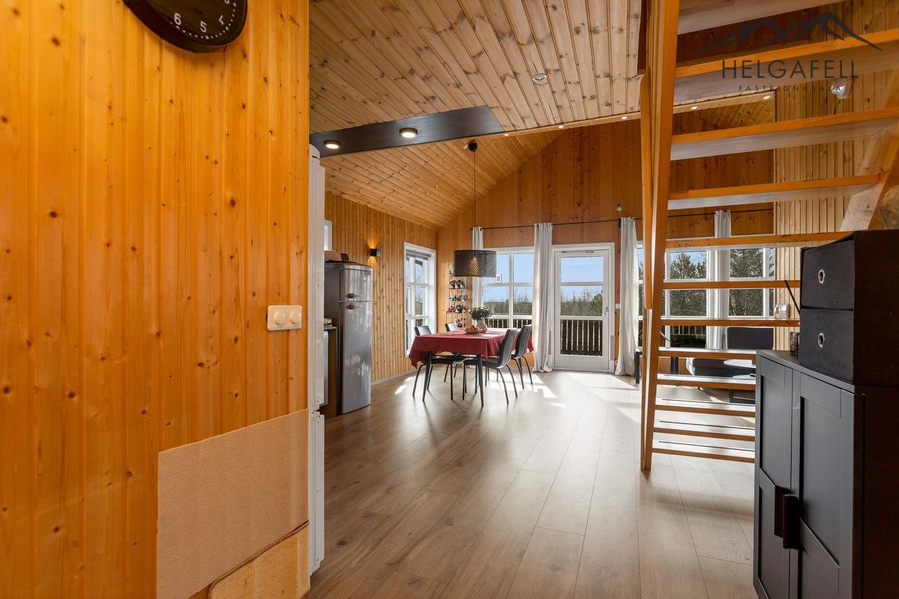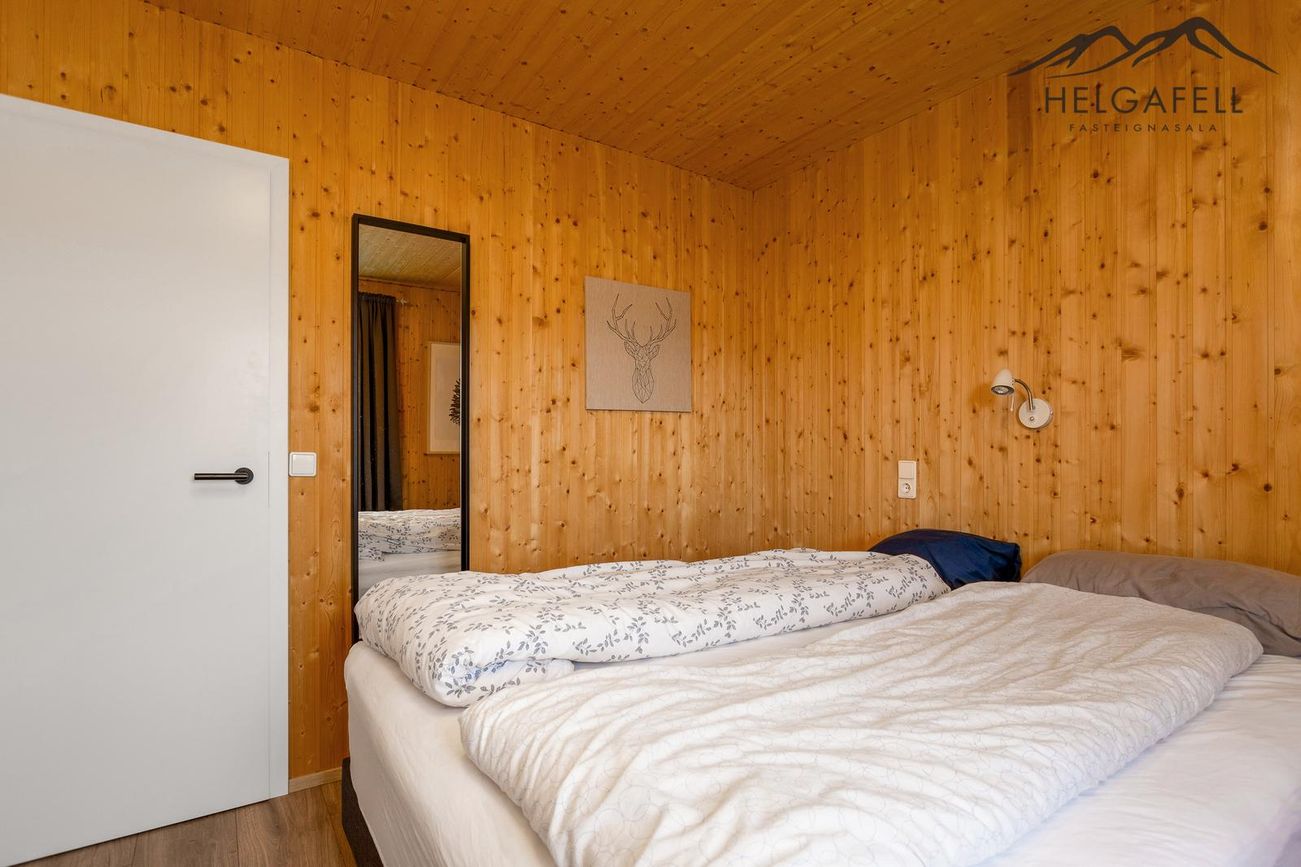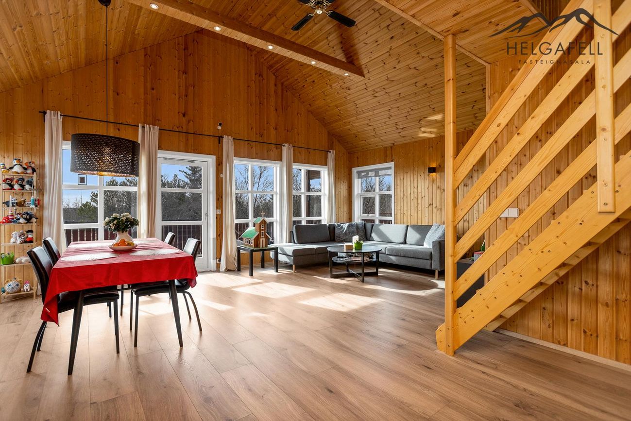 Timburhús klætt með bjálkaklæðningu og litað járn á þaki. Parket á gólfum, flísar í baðherbergi.
