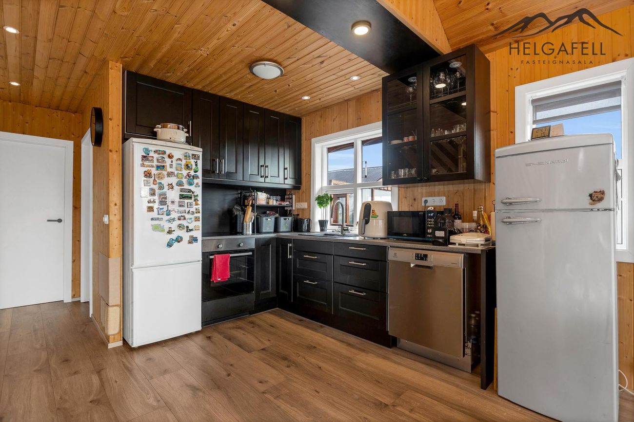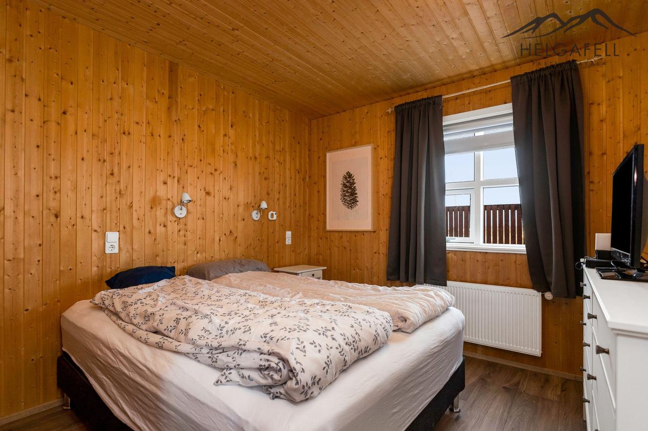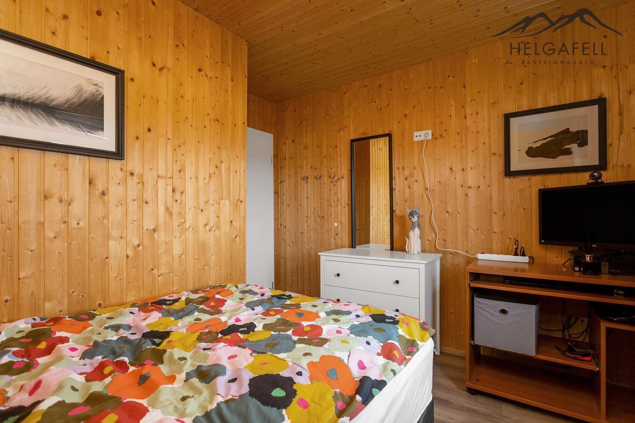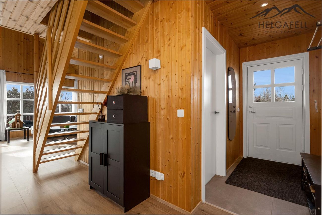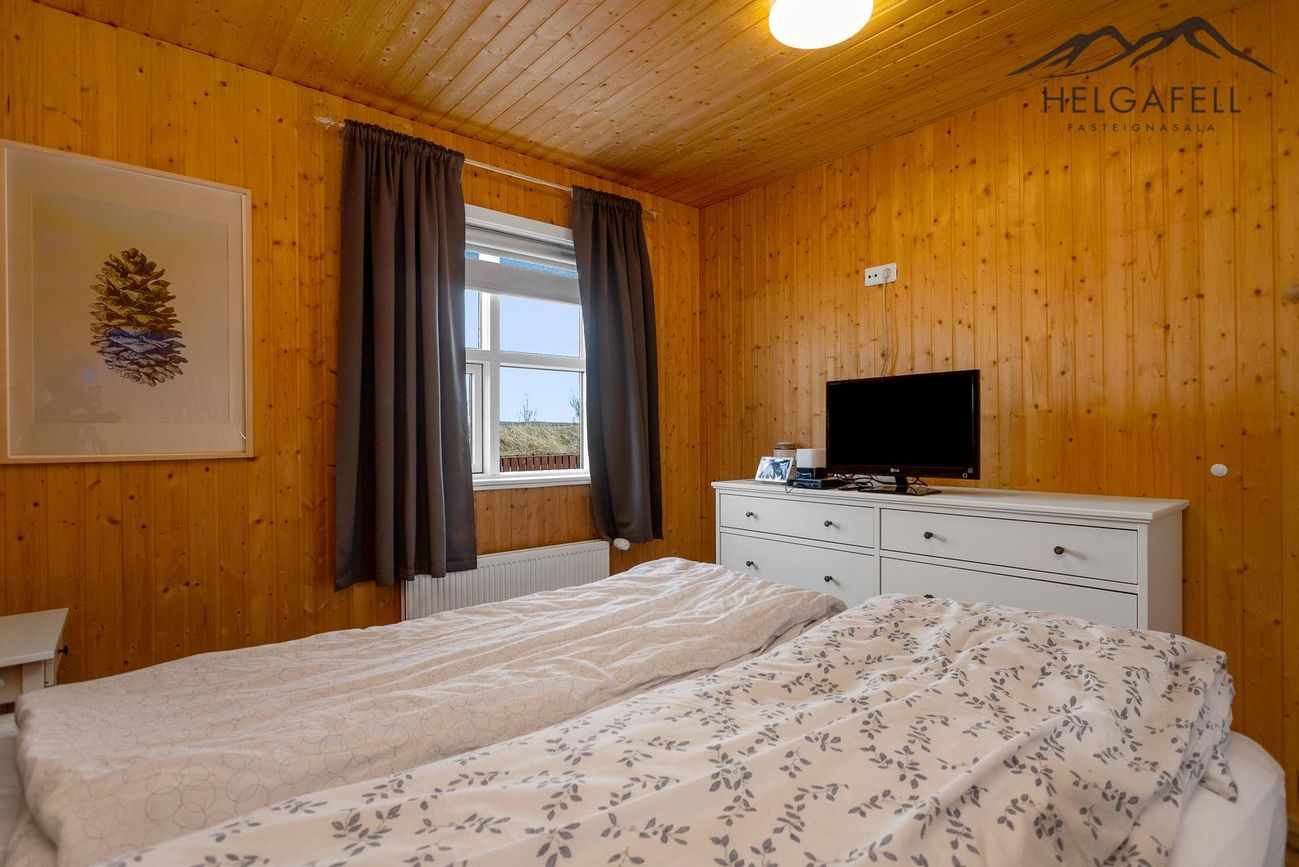 Timburhús klætt með bjálkaklæðningu og litað járn á þaki. Parket á gólfum, flísar í baðherbergi.