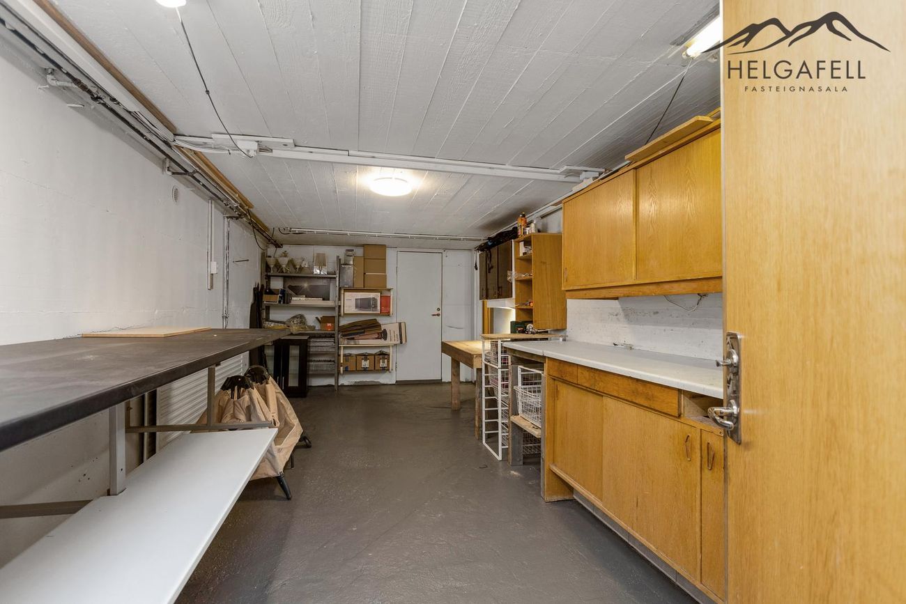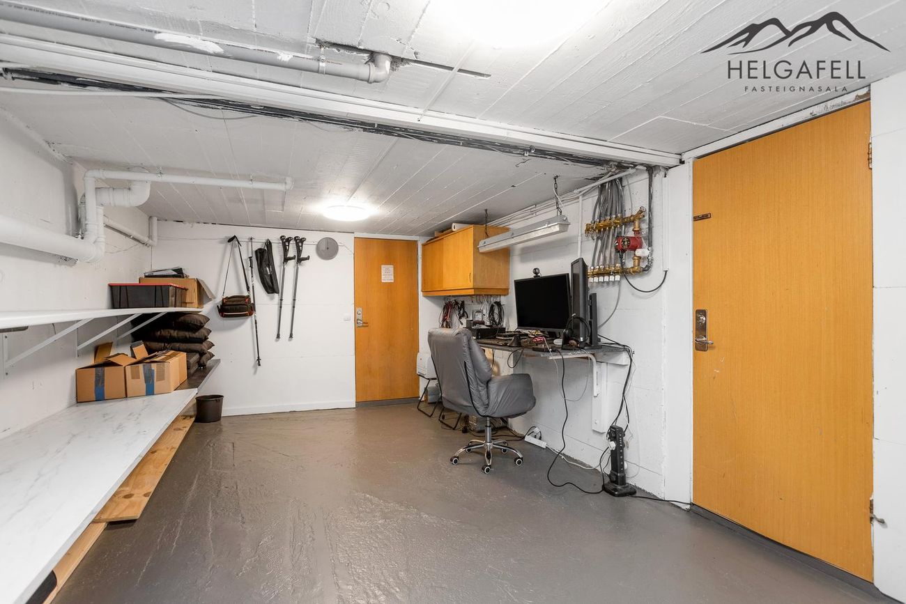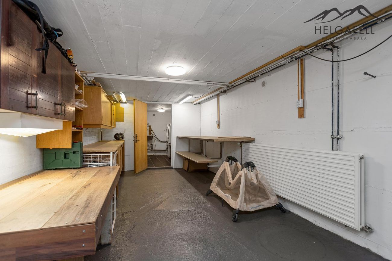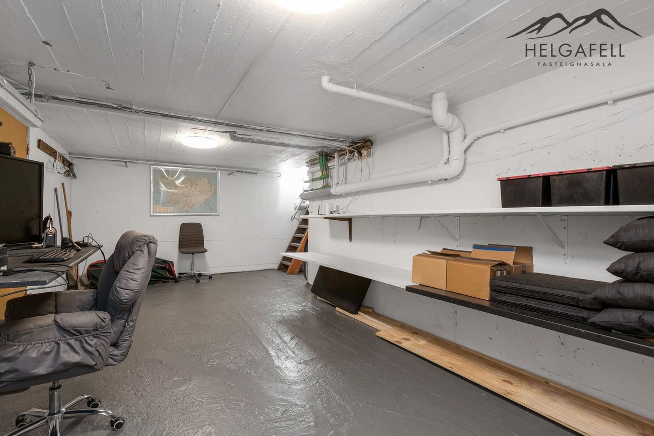 Svefnloftið hefur geymslupláss og í kjallara eru tvö stór geymslurými.