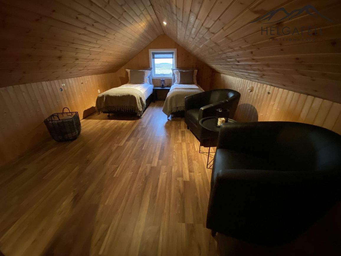 Svefnloftið og kjallarinn með tómstundarherbergi.