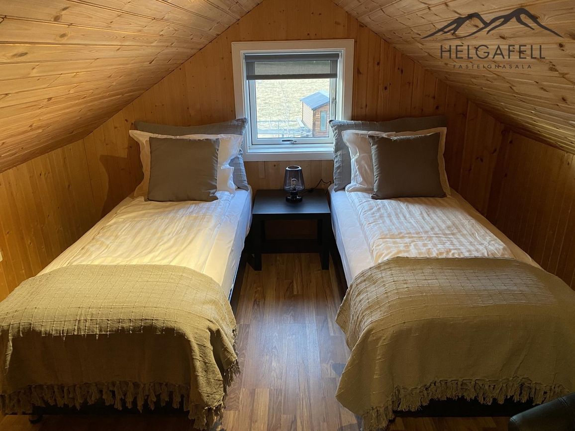Tvö svefnherbergi með hjónarúmi og kommóðu, parketi og hita í gólfi. Annað svefnherbergi með koju og parketi.