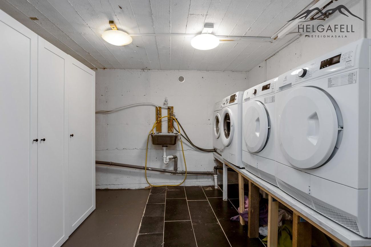 Í kjallara er stórt þvottahús.