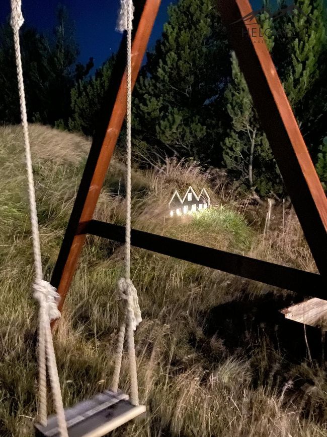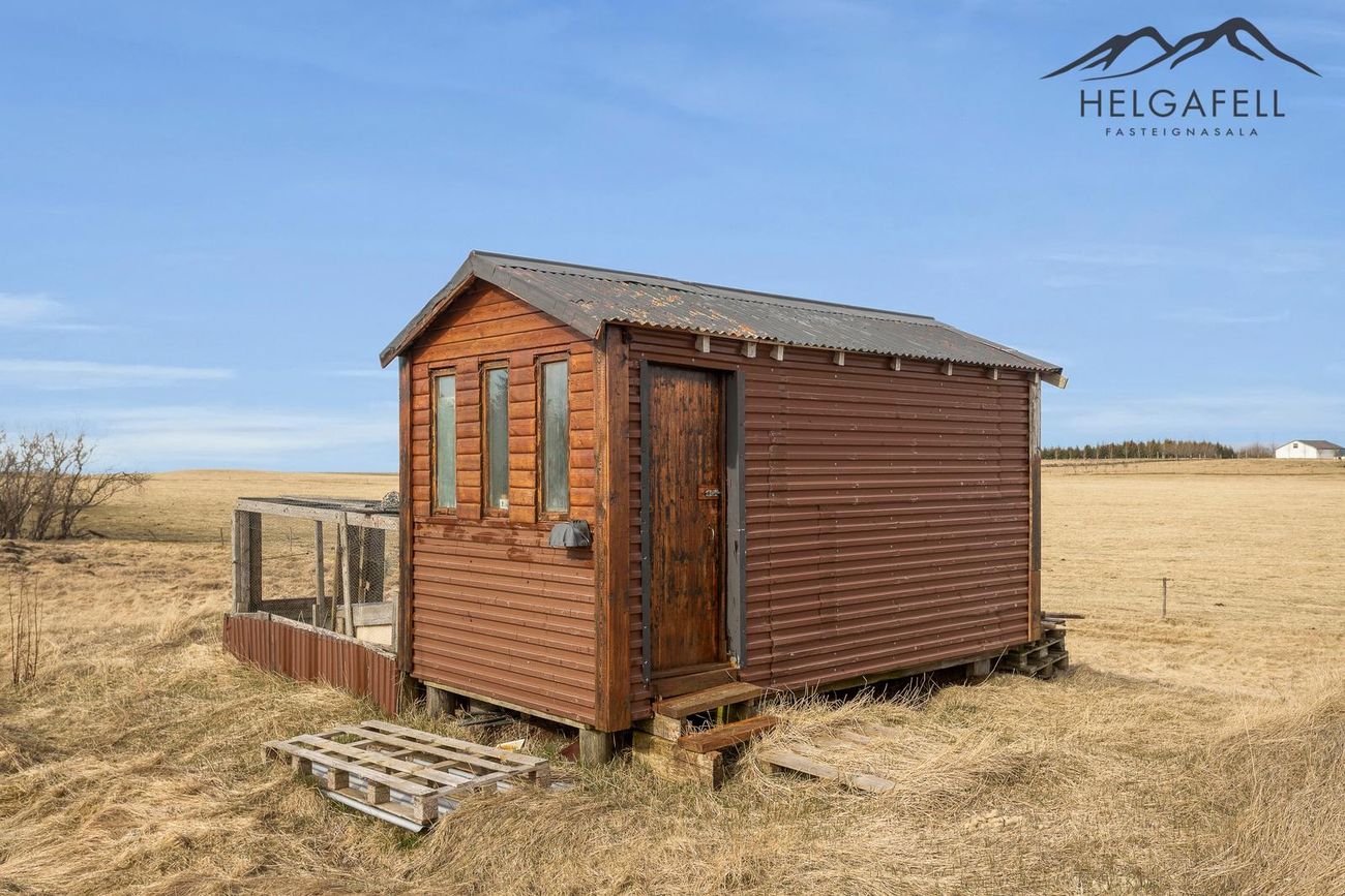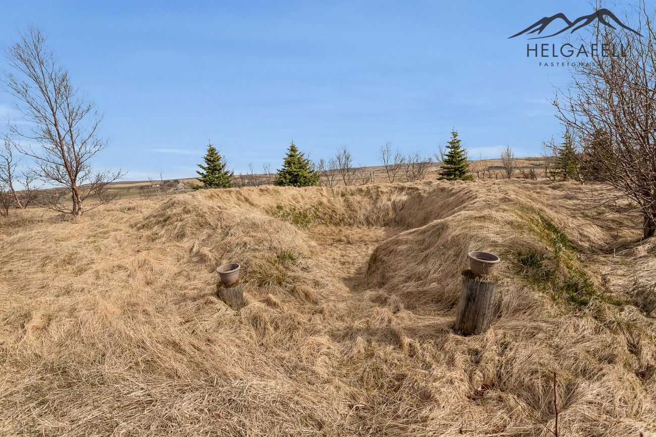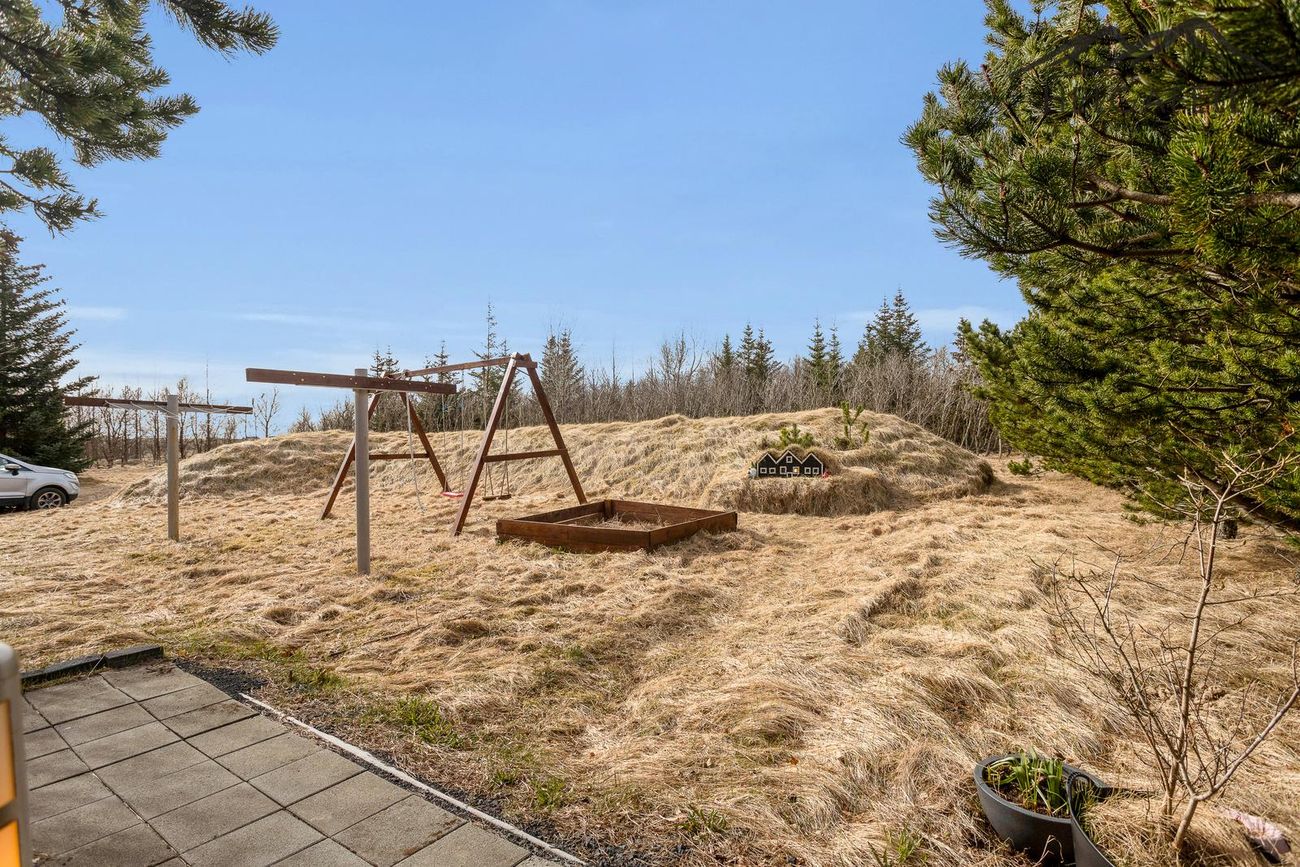 Lóðin er 8.000 fm afgirt og kjarri vaxin, með leiktæki og hænsnakofi.
