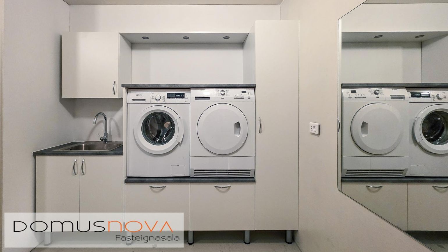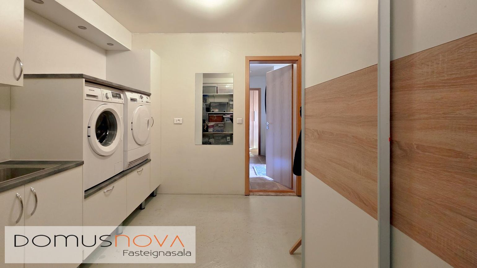 Nýtt þvottahús með þvottavél/sturtaplássi, vaski og geymsluhillum. Málað gólf.