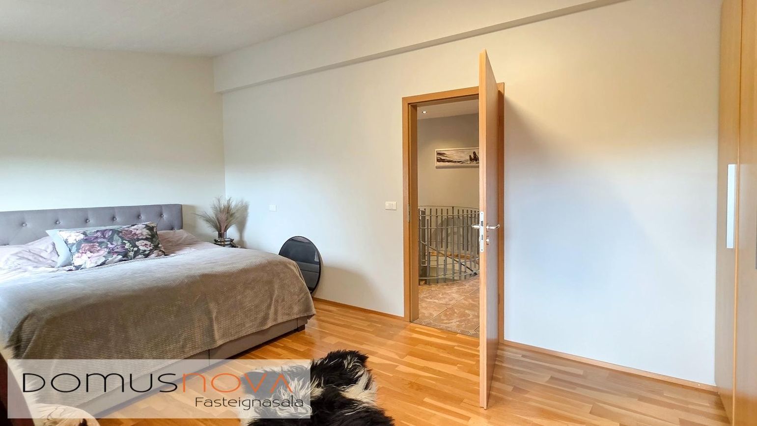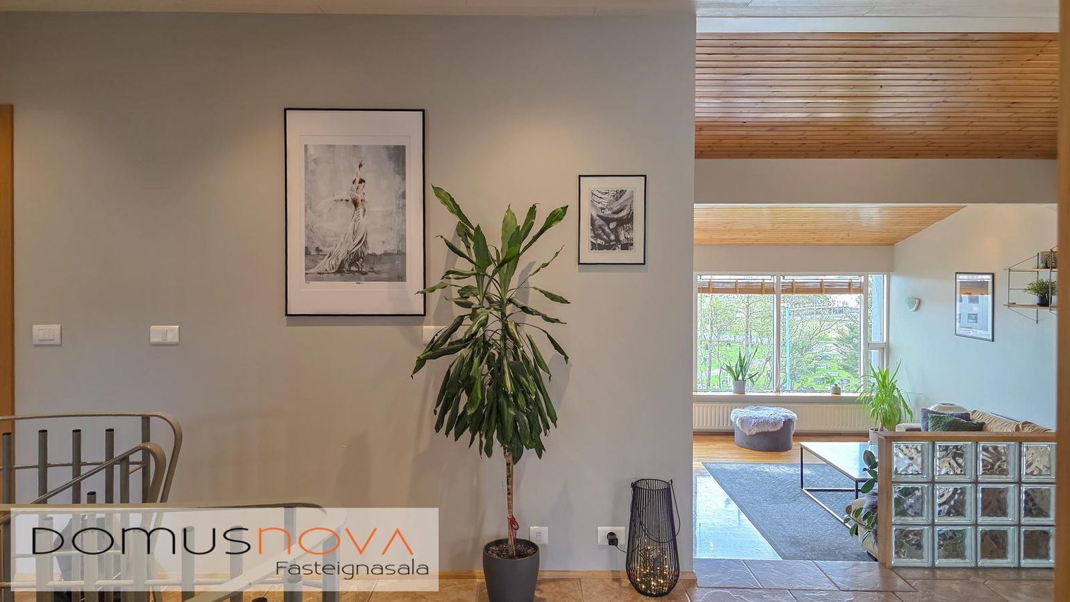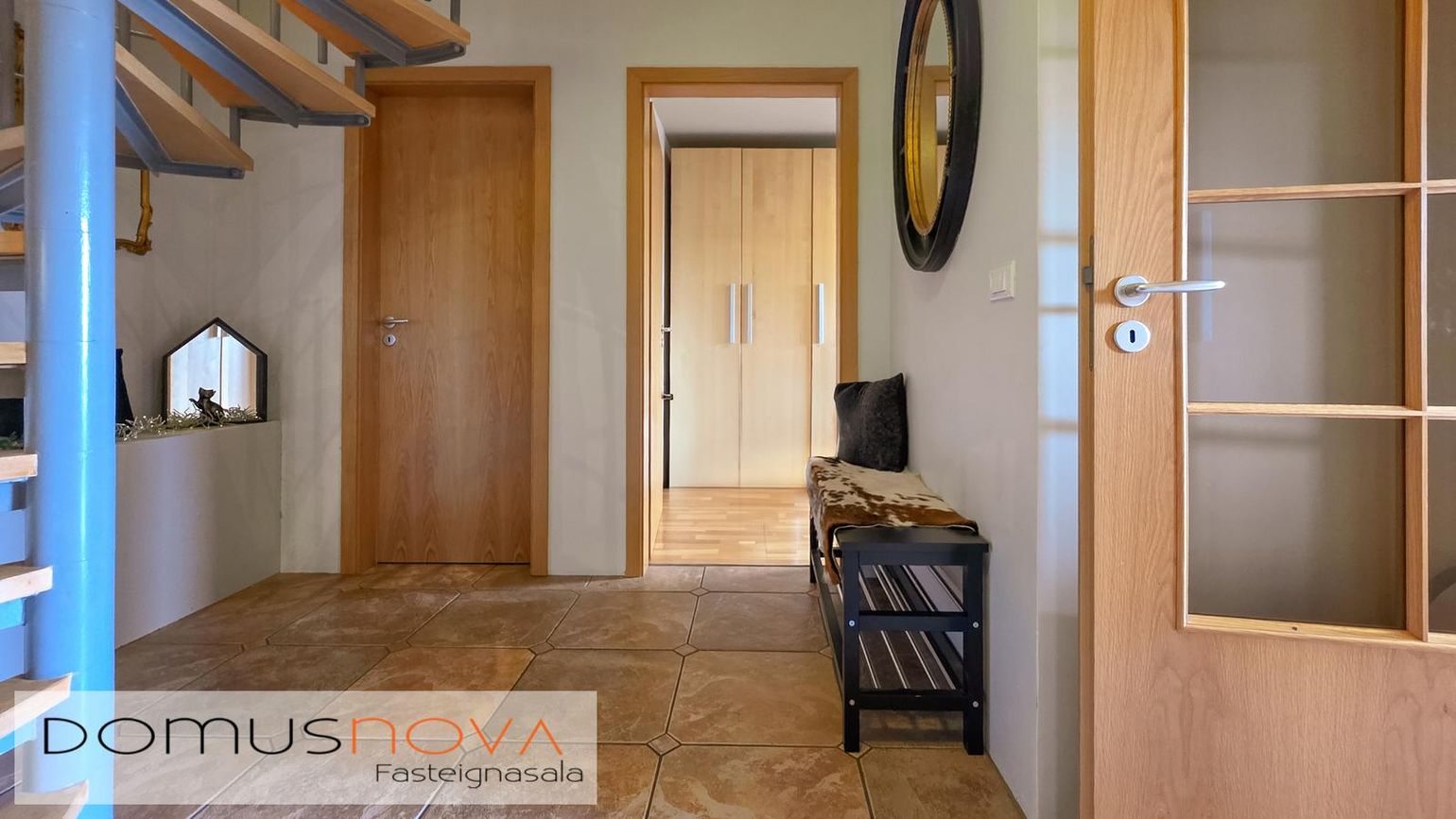 Parket- og flísagólf, gipsklæddir veggir, timburveröld og steypt bygging.