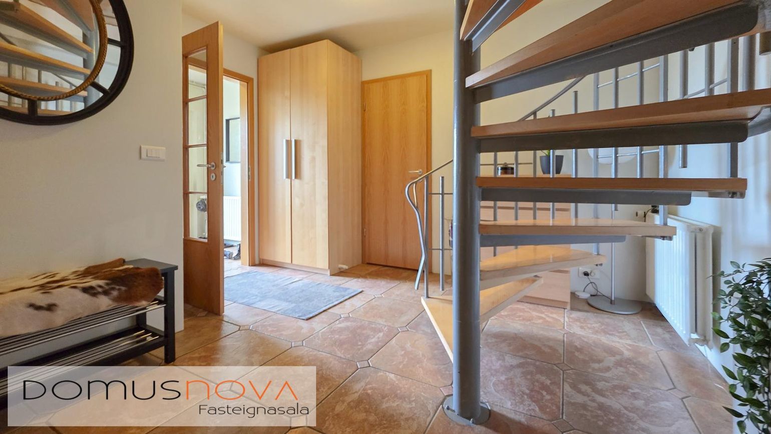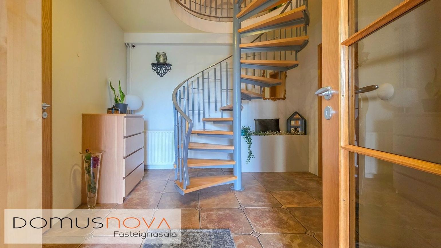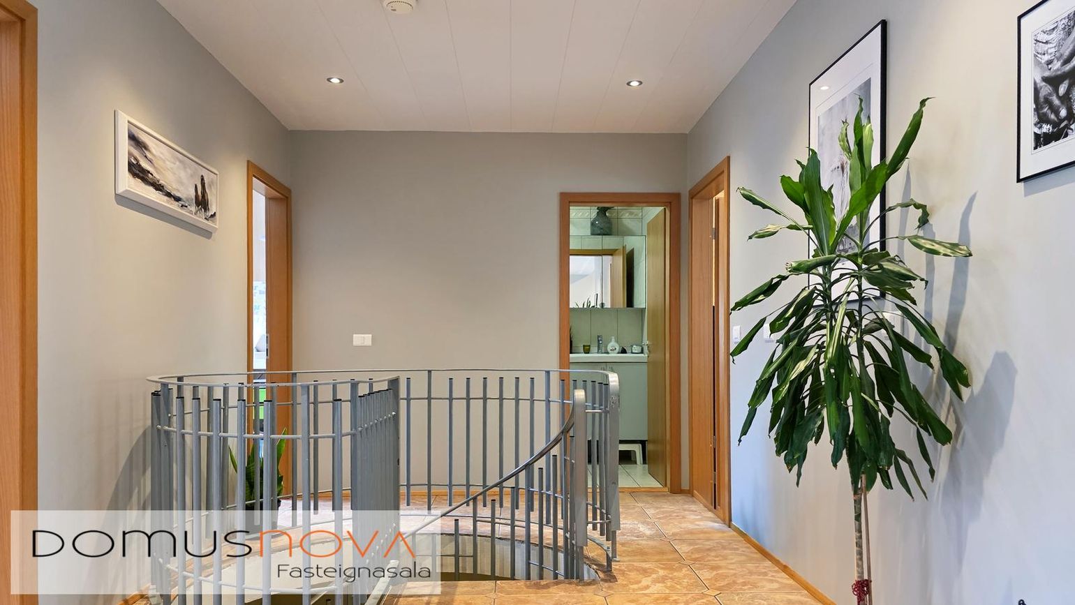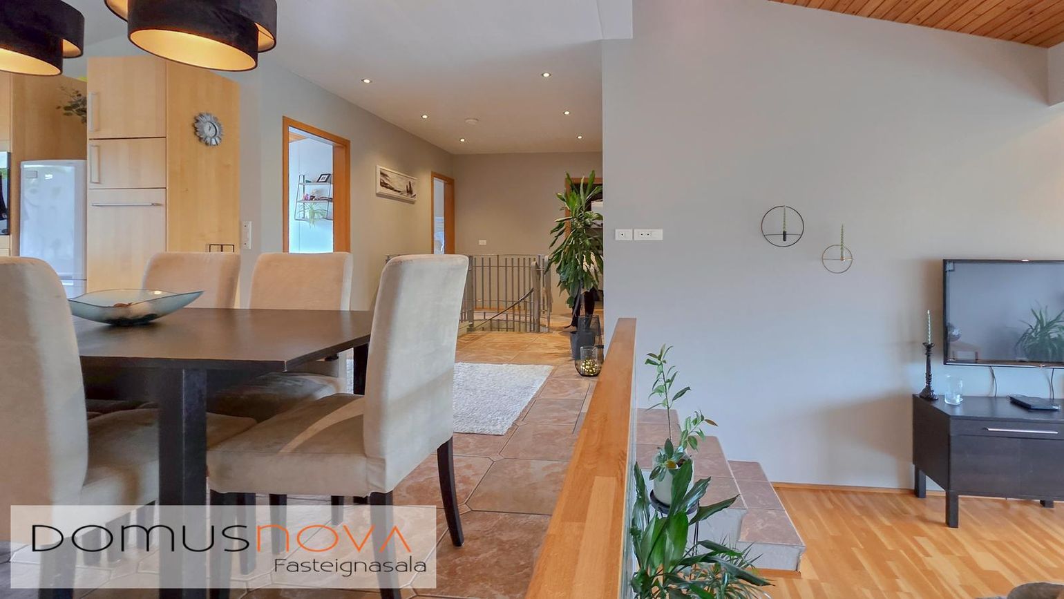 Parket- og flísagólf, gipsklæddir veggir, timburveröld og steypt bygging.