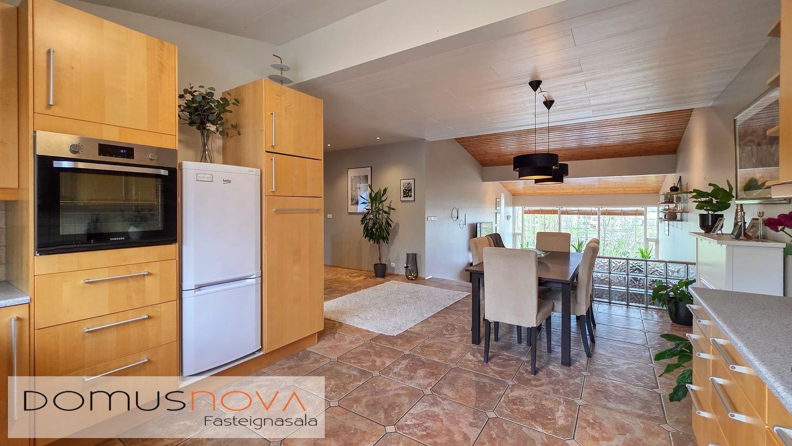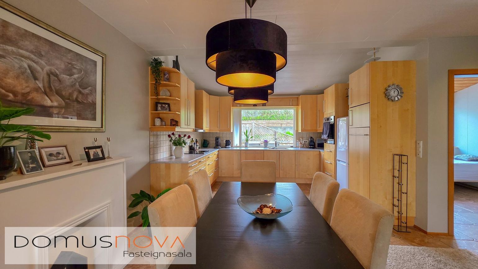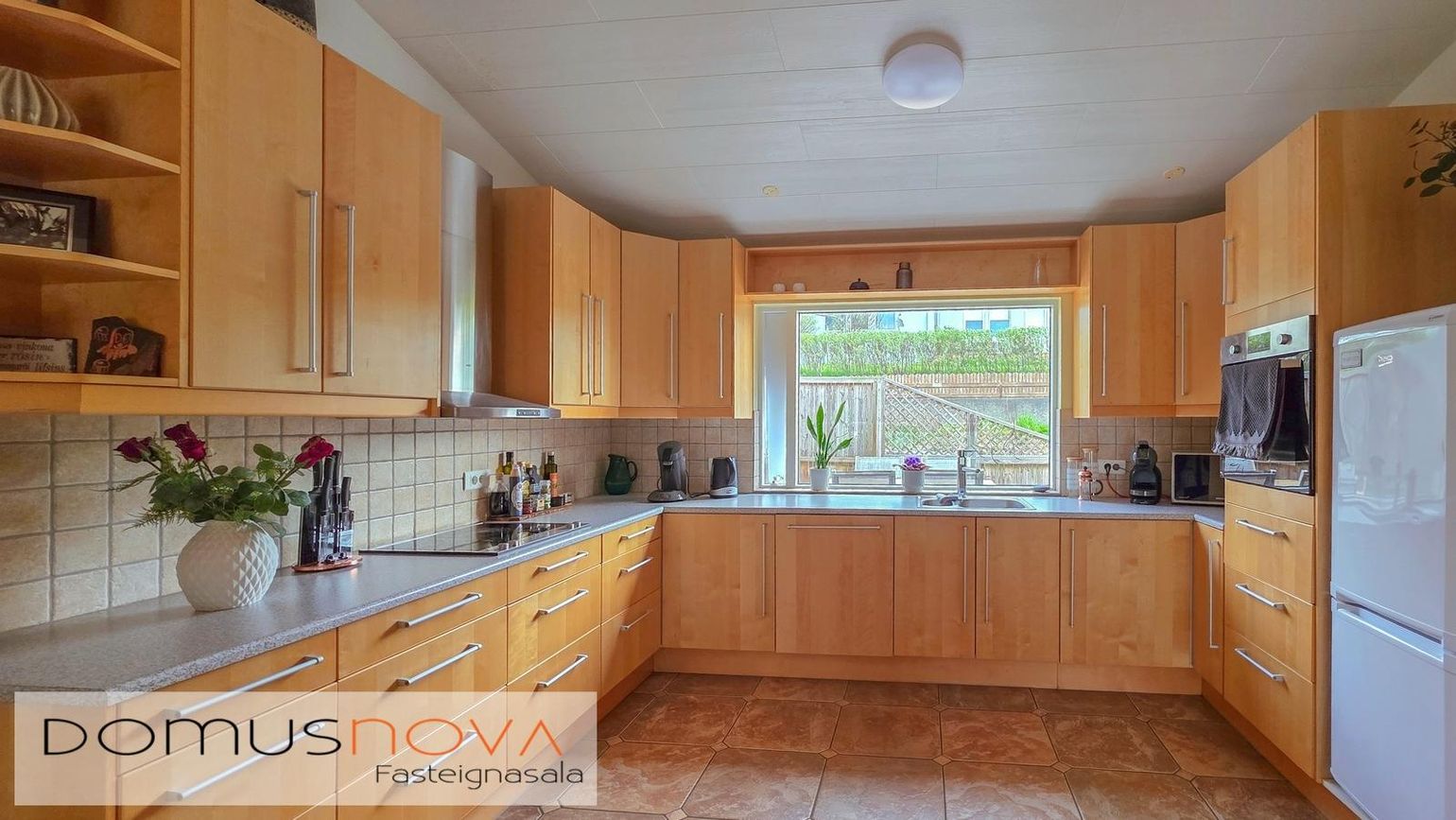 Innbyggð eldhúsinnrétting, ný þvottavél/sturta og rafdrifin bílskúrshurð.