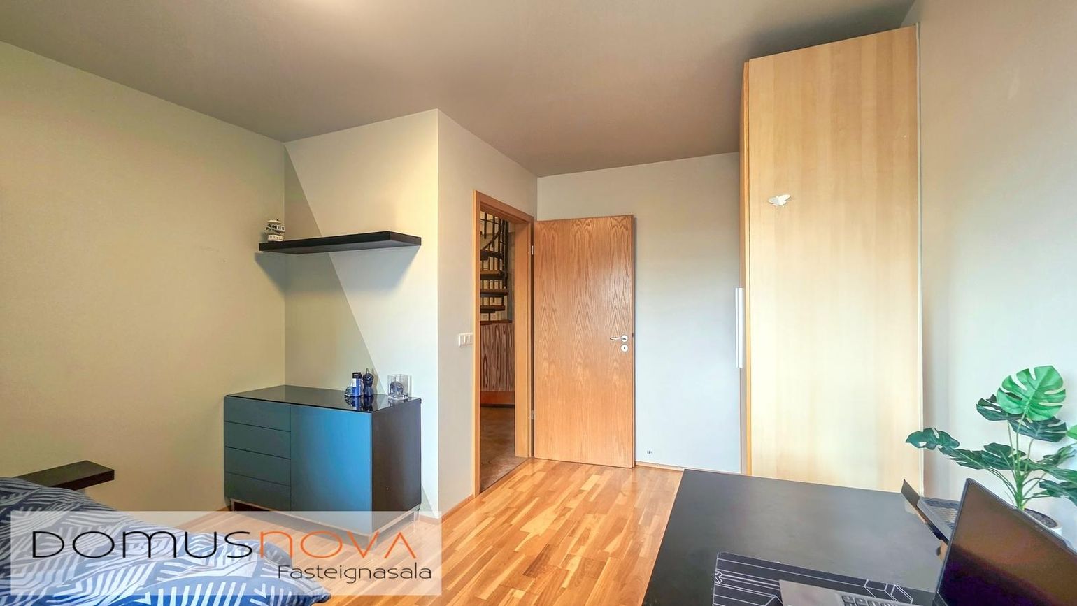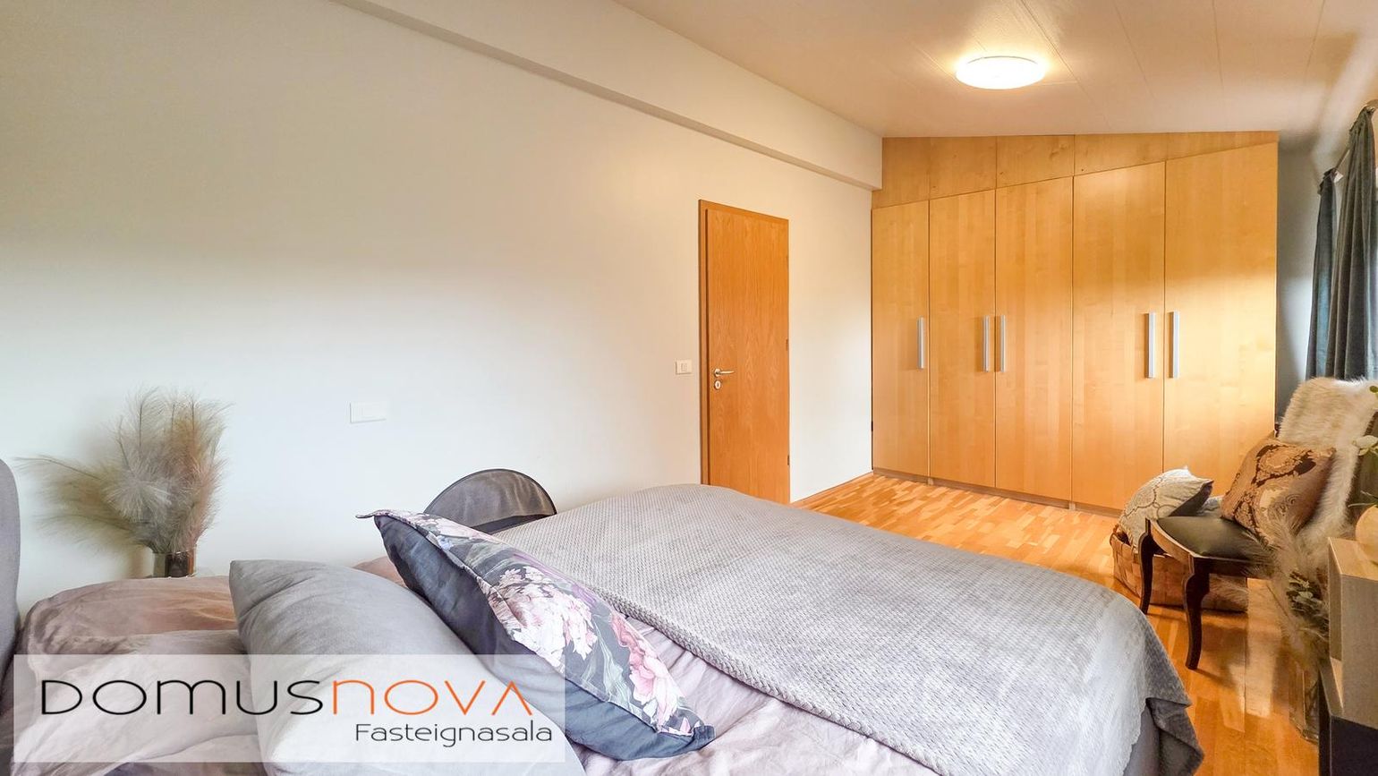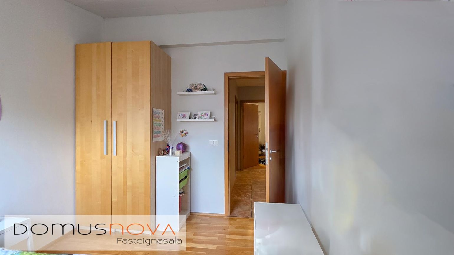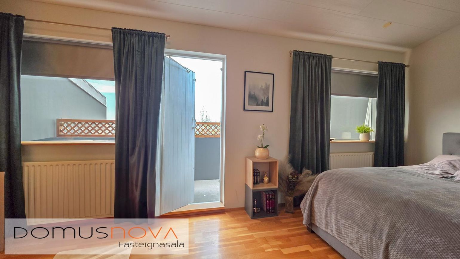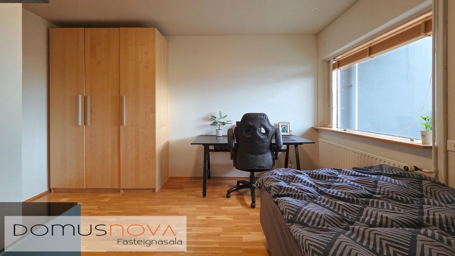 Þrjú herbergi: Eitt með sérsmíðaðum fataskáp og útgöngu á svalir, annað með parketgólfi og þriðja með flísalögðu gólfi og útgöngu í bakgarð.