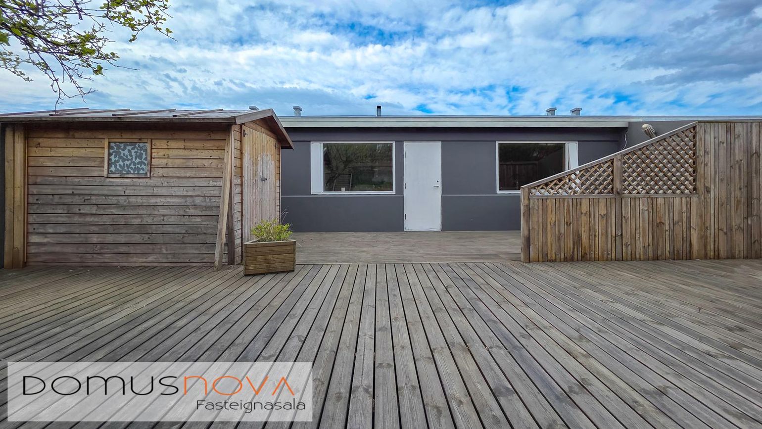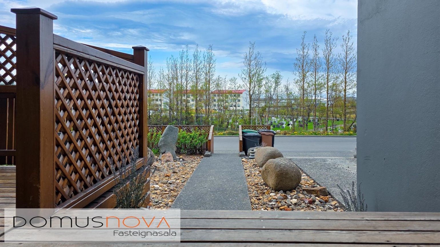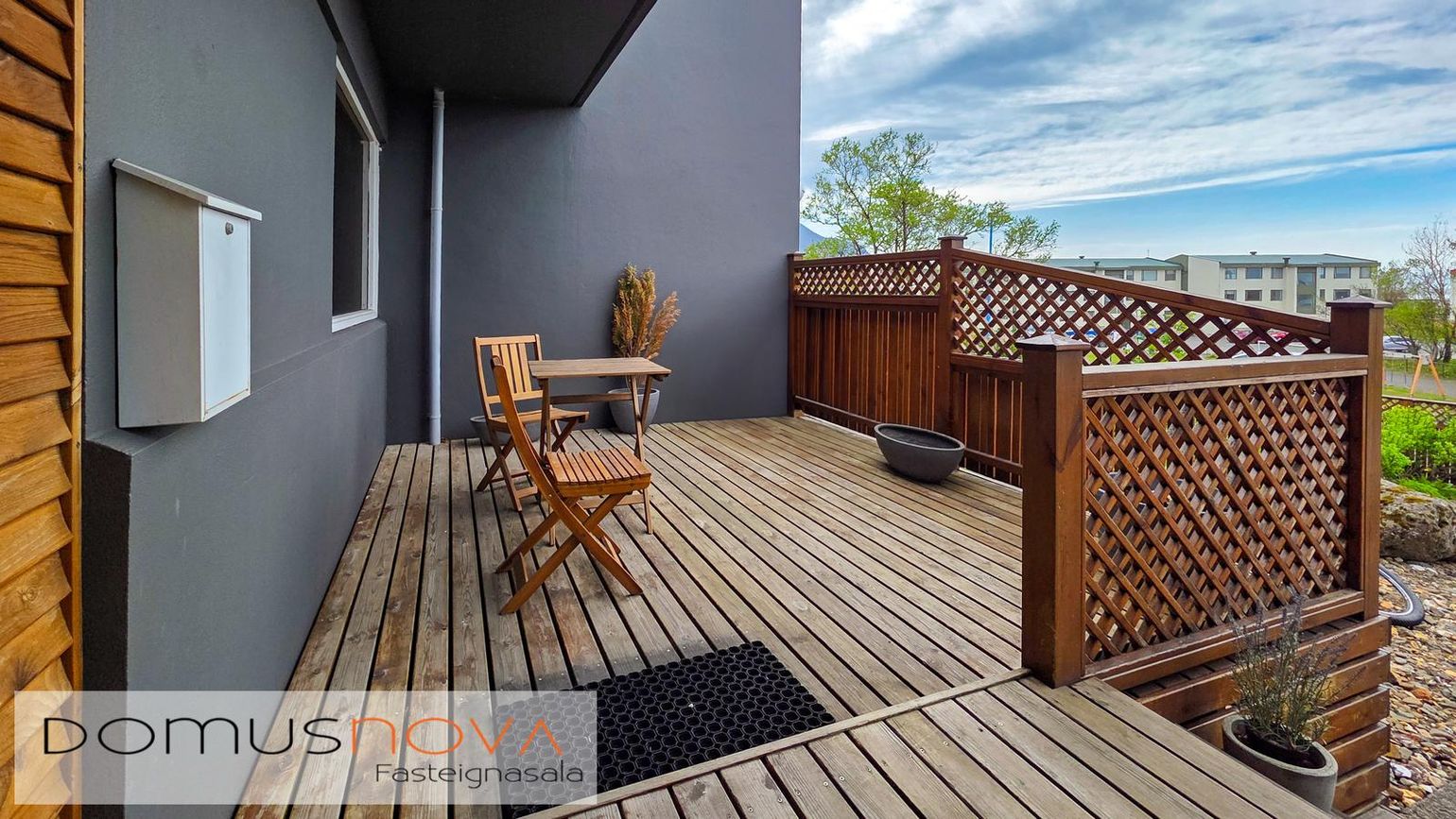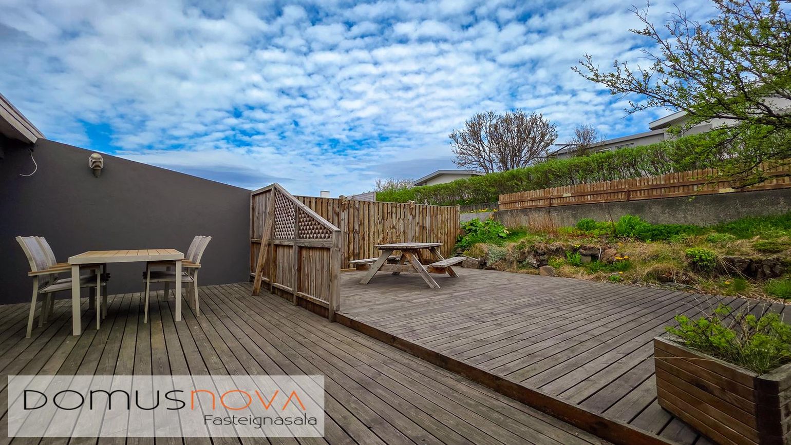 320 fm lóð með vel gróinni garði, timburveröld aftan á og tvö bílastæði fyrir framan.