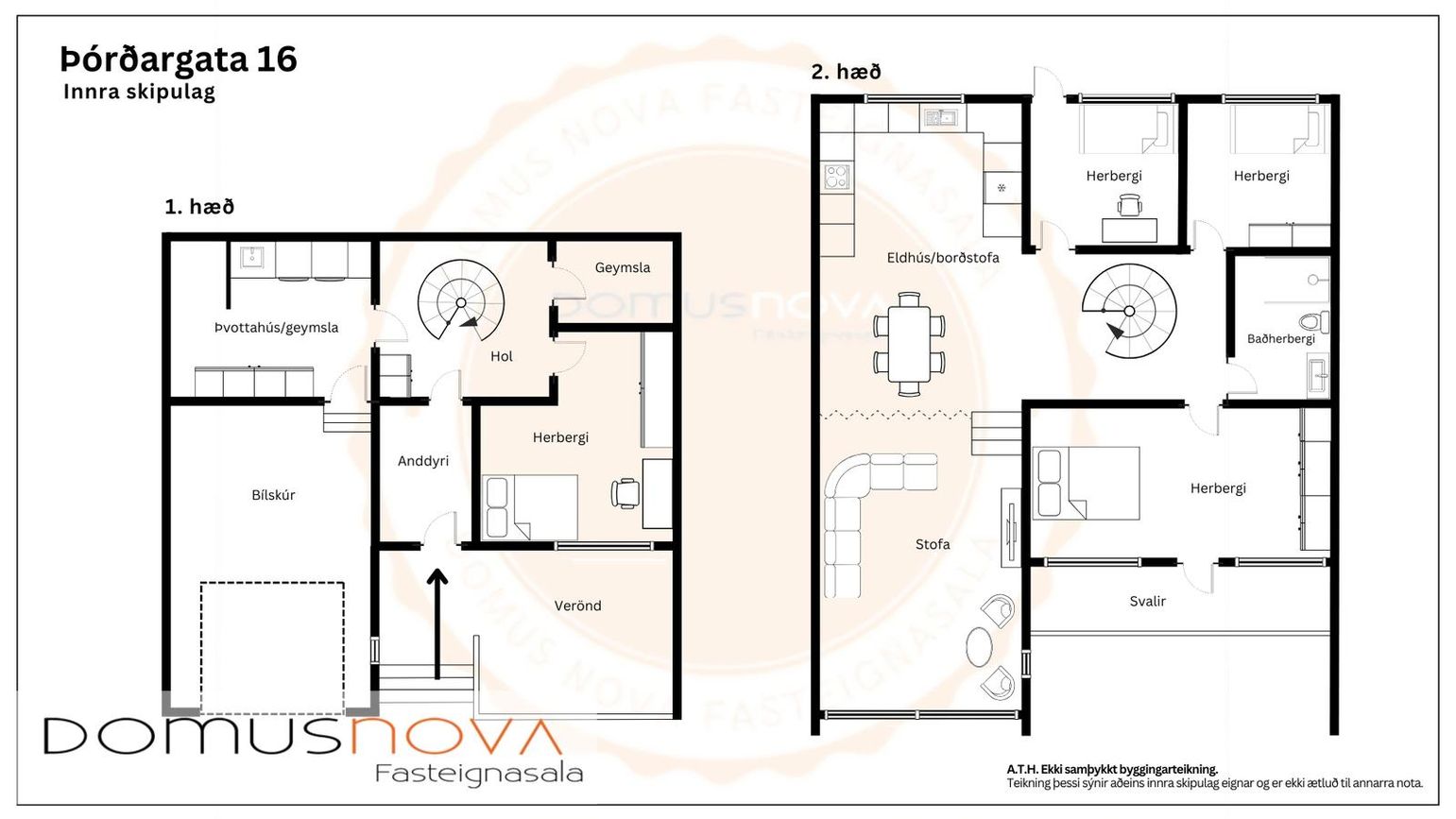 Steytt raðhús byggt 1973 með tveimur hæðum. Innihélt forstofu, hol, þrjú herbergi, baðherbergi, þvottahús og ókláraða geymslu/badhúsvíxlun. Opinn plan í efri hæð með stofu, borðstofu og eldhús.