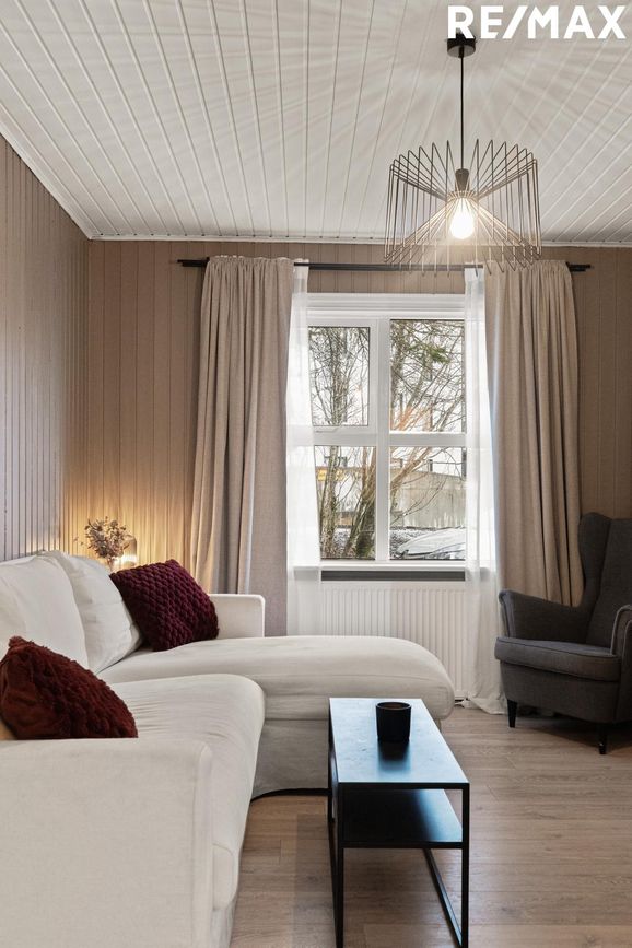 Stofa: Björt og rúmgóð með nýlegu harðparketi á gólfi.