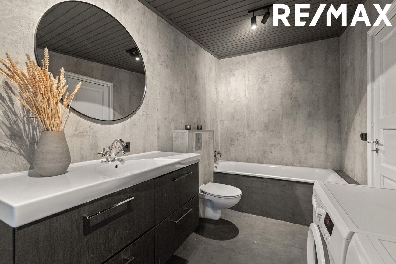 Baðherbergi: Er rúmgott með bæði sturtu og baðkari, upphengt salerni og snyrtilegri innrétting.