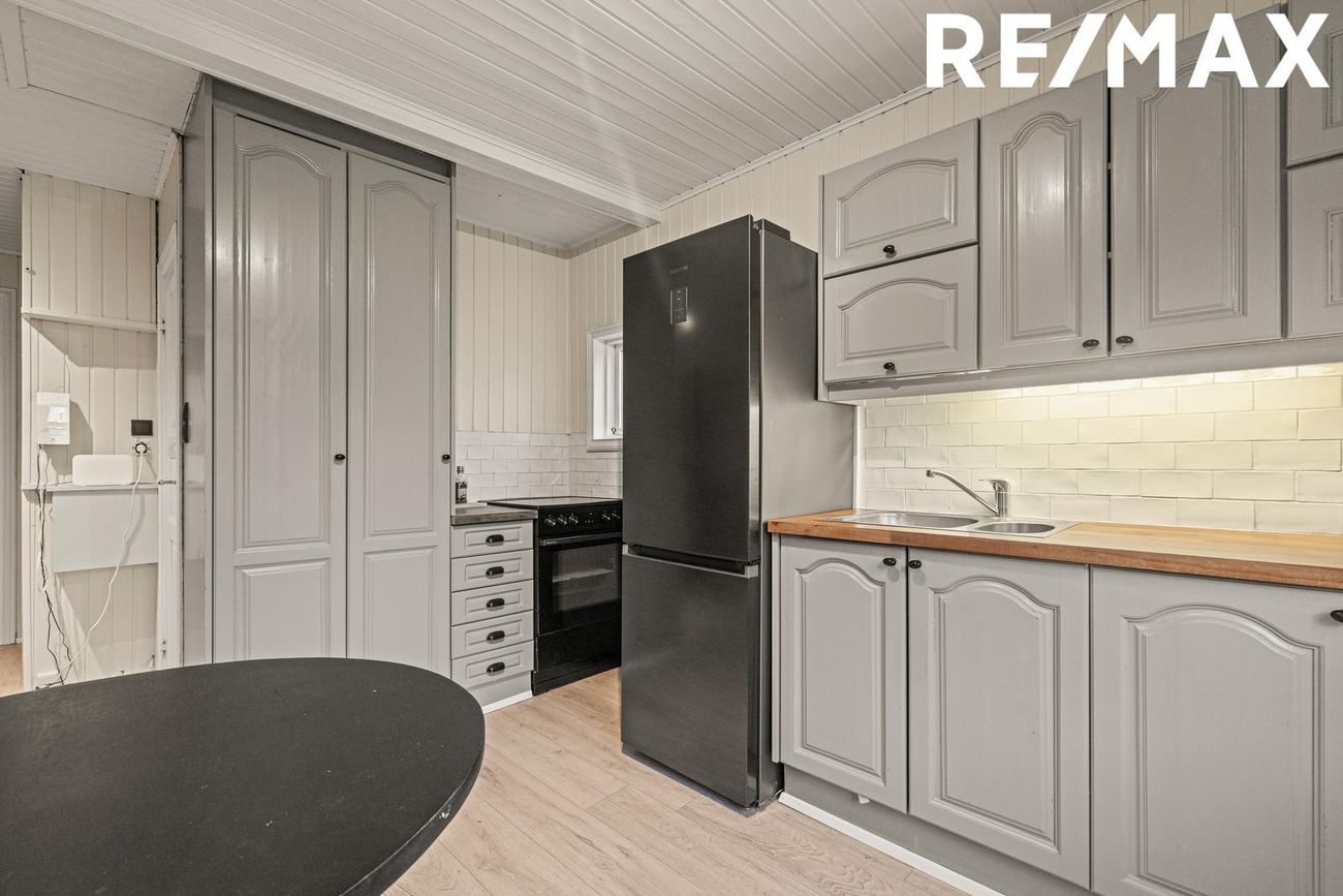 Eldhús: Snyrtileg grálökkuð innrétting, ofn og helluborð frá Hisense, frístandandi ísskápur og borðkrókur.