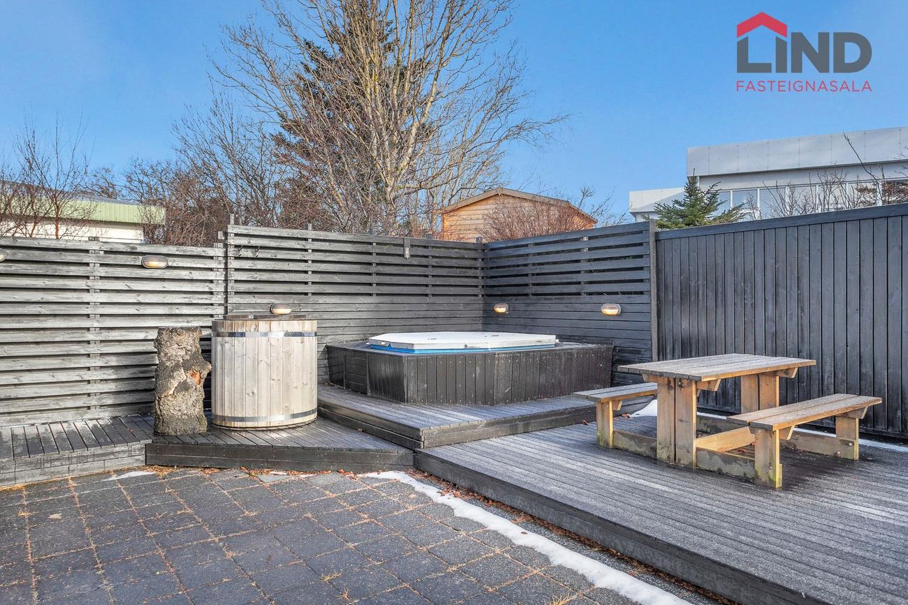Húsið stendur á 800 fm hornlóð sem er lokuð af allan hringinn.