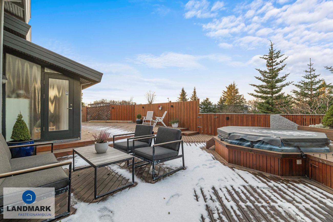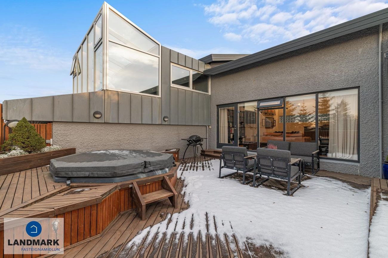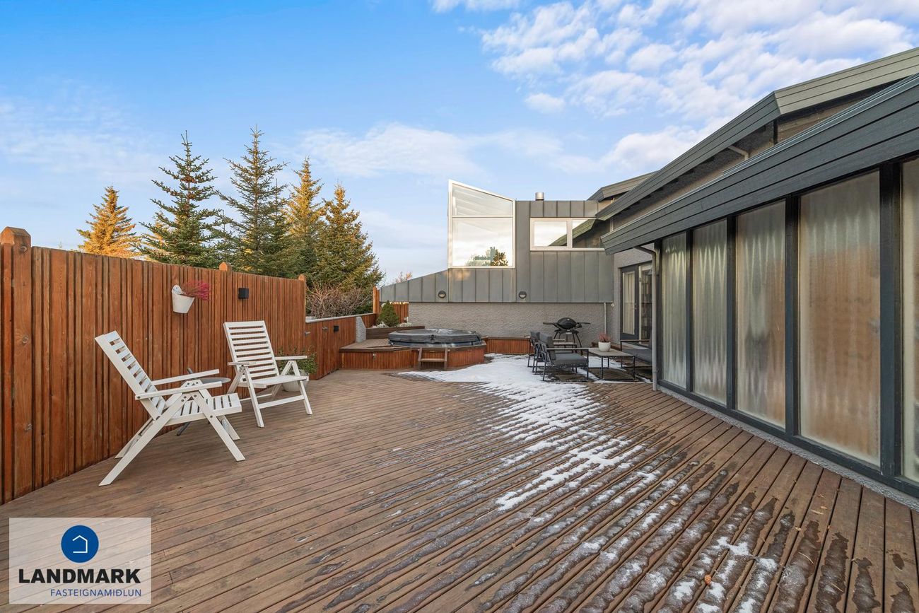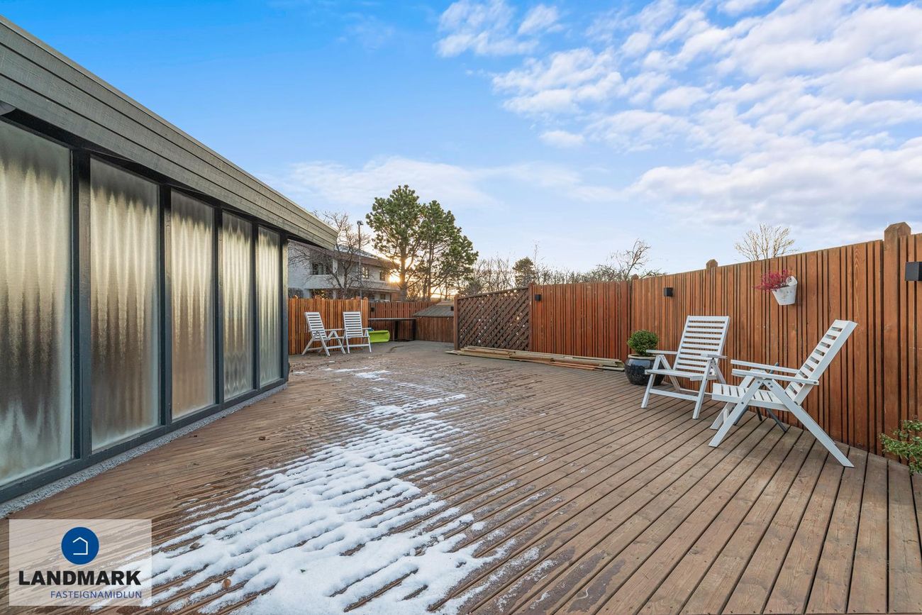 Parket, flísar, sprautulakkaðar innréttingar og timburverönd.