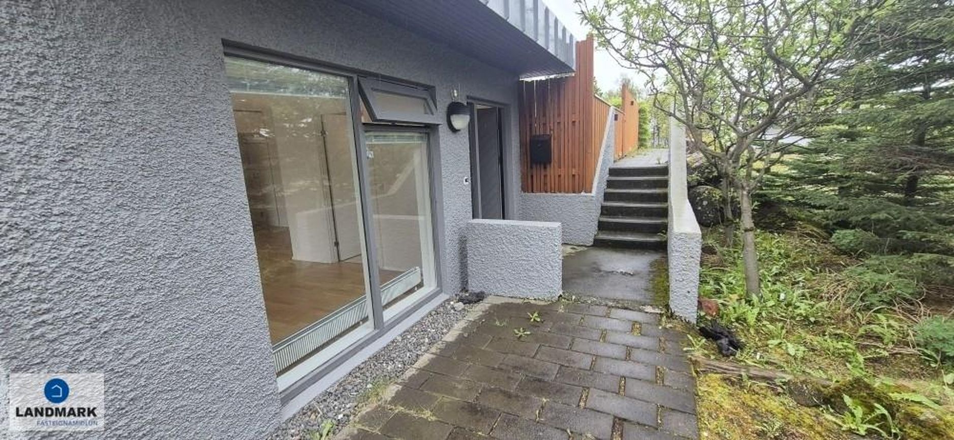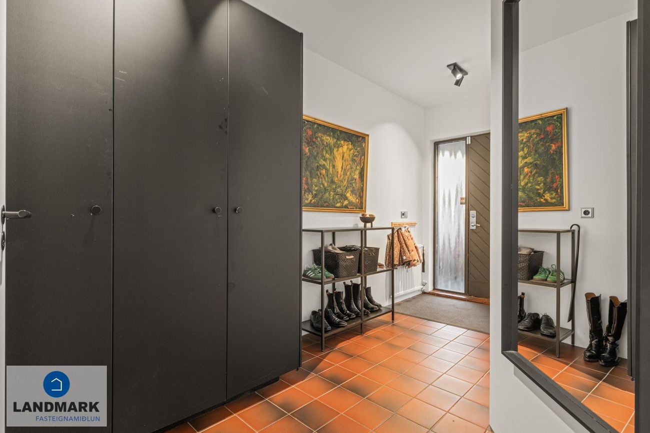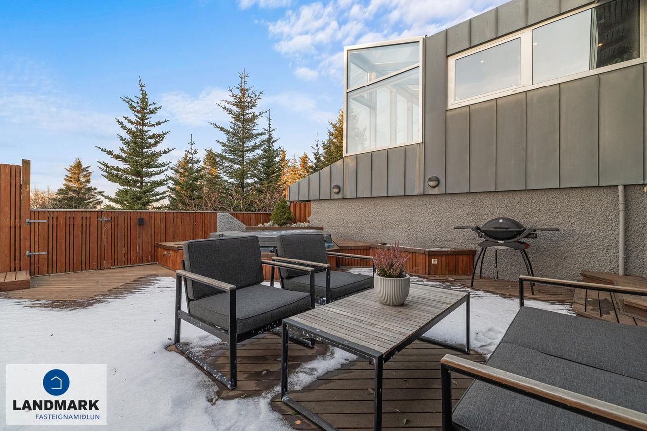 Parket, flísar, sprautulakkaðar innréttingar og timburverönd.