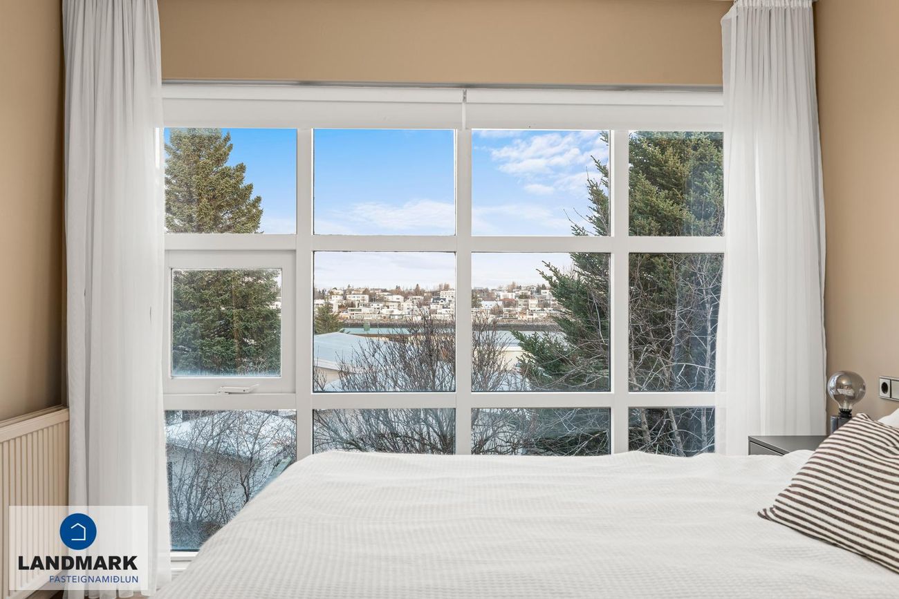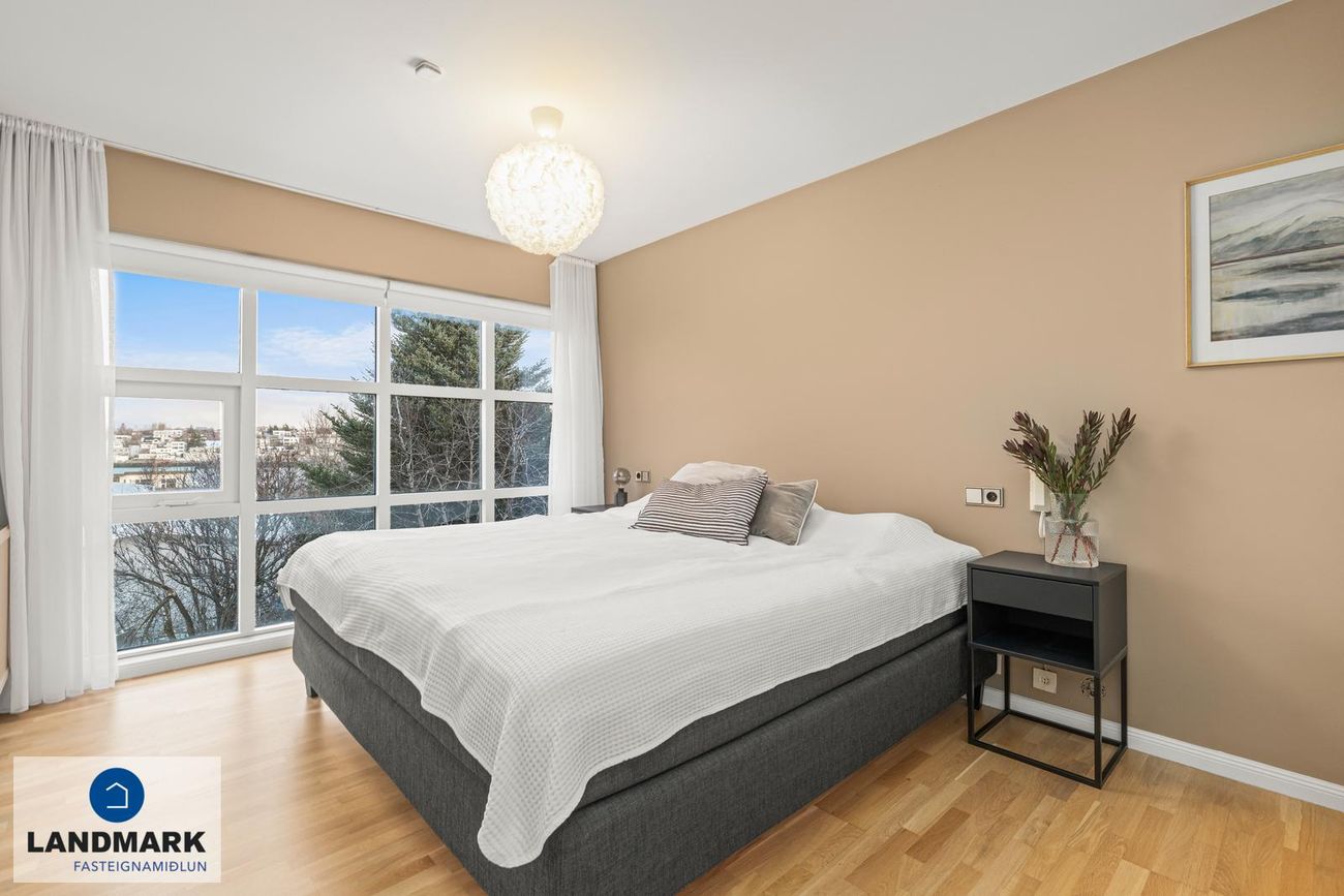 Hjónaherbergi með parketi, gólfsíðum gluggum og fataherbergi. Svefnherbergi í aukaíbúð með parketi og bjart rými.