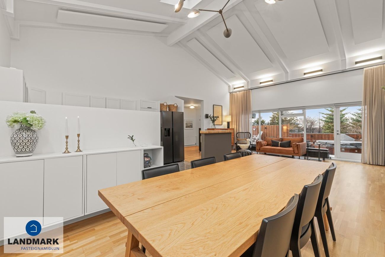 Borðstofa og stofa í sama rými með parketi, mikilli lofthæð og hljóðdempandi plötum. Útgengt á skjólsæla timburverönd í suðvestur/vestur.