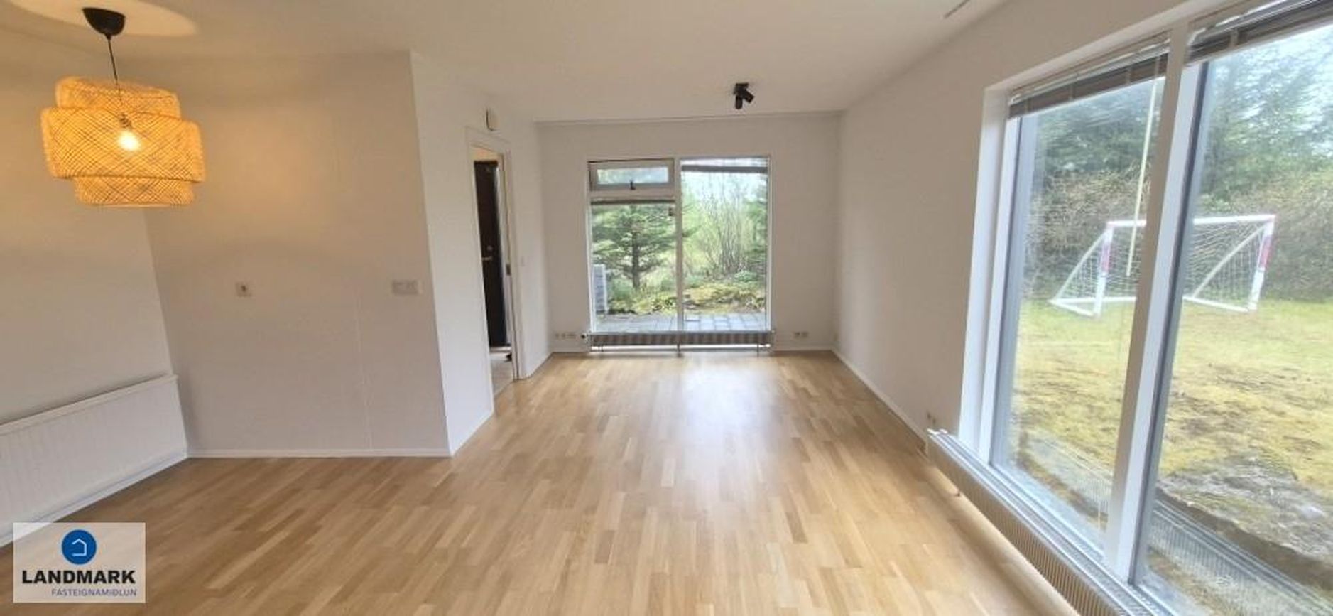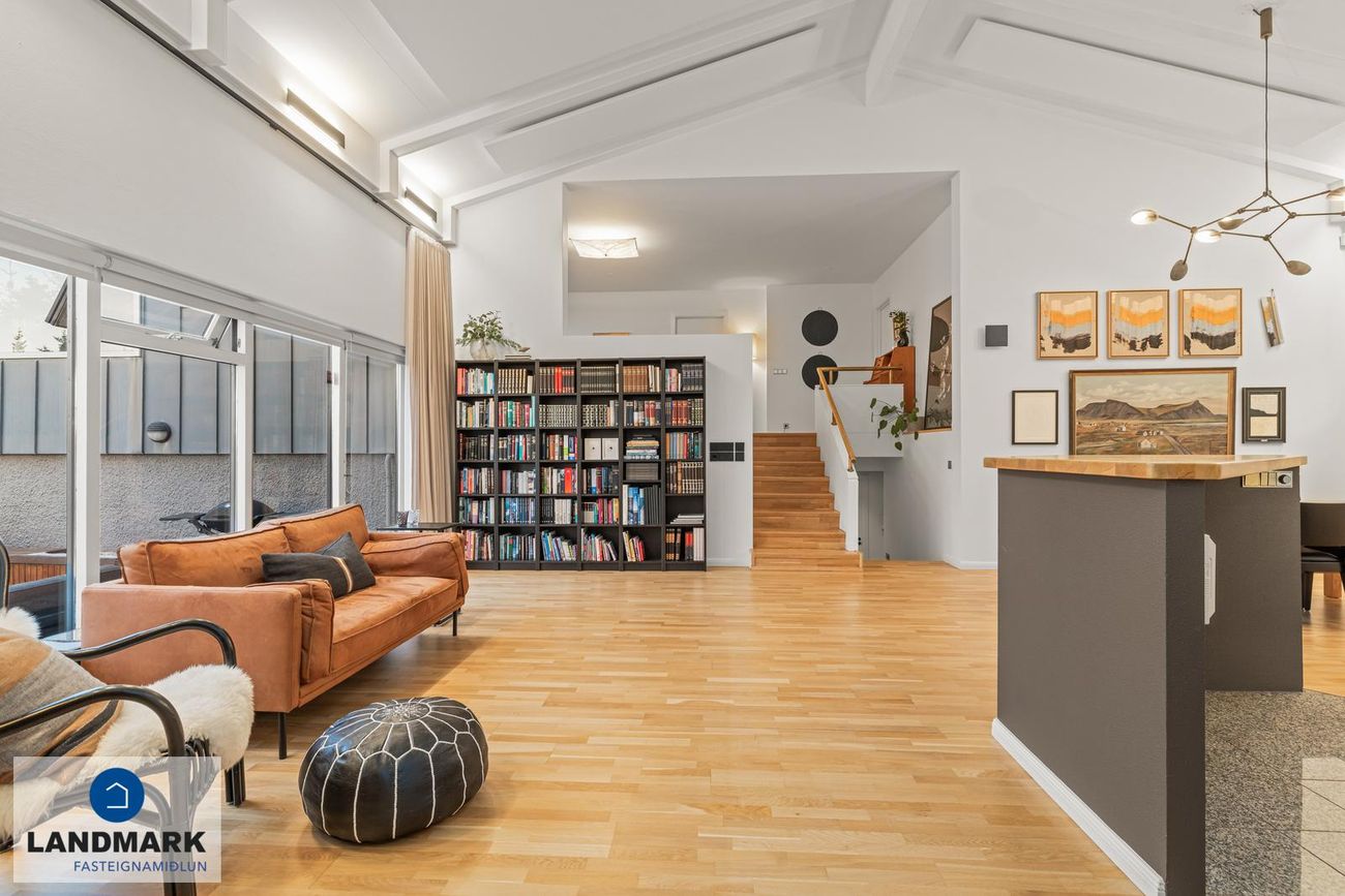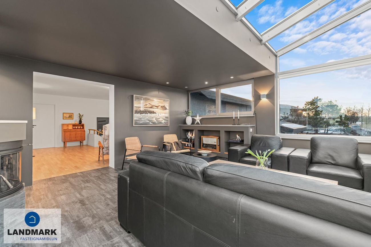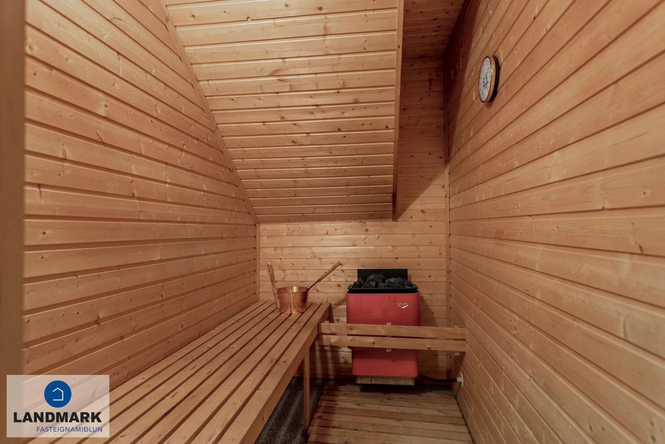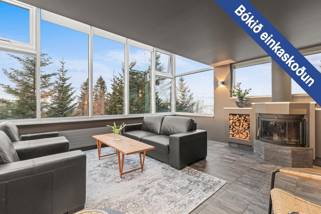 Arinstofa/sólskáli með flísum, stórum gluggum og arni. Saunaklefi á neðri hæð.