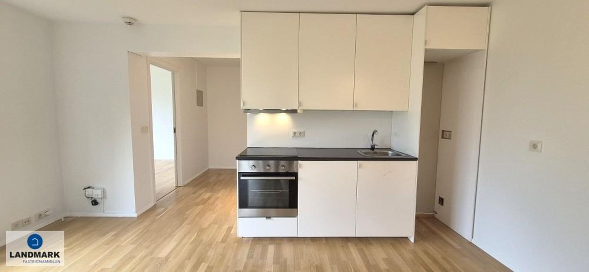 Sprautulakkað hvít innrétting með steini á borðum, flísum á gólfi og nýlegu spanhelluborði. Barborð tengt fyrir uppþvottavél.
