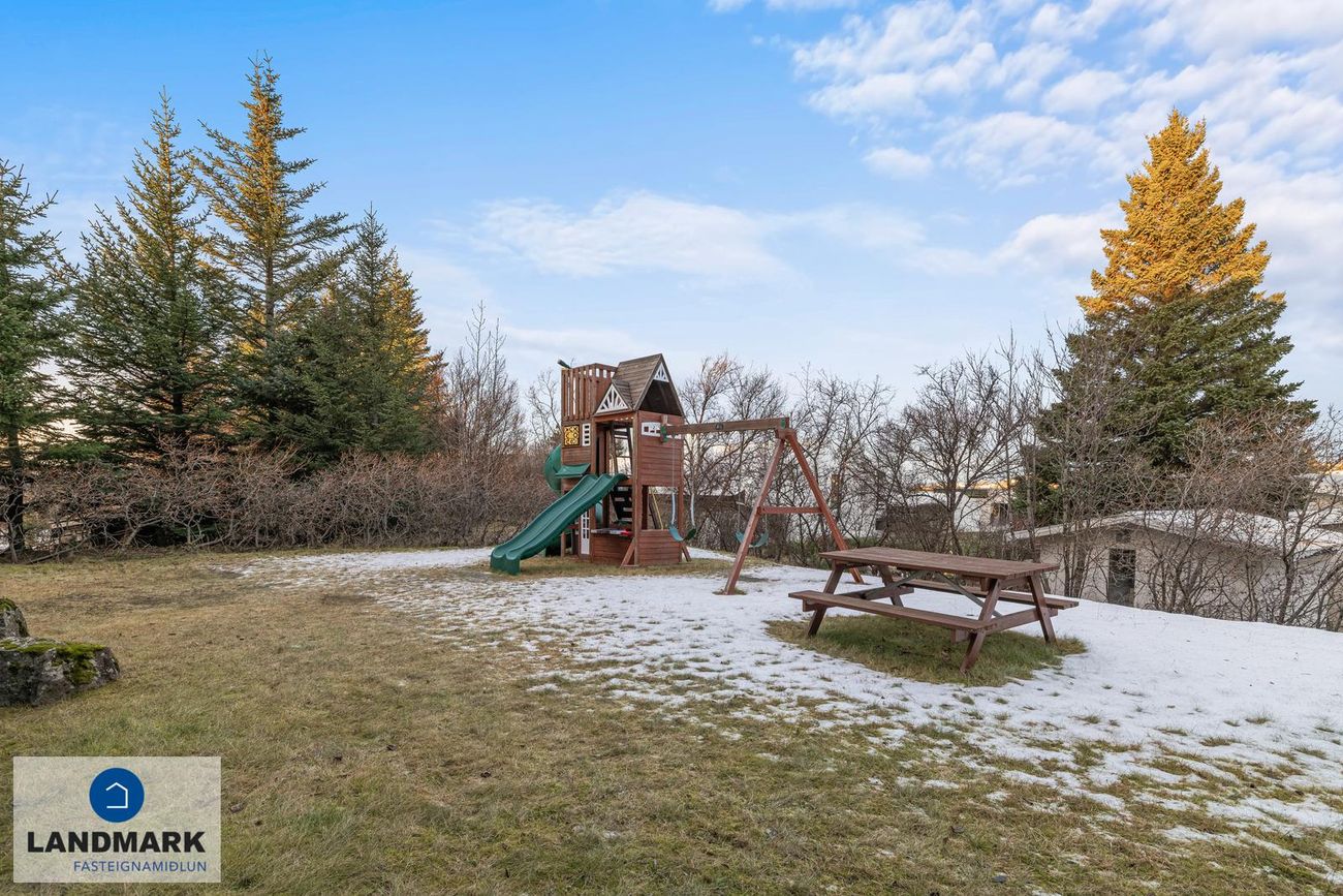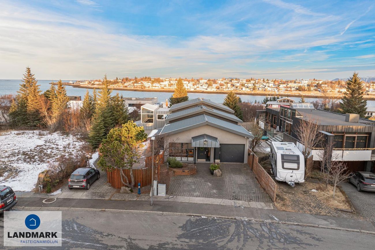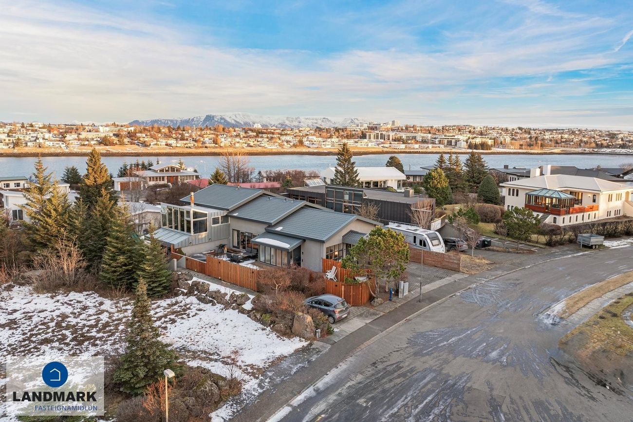Rólegt hverfi á Arnarnesinu í Garðabæ með náttúrulegu útsýni og nálægð við grænan garð.