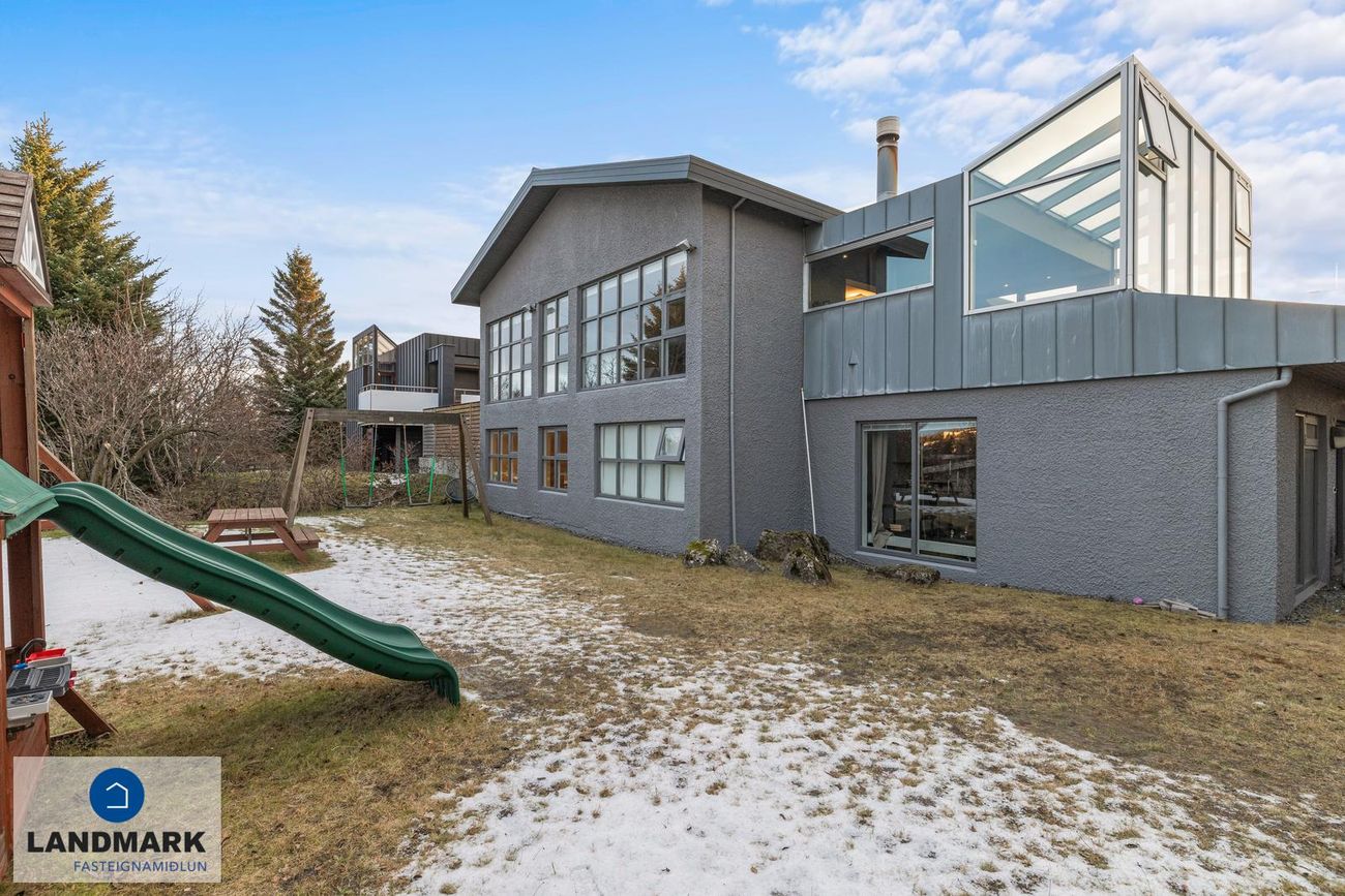 Hús með aukinni lofthæð, arinstofu, sjónvarpsstofu, hjónaherbergi með fataherbergi og baðherbergi, sólarstofa með arni og útsýni. Aukaíbúð með sérinngangi, opnu rými og baðherbergi.