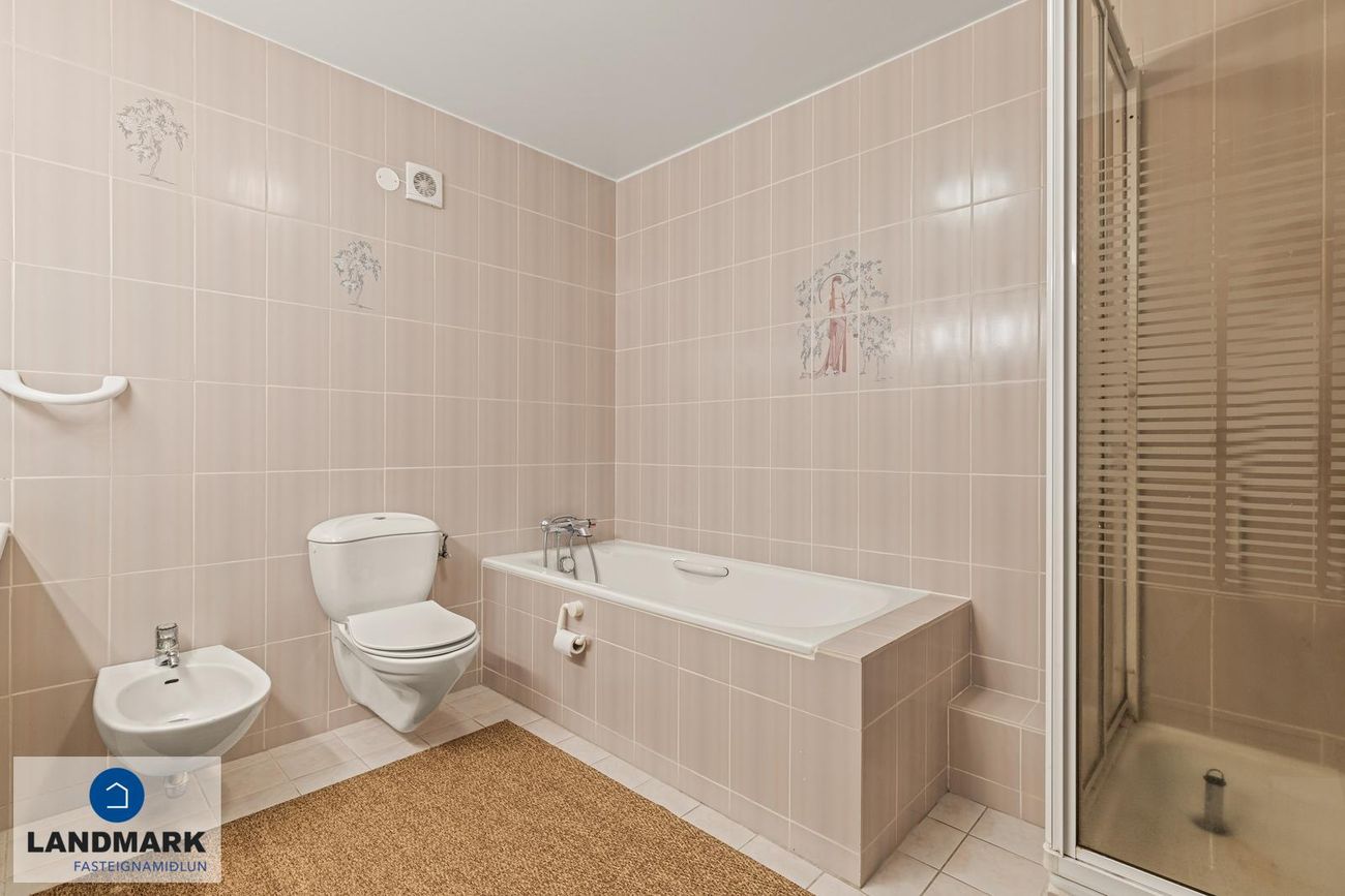 Baðherbergi með sturtuklefa, baðkari og stórri innréttingu. Gestasalerni flísalagt með innréttingu.