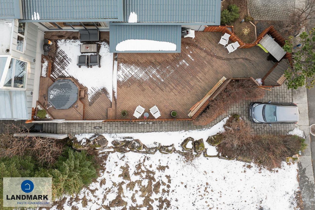 Bílskúr með rafdrifnum hurðaopnara og gönguhurð. Þrjú einkastæði með snjóbræðslu og hleðslustöð.