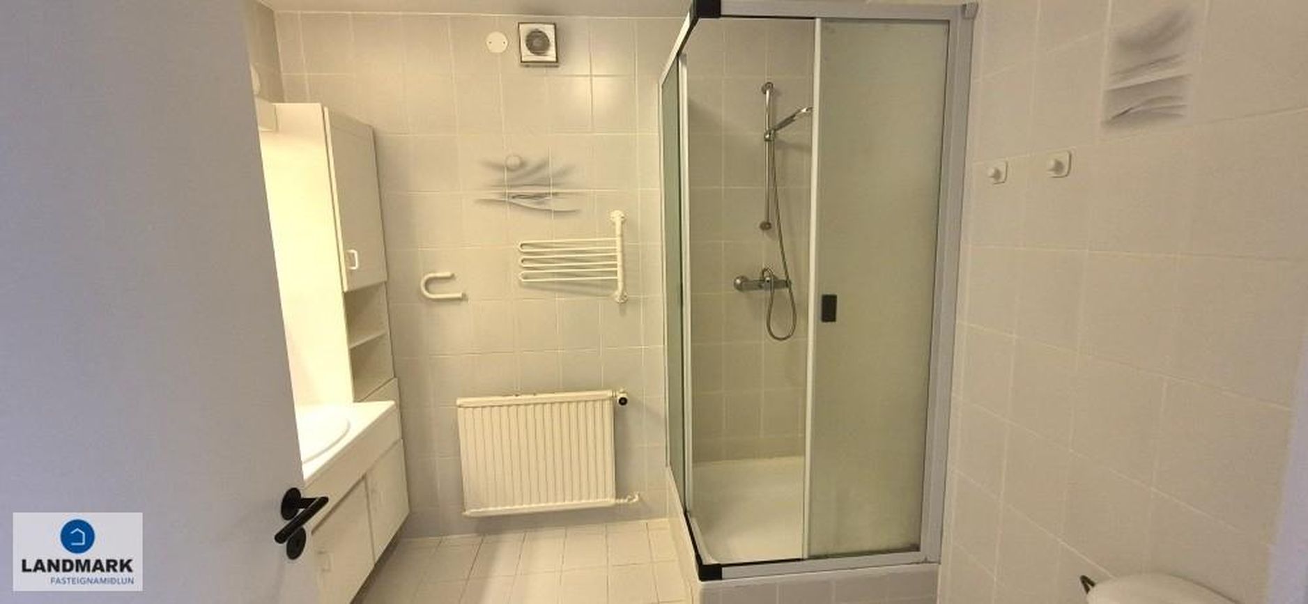 Stórt þvottahús með góðri loftræstingu, nýlegri sturtu og tengi fyrir þvottavél og þurrkara.