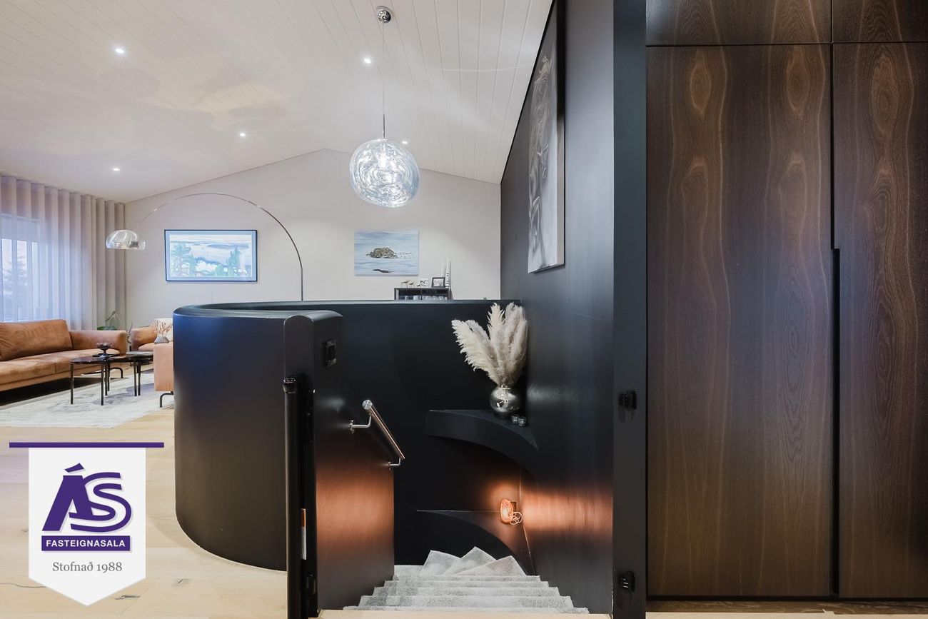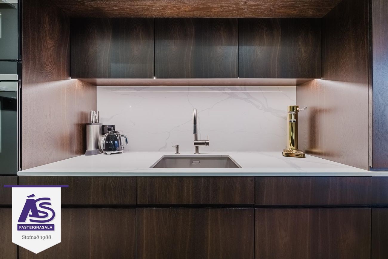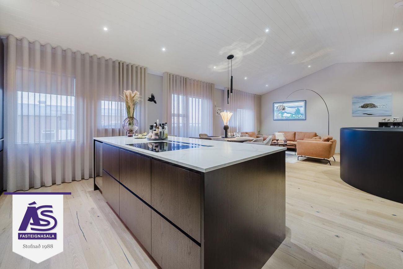 Opið eldhús með nýlegri sérsmíðuðu innréttingu (reykt eik), parketgólf, eyja, stæði fyrir uppþvottavél, tvöfaldan ísskáp og búrskápur. Tveir ofnar (gufuofn og venjulegur/örbylgju), háfur í borðplötu, vínkælir, steinskápur úr kvarsi, Grohe blöndunartæki, tækjaskápur með innbyggðri lýsingu.
