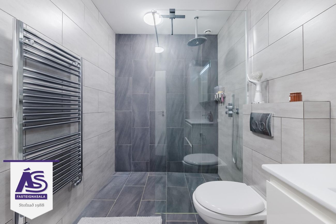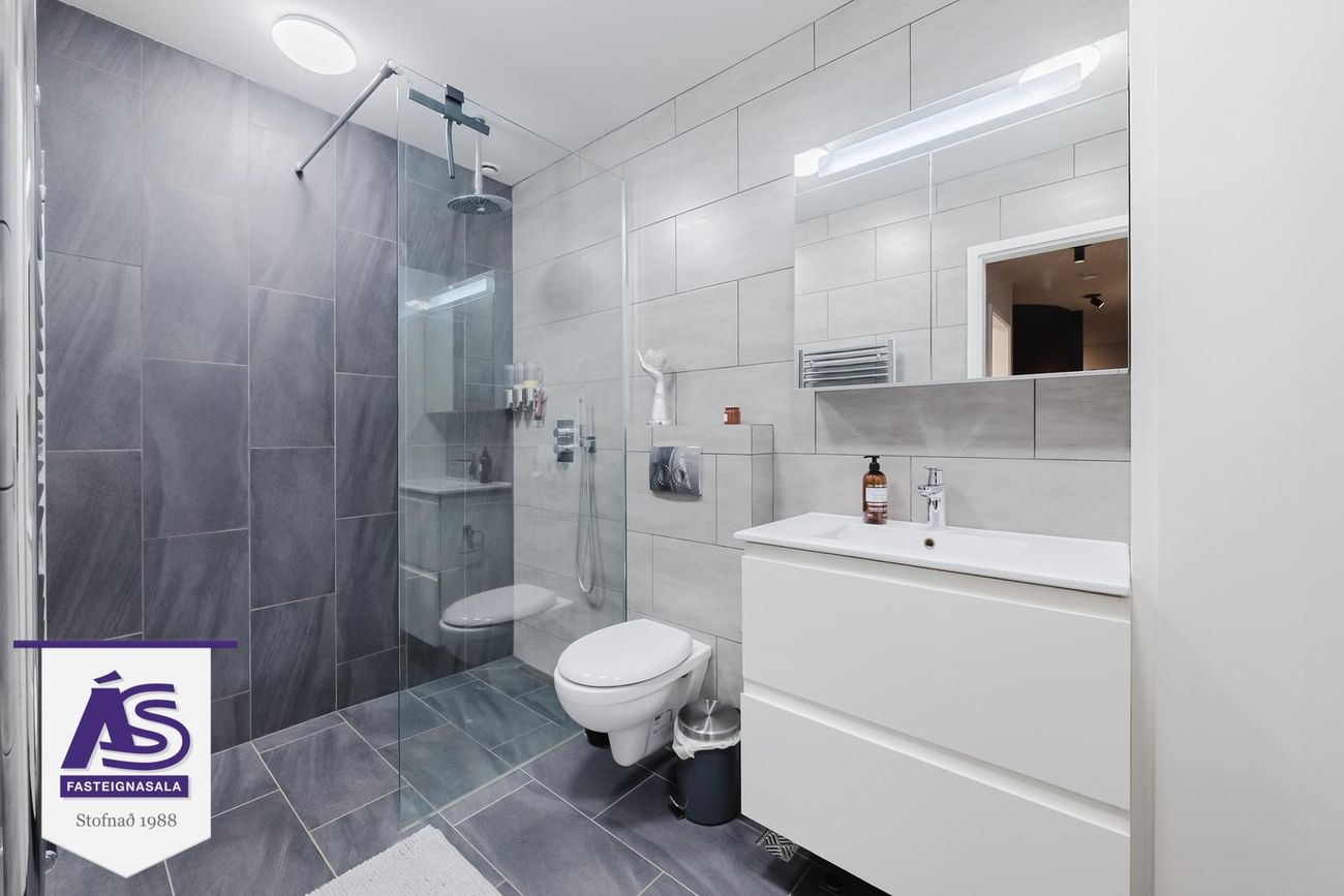 Efri hæð: Baðherbergi með flísum á gólfi og vegg að hluta, innrétting, sturta. Neðri hæð: Baðherbergi með flísum á gólfi og vegg, innrétting, sturta, gólfhiti.