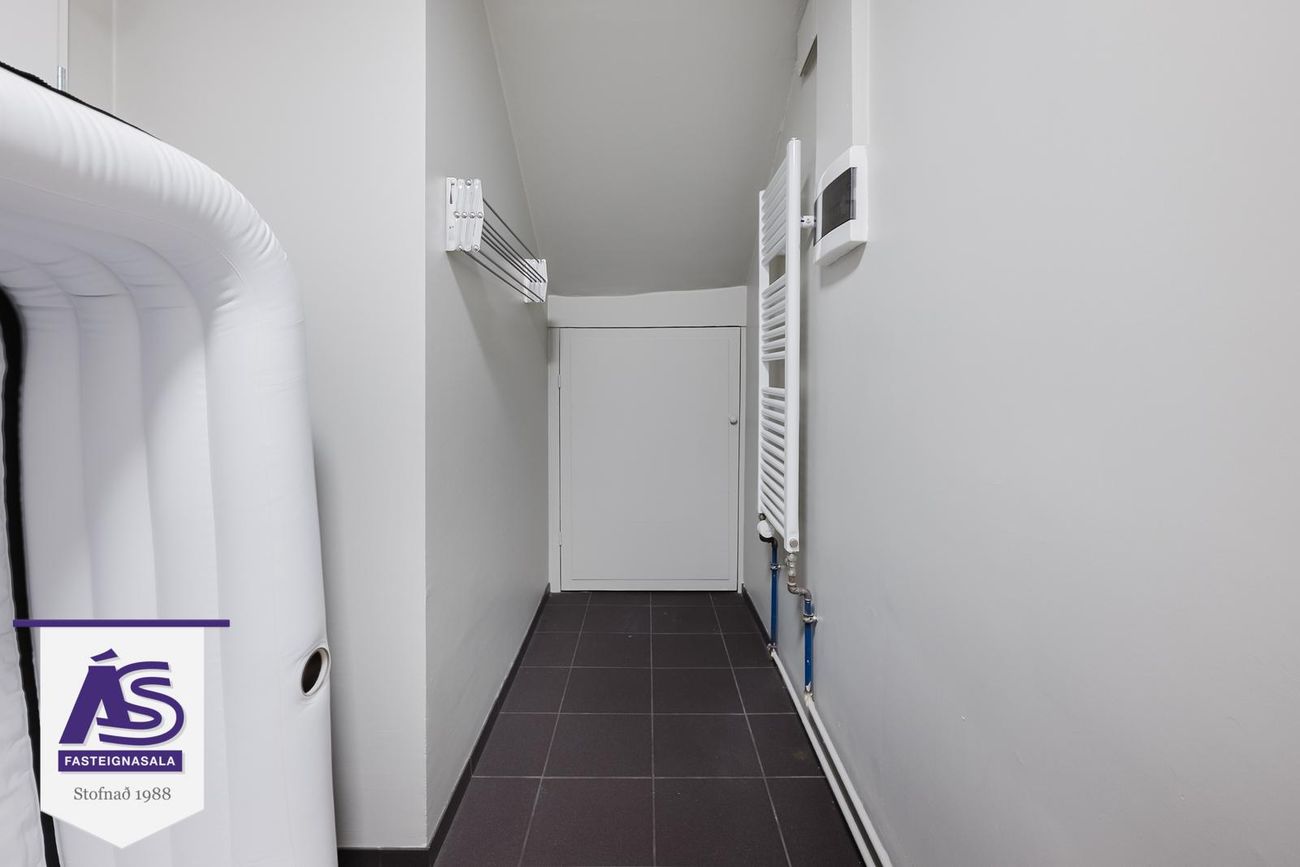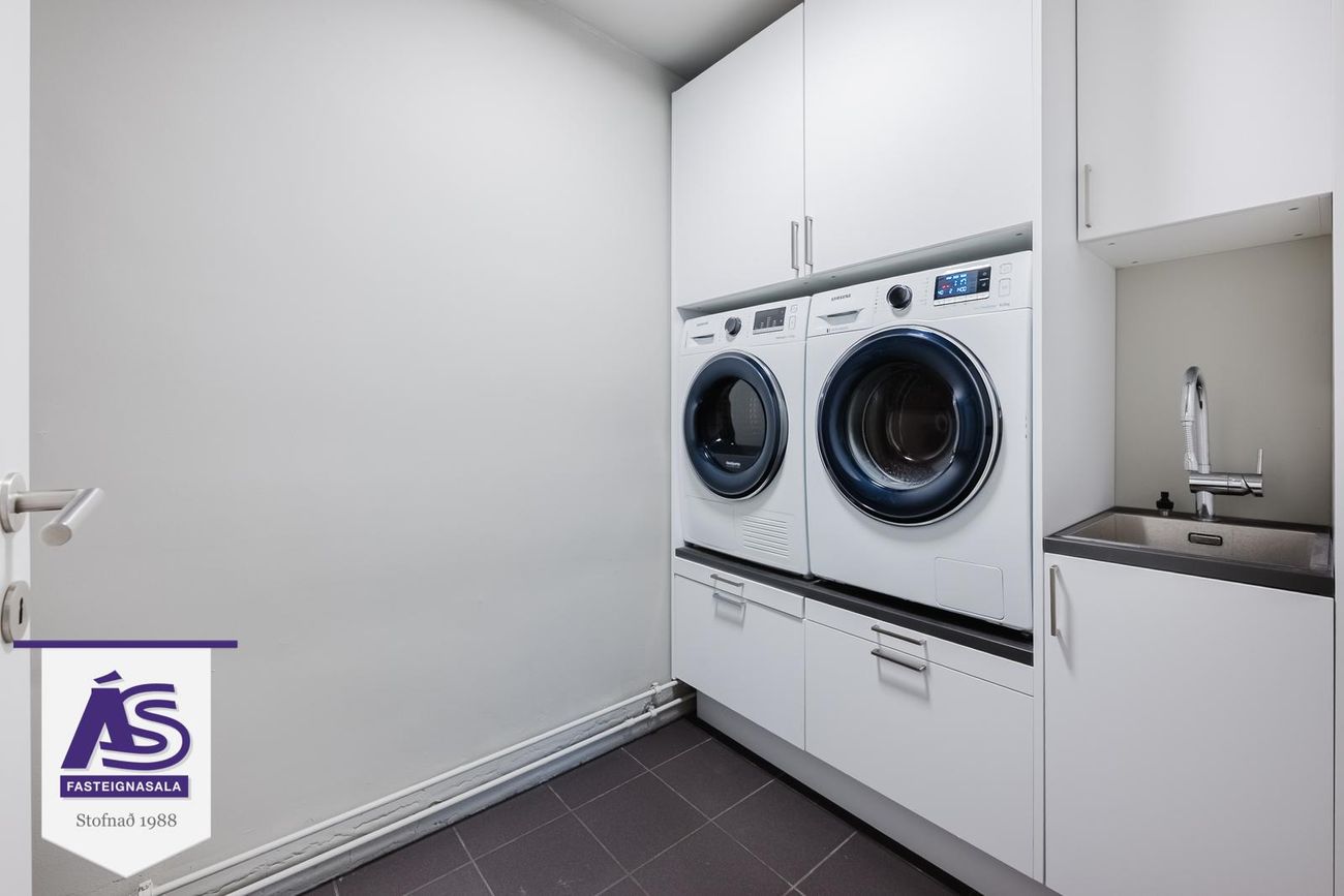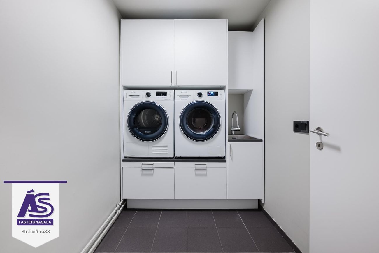 Þvottahús með flisum á gólfi, innrétting. Inni í þvottahúsi er geymsla undir stiganum.