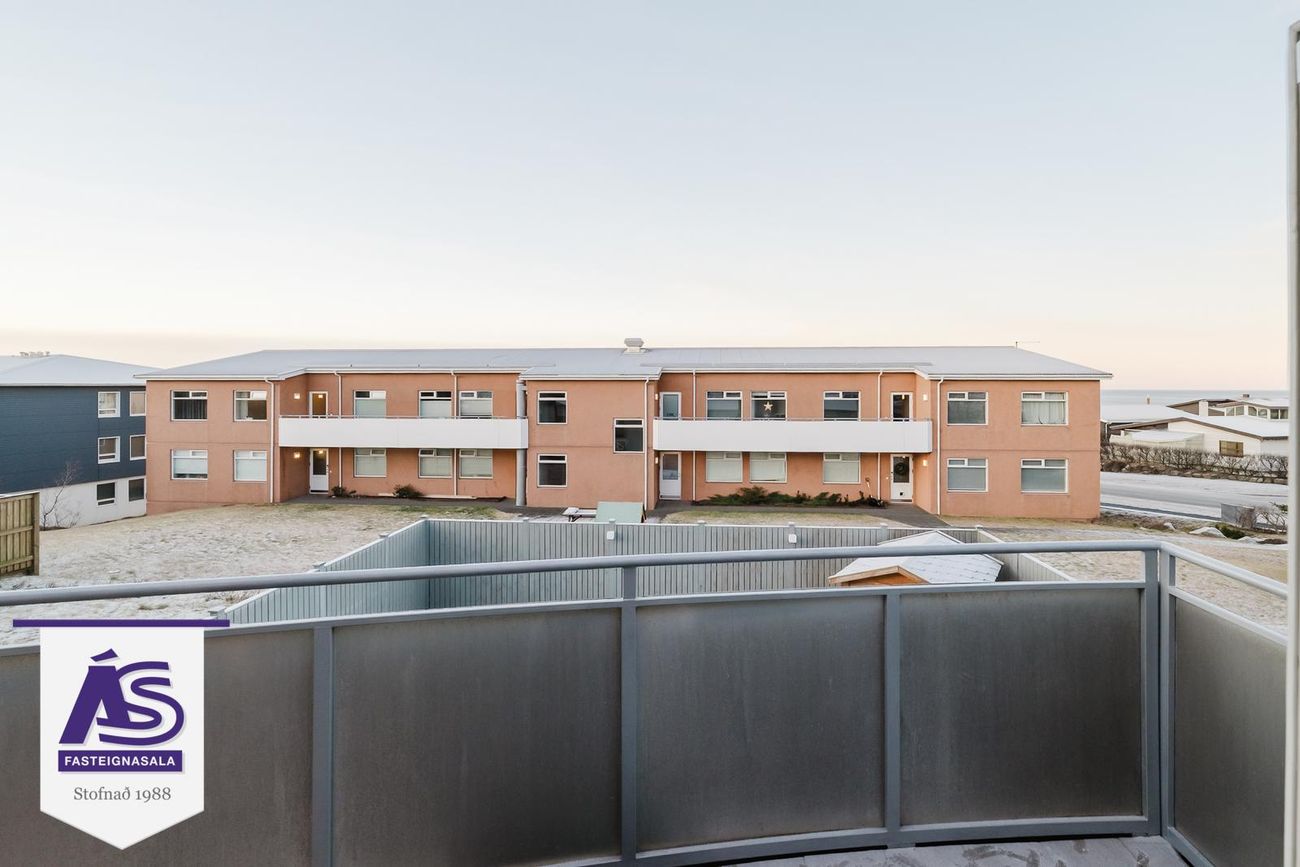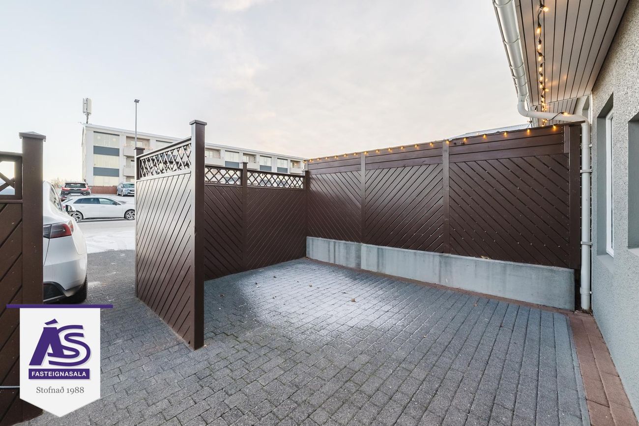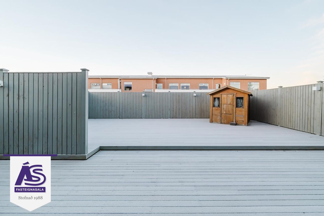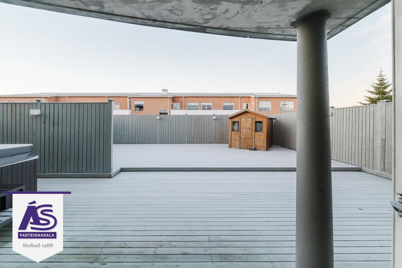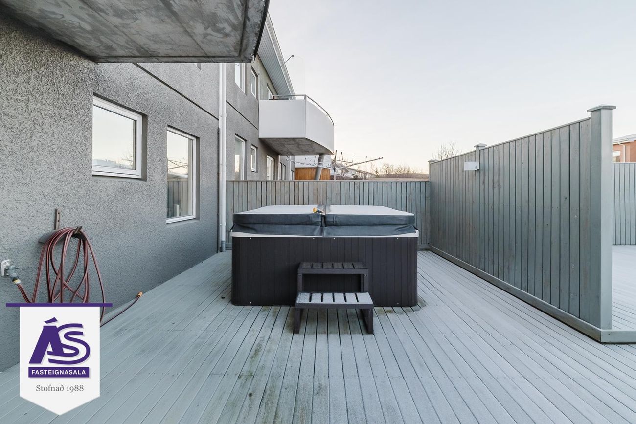 Rúmgóðar svalir í suðvesturátt frá stofu/borðstofu. Verönd með skjólveggjum og heitum potti frá neðri hæð.