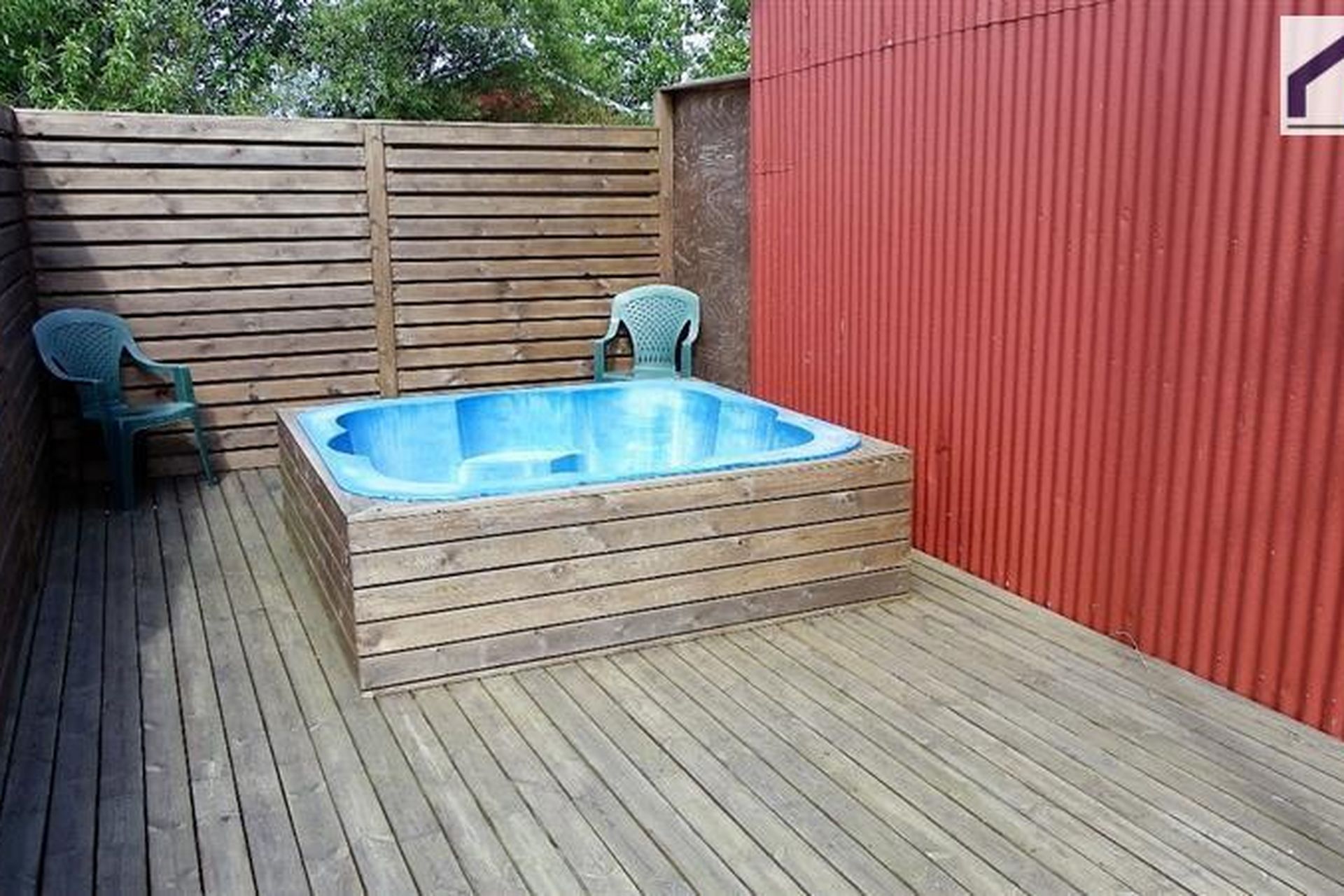 Aflokuð viðarverönd vesturátt með heitum potti.